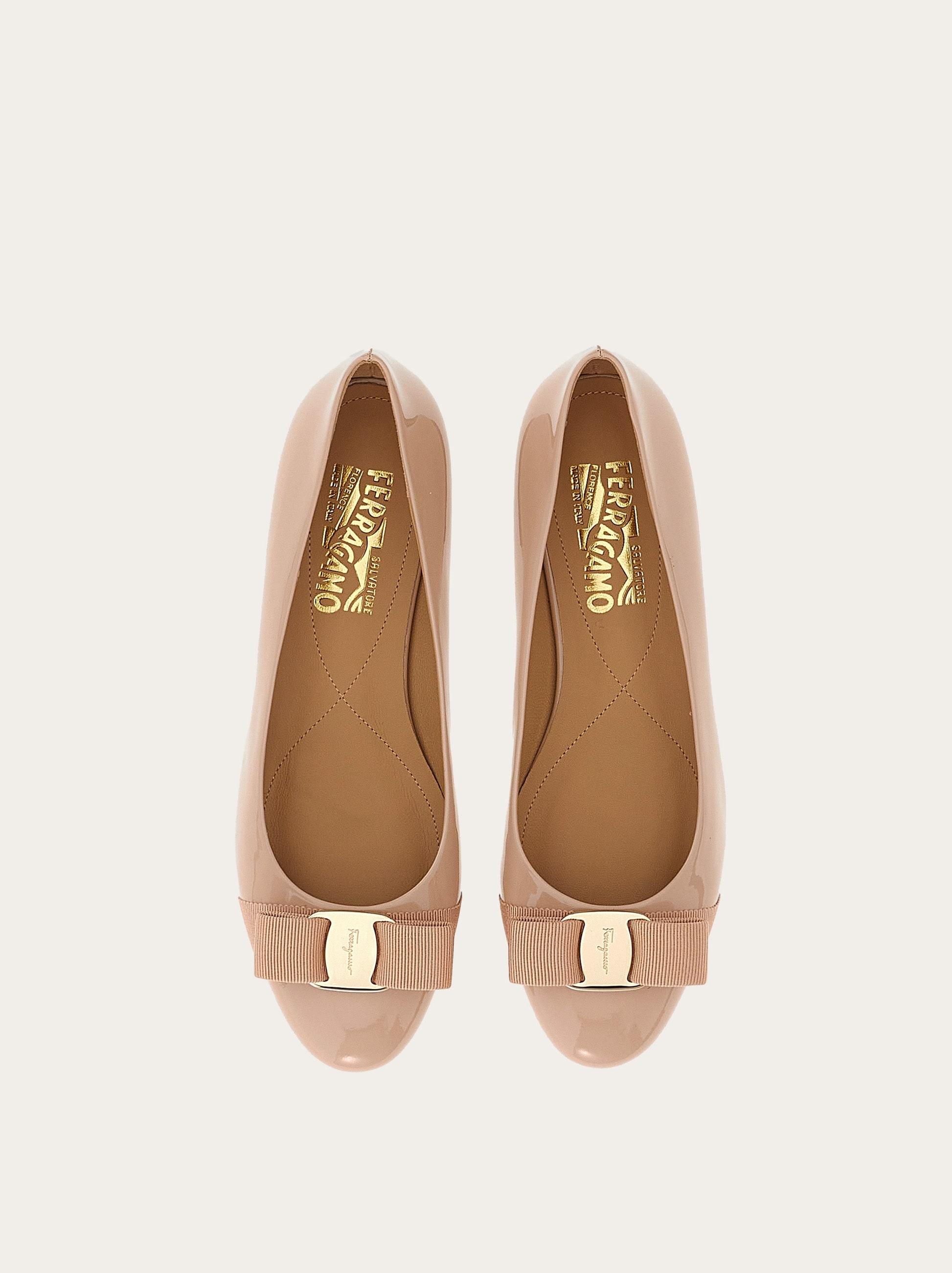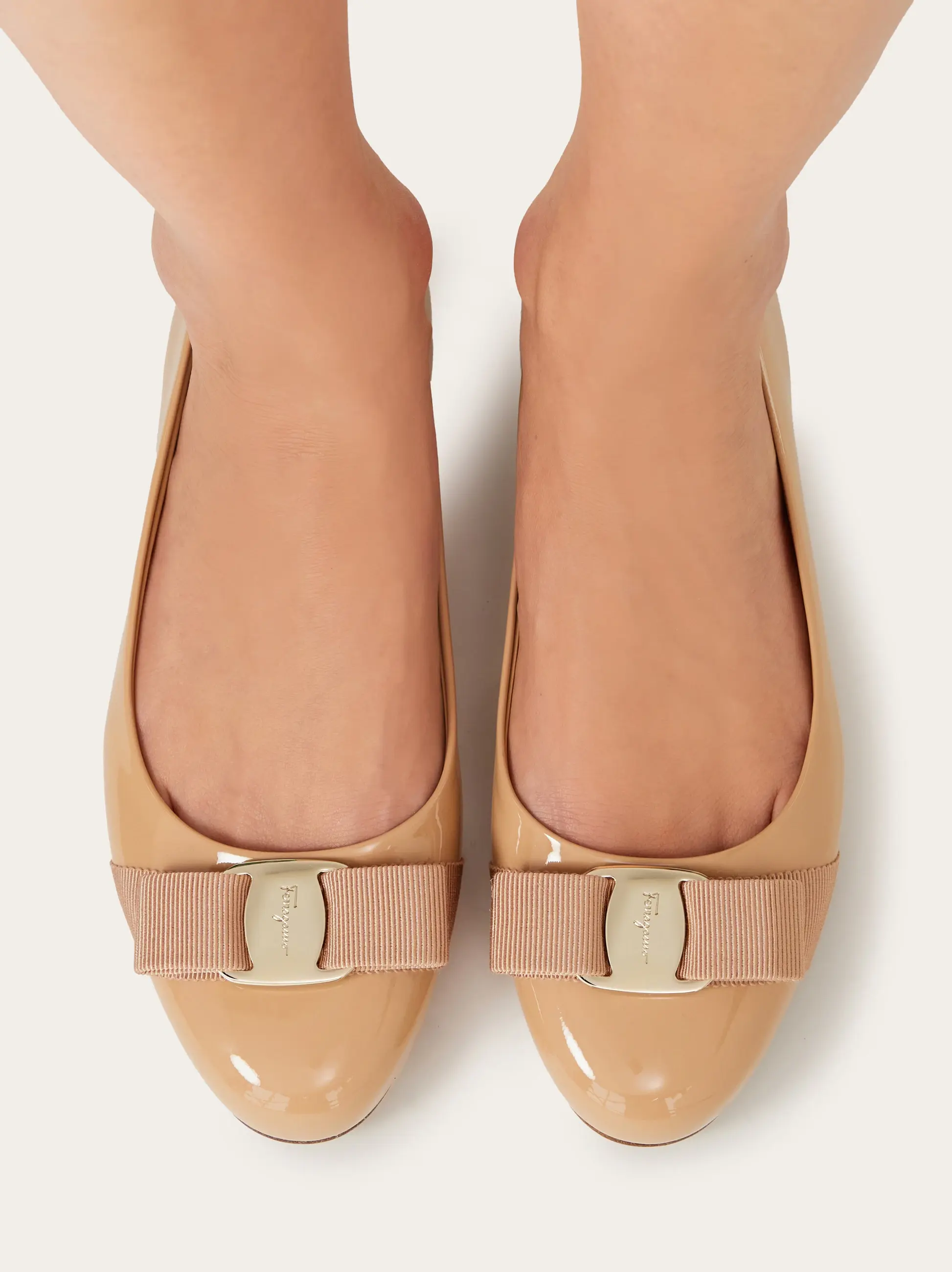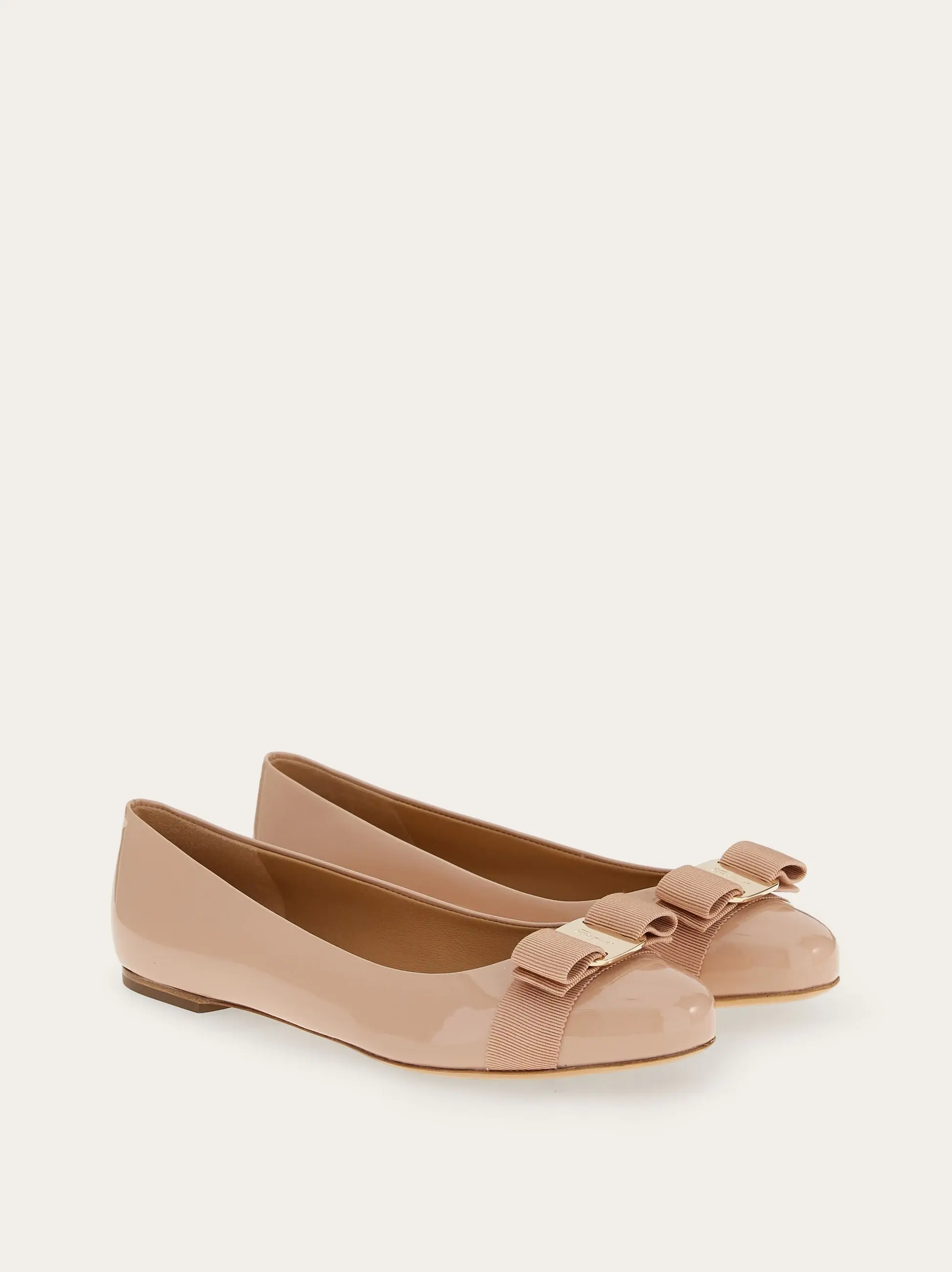 A glammed up version of the refined ballet flat in smooth patent leather. The beautiful shade of oxford blue makes this the perfect shoe to add a splash of color to any look. The Vara grosgrain bow with golden metal plate and engraved logo decorates the rounded tip.