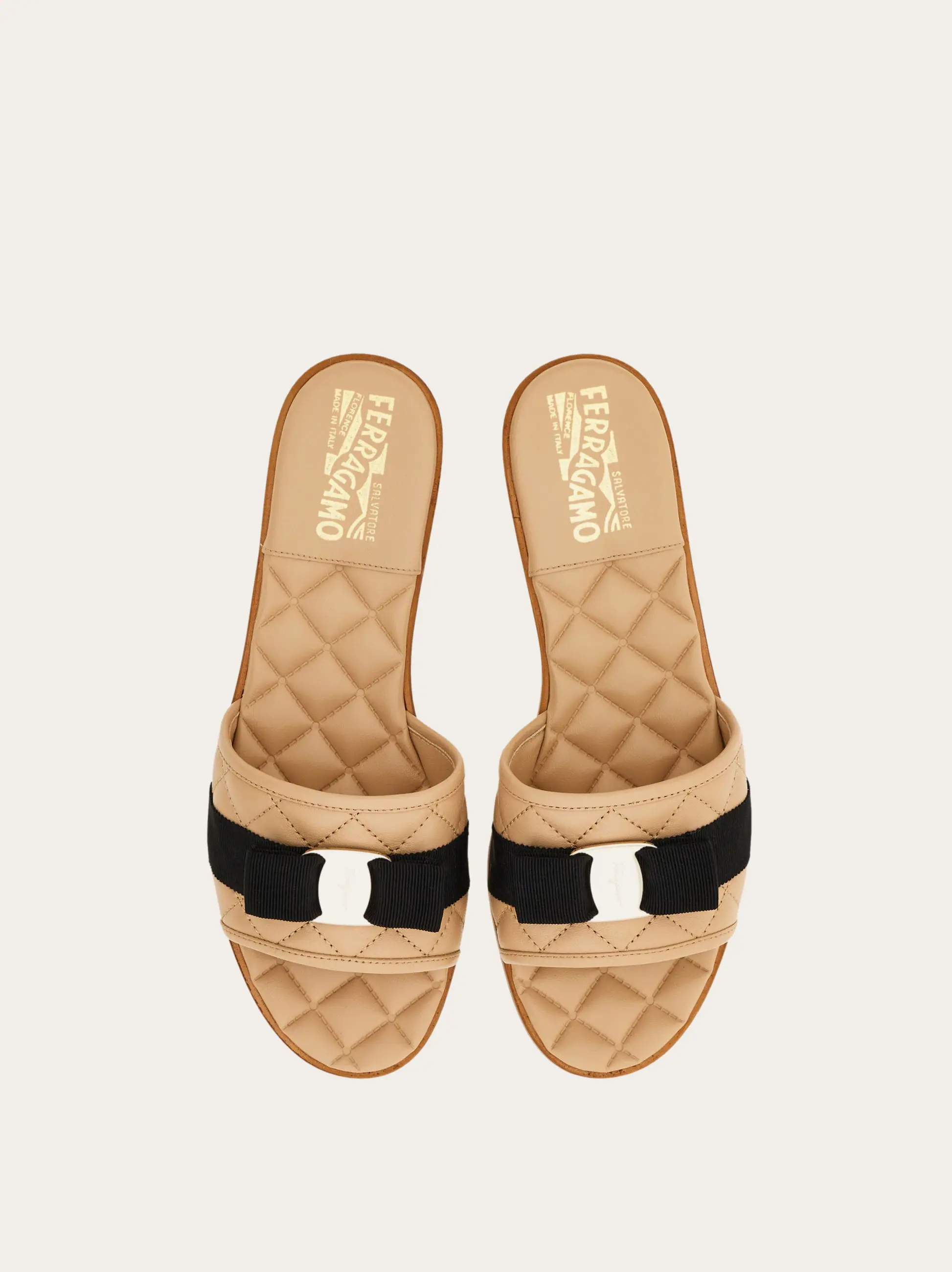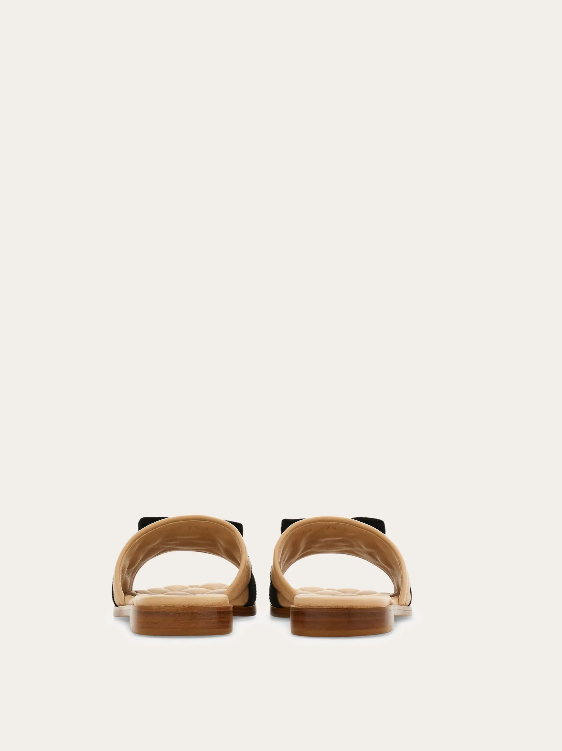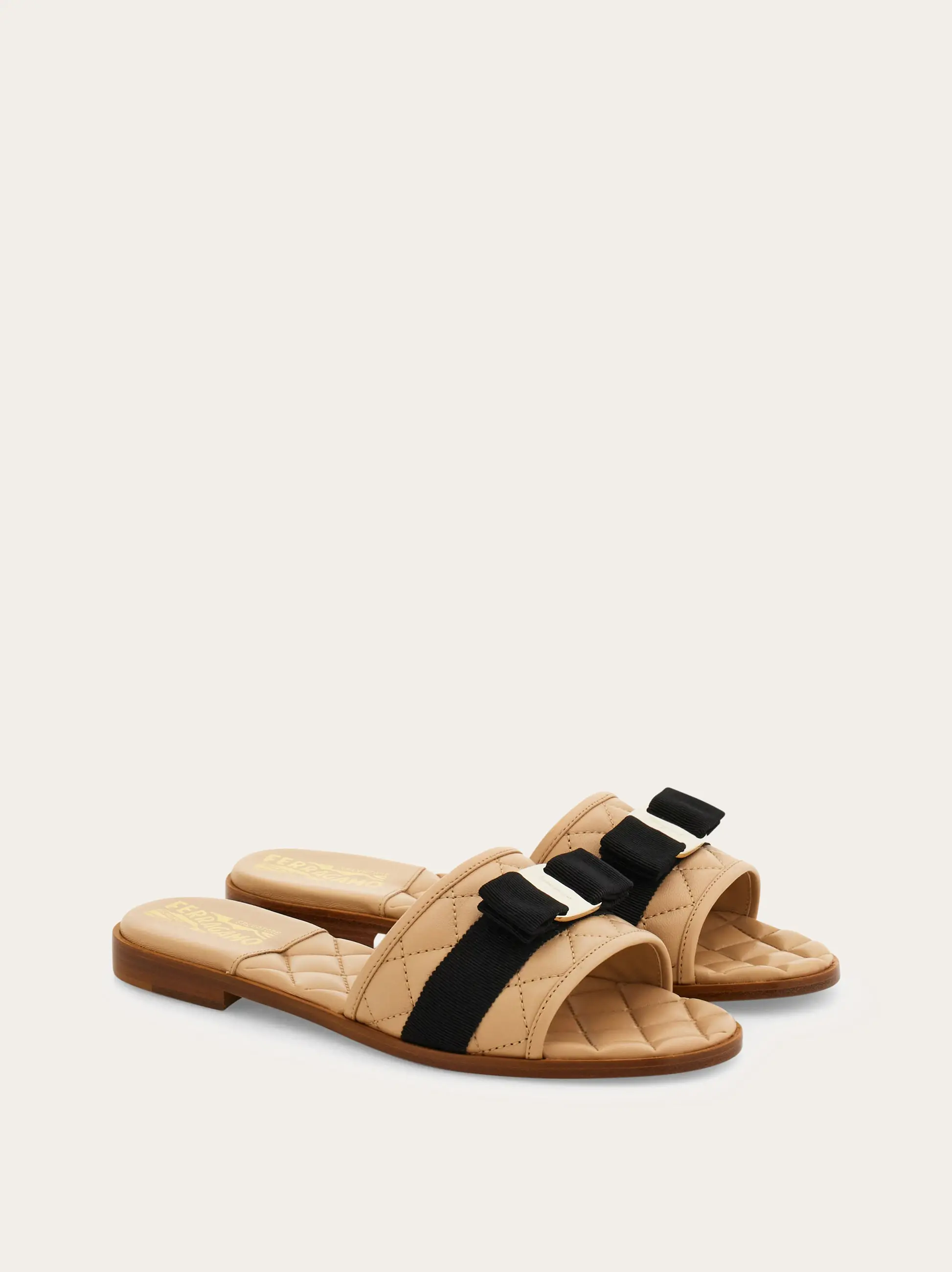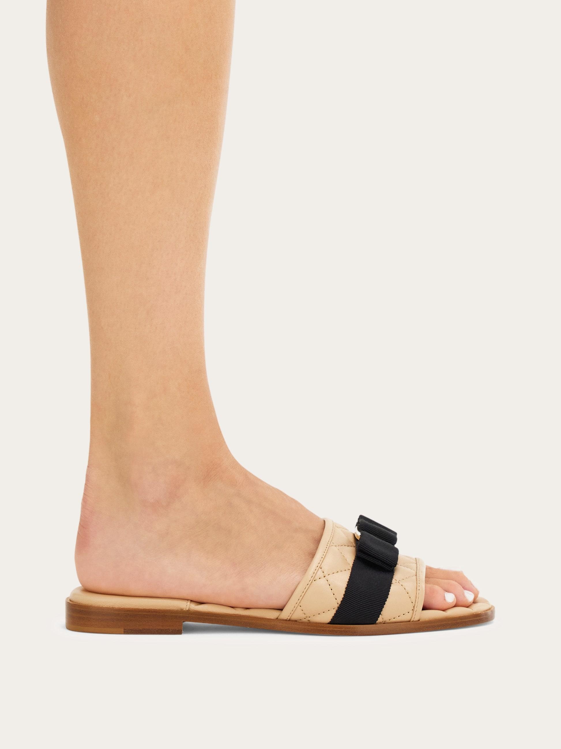 Soft nappa lambskin sliders with padded-effect geometric quilting. Wide strap over the toes with the Vara bow and gros-grain ribbon.