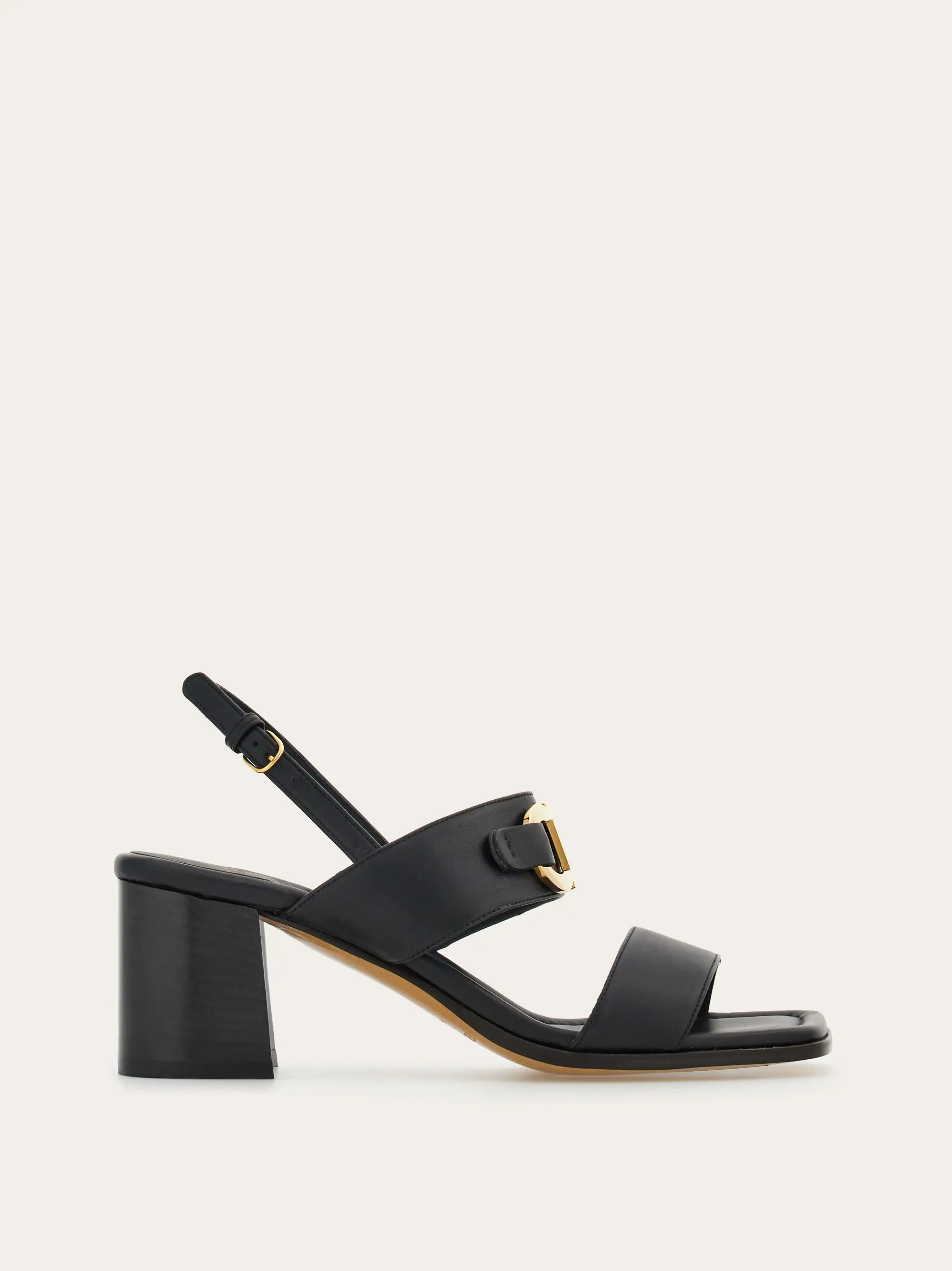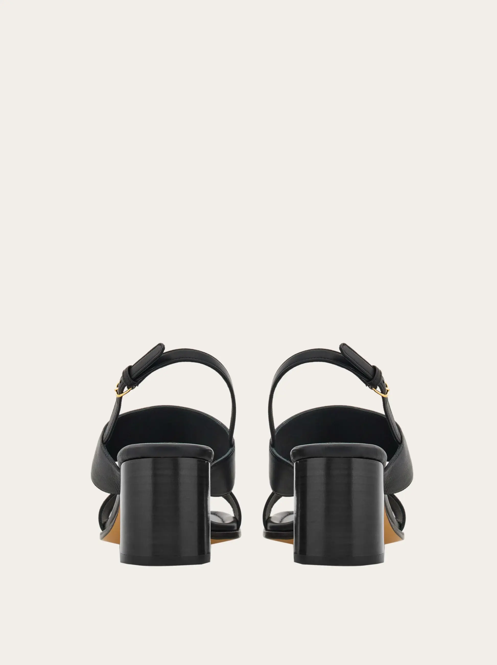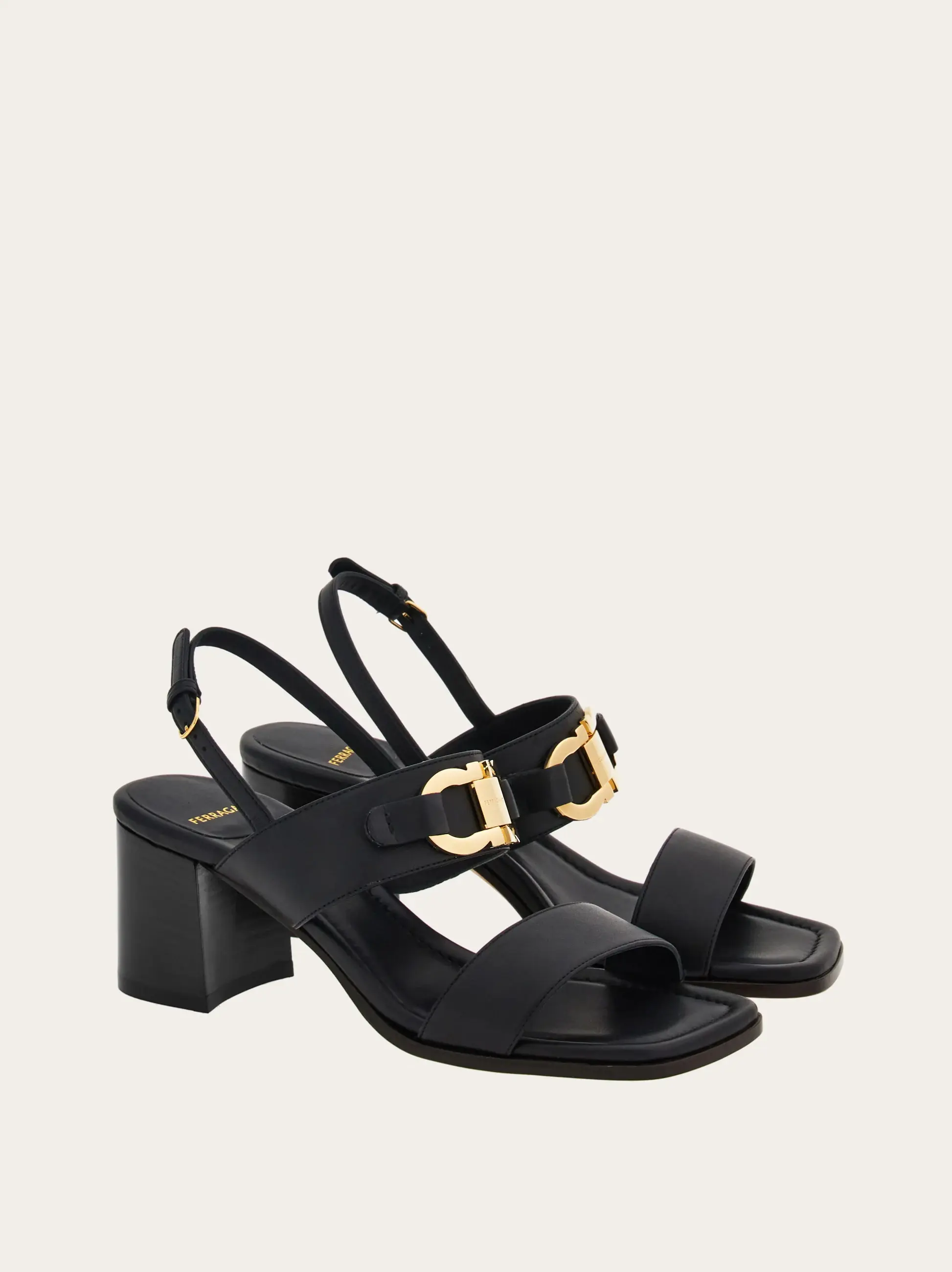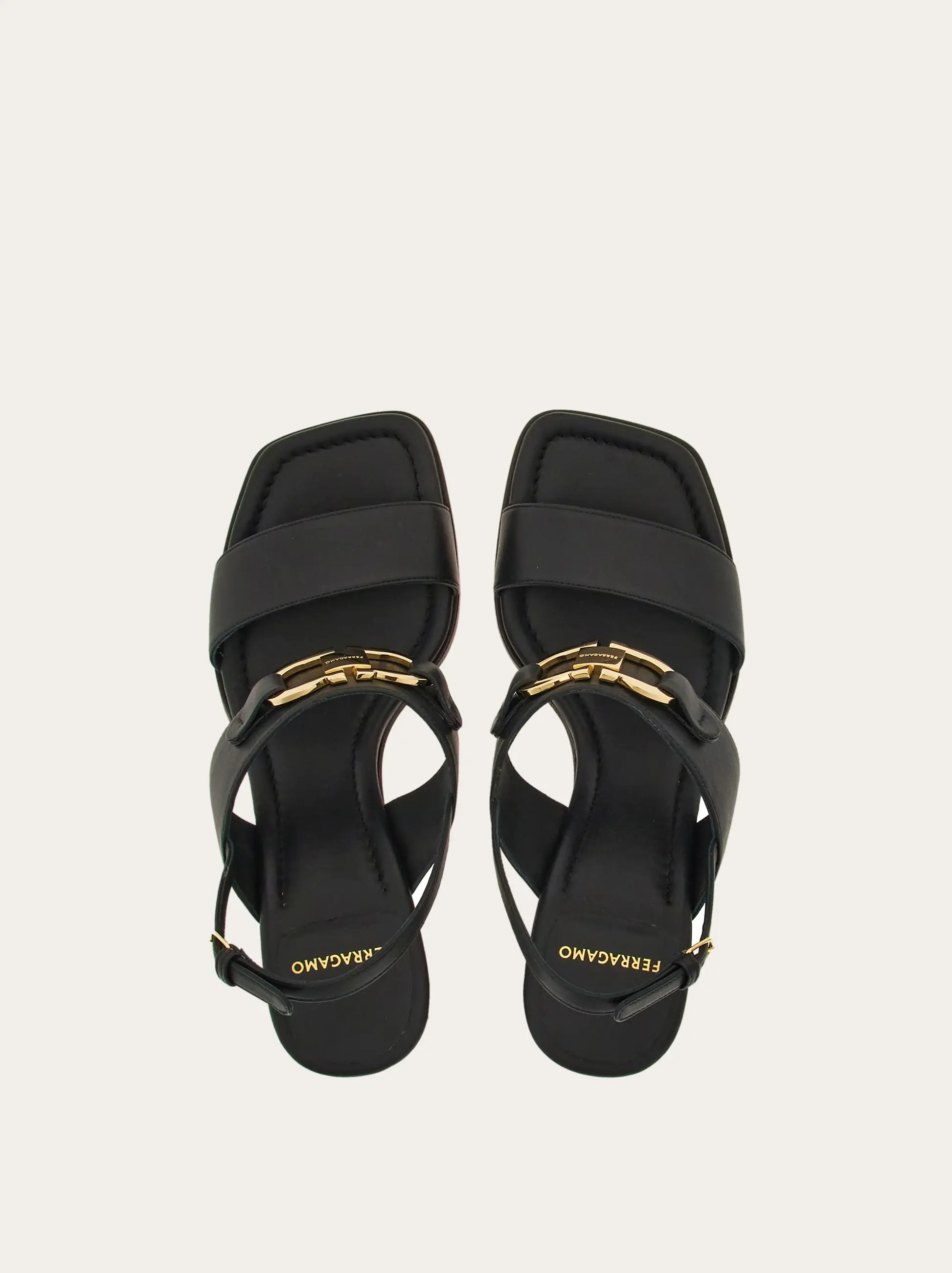 Keep it cool when the temperatures soar in this contemporary take on a Ferragamo classic. Block heel sandal made of soft, smooth Italian leather. The wide straps across the toe and instep are supported by a slim ankle strap with golden buckle for a secure fit, while the golden Gancio adds a touch of class.