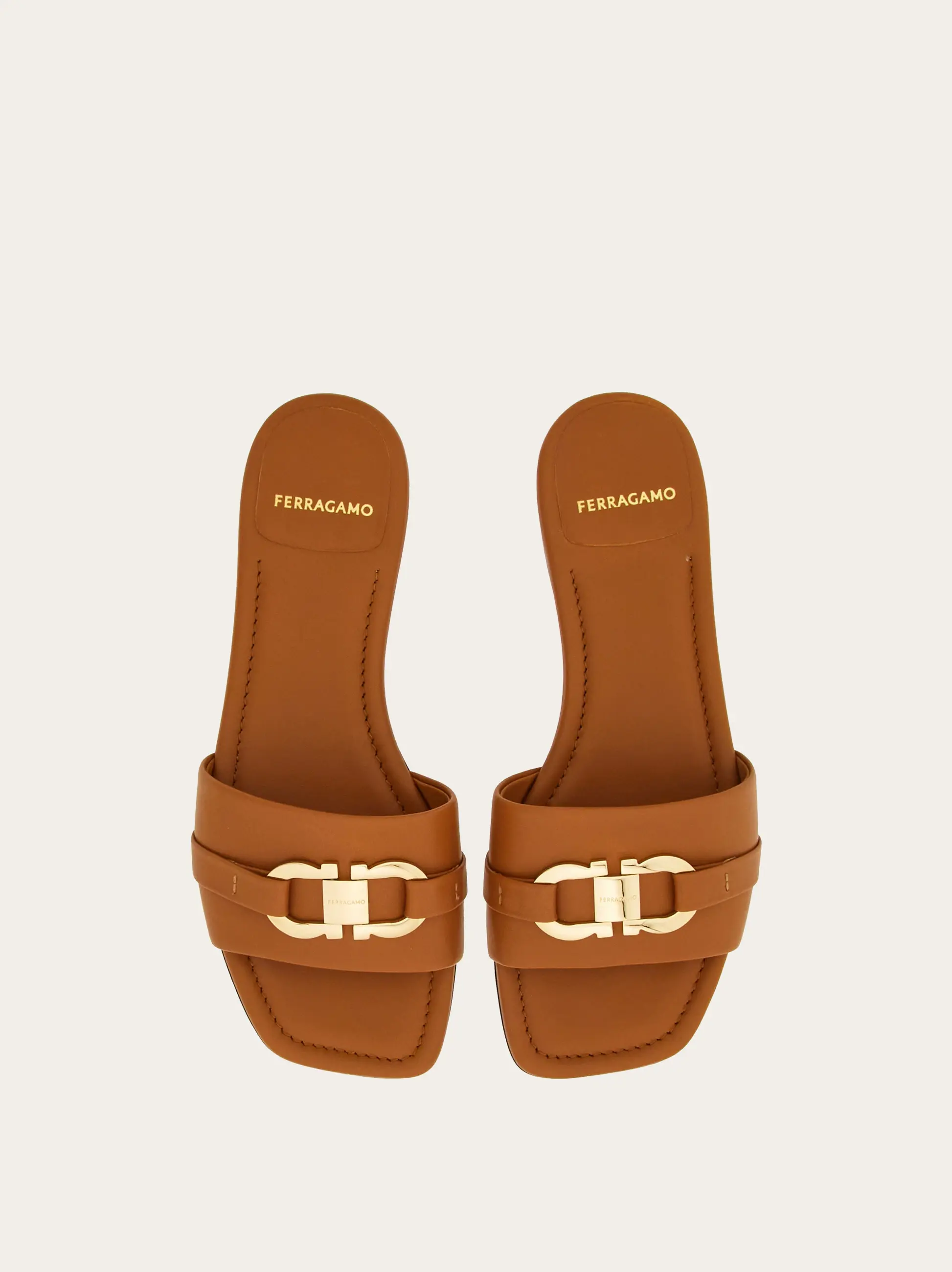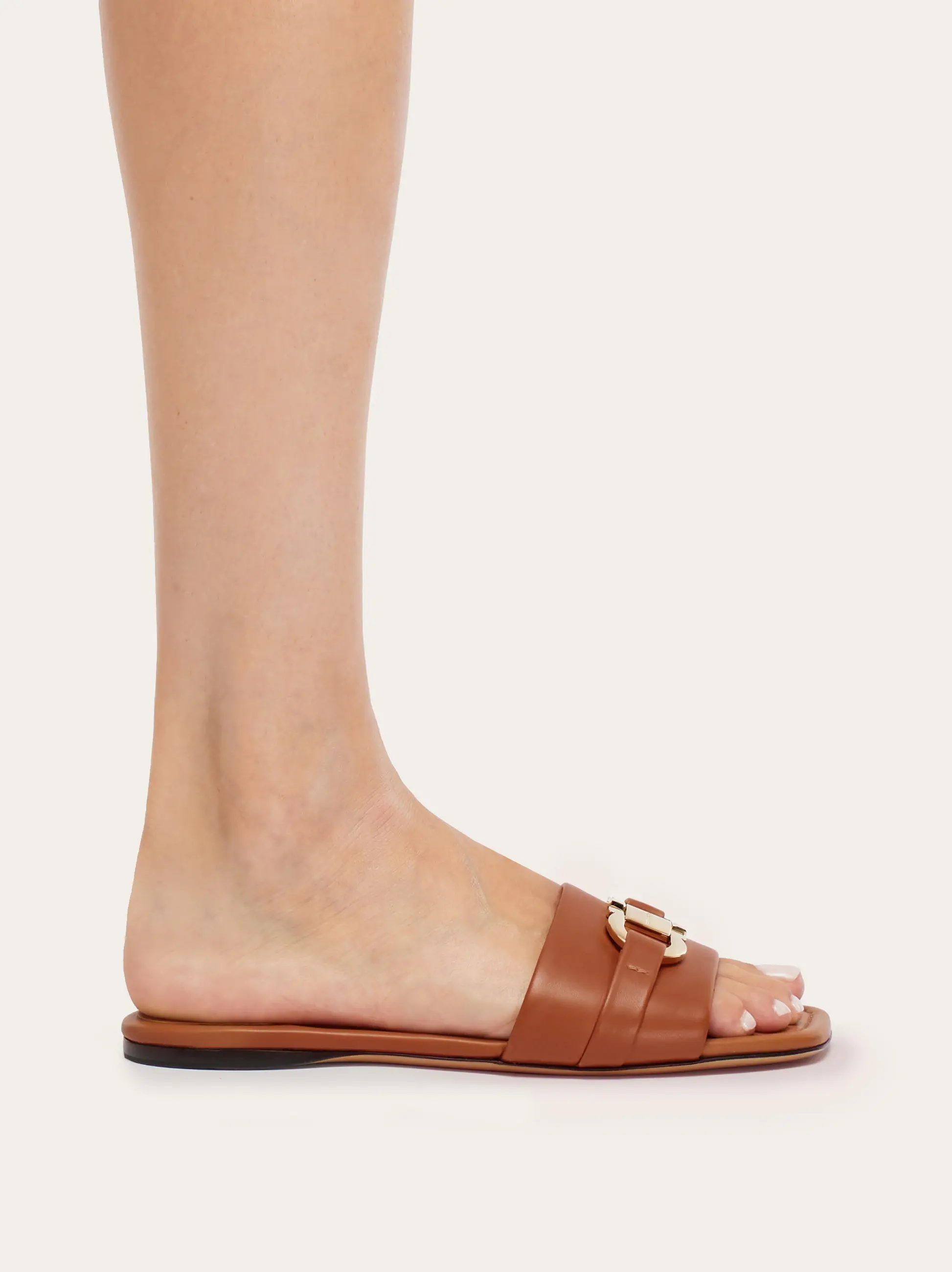 Summer staples with a luxurious appeal: the new Ferragamo slide features a squared silhouette for a contemporary feel. Made of the smoothest leather with a rich texture, it has a wide band across the instep with a squared Gancio buckle, a padded insole with grooves to outline its shape.
