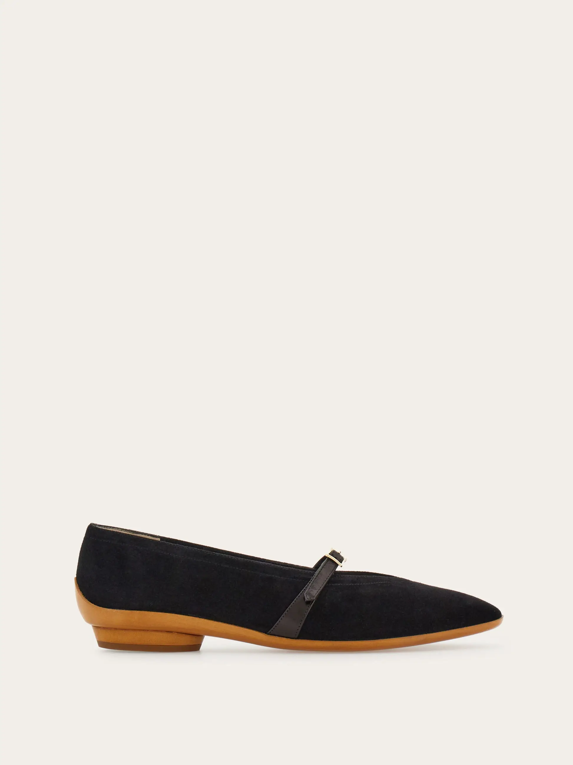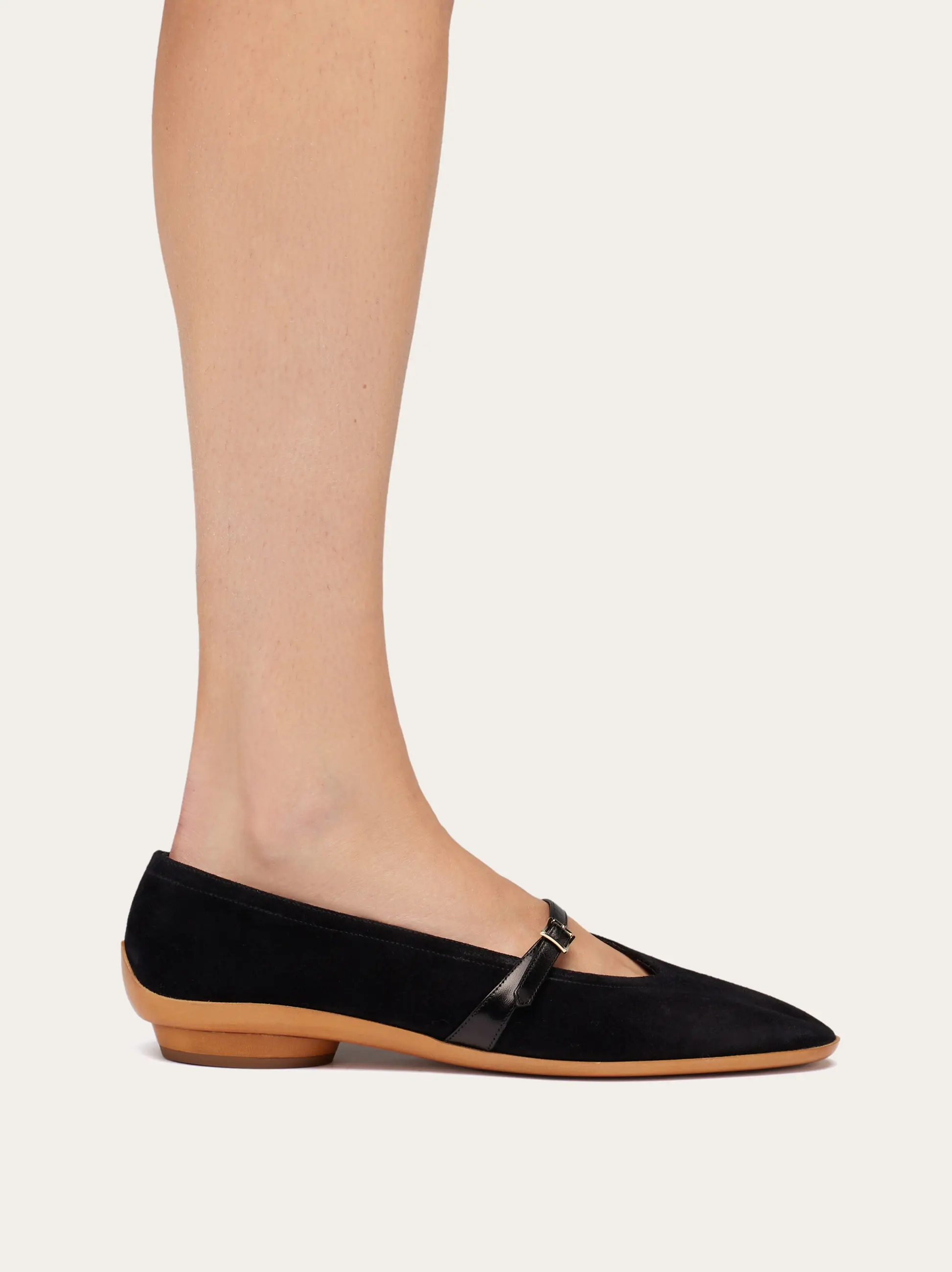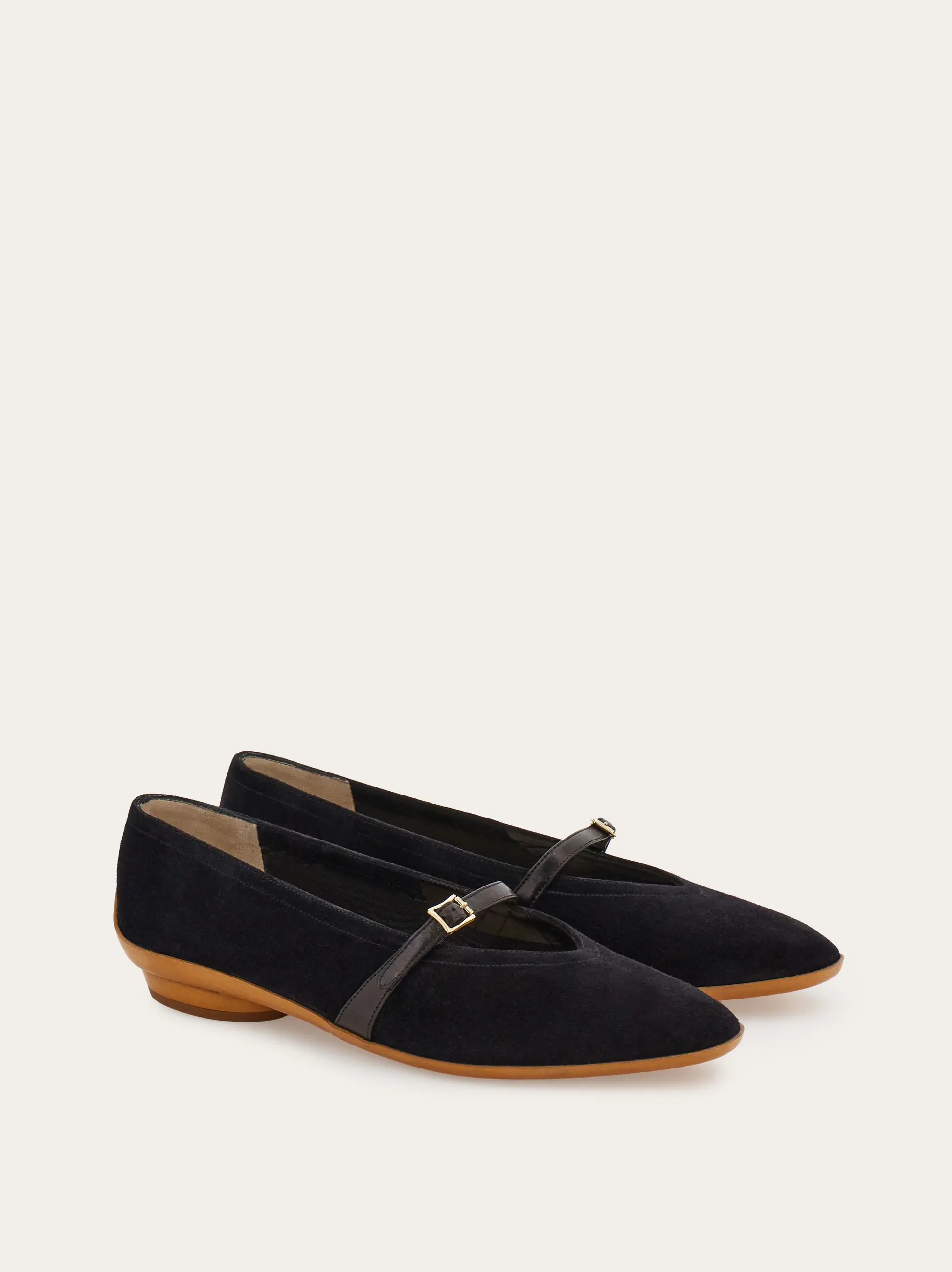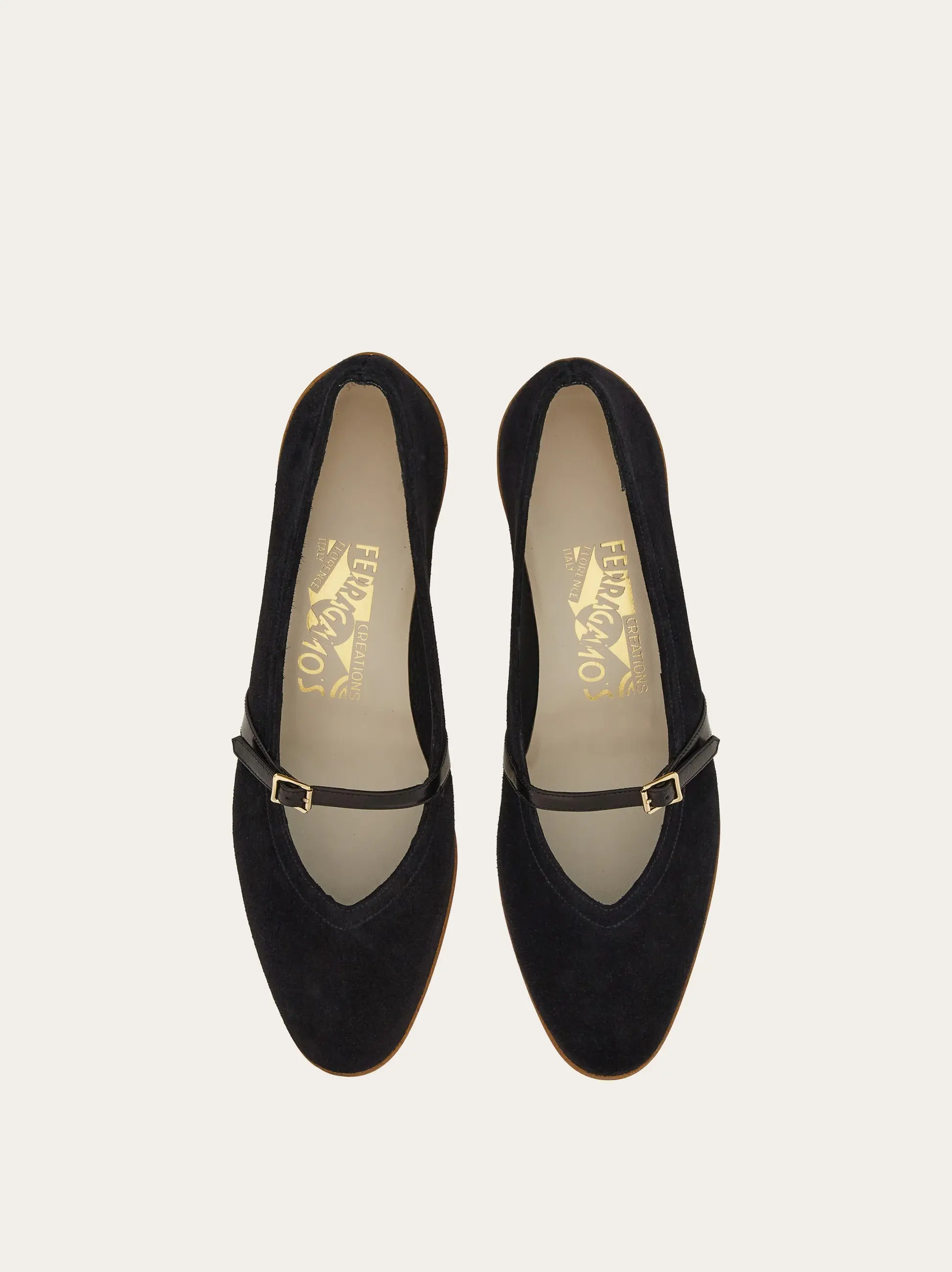 Designed in 1954 for Audrey Hepburn, this suede ballet shoe is a symbol of the fashion history and a testament to Ferragamo's impeccable craftsmanship. It features a delicate kidskin strap and a buckle that add a touch of sophistication. The low, oval heel and shell-shaped sole draw inspiration from Native American opanke moccasins, merging comfort with style.