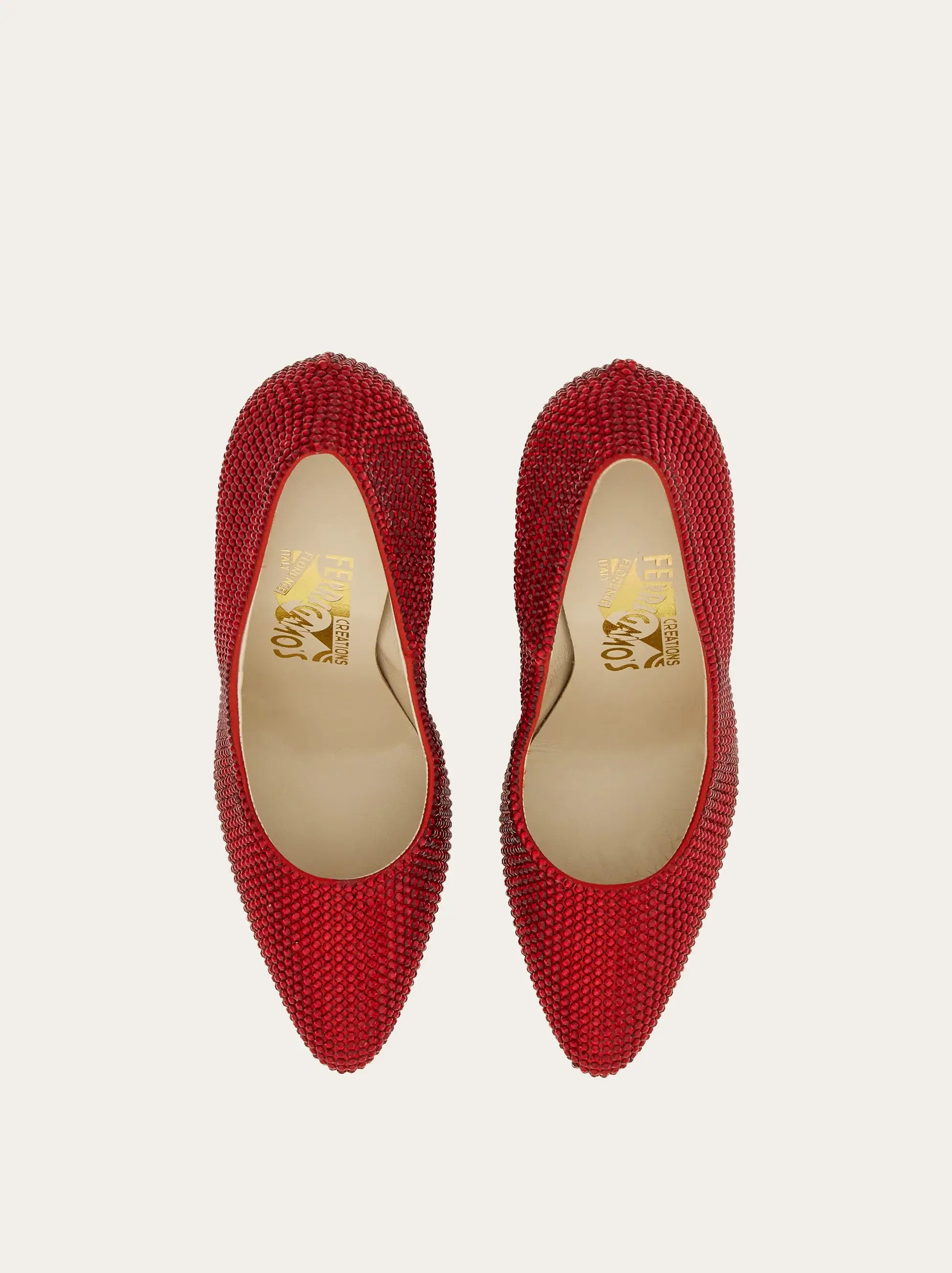 This Ferragamo pump was designed by Salvatore Ferragamo exclusively for Marylin Monroe. The actress worn these sparkling heels in George Cukor's movie "Let's Make Love" in 1960, creating a perfect match of Hollywood glamour and high fashion. The shoe features a satin upper entirely embellished with Swarovski crystals, ending with a pointed toe for an added touch of sophistication. The lining inside and the insole are in beige kidskin, ensuring both style and comfort.
