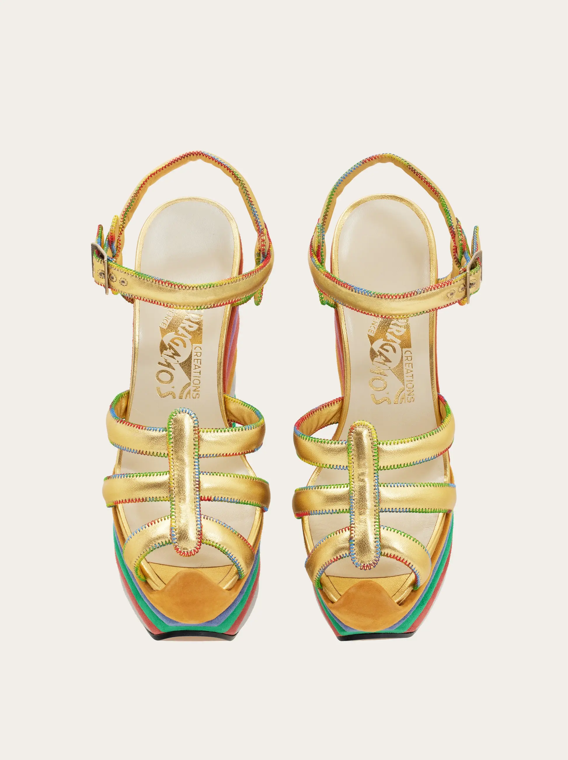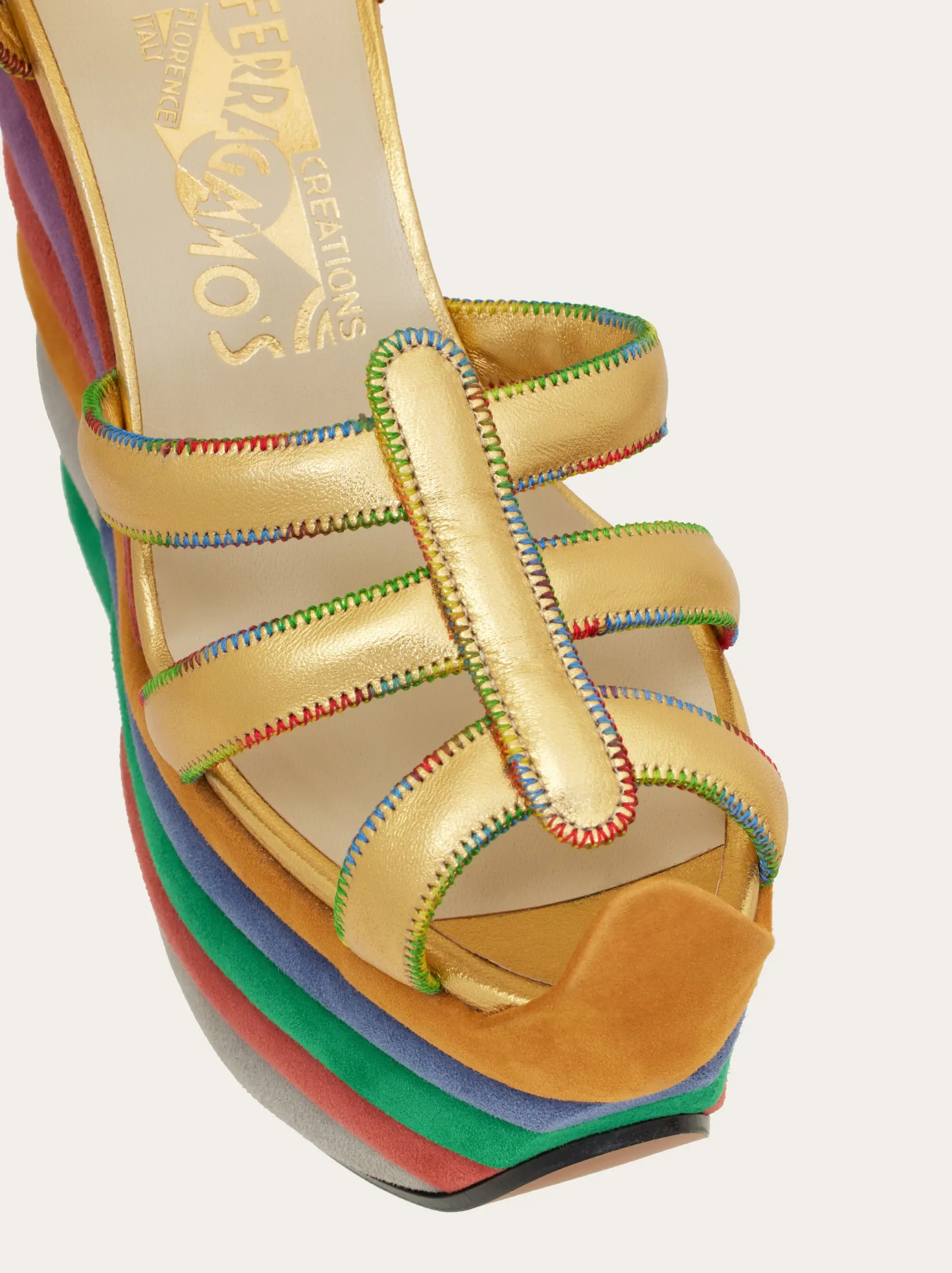 The Rainbow sandal, a timeless creation by Salvatore Ferragamo that transcends fashion eras, was crafted in 1938 for Judy Garland. The sandal boasts a cork heel and wedge, harmoniously lined with the rainbow colored suede, showcasing Ferragamo's unmatched creative genius in seamlessly blending forms and colors. This model stands as one of the most renowned pieces of the shoemaker of the stars.