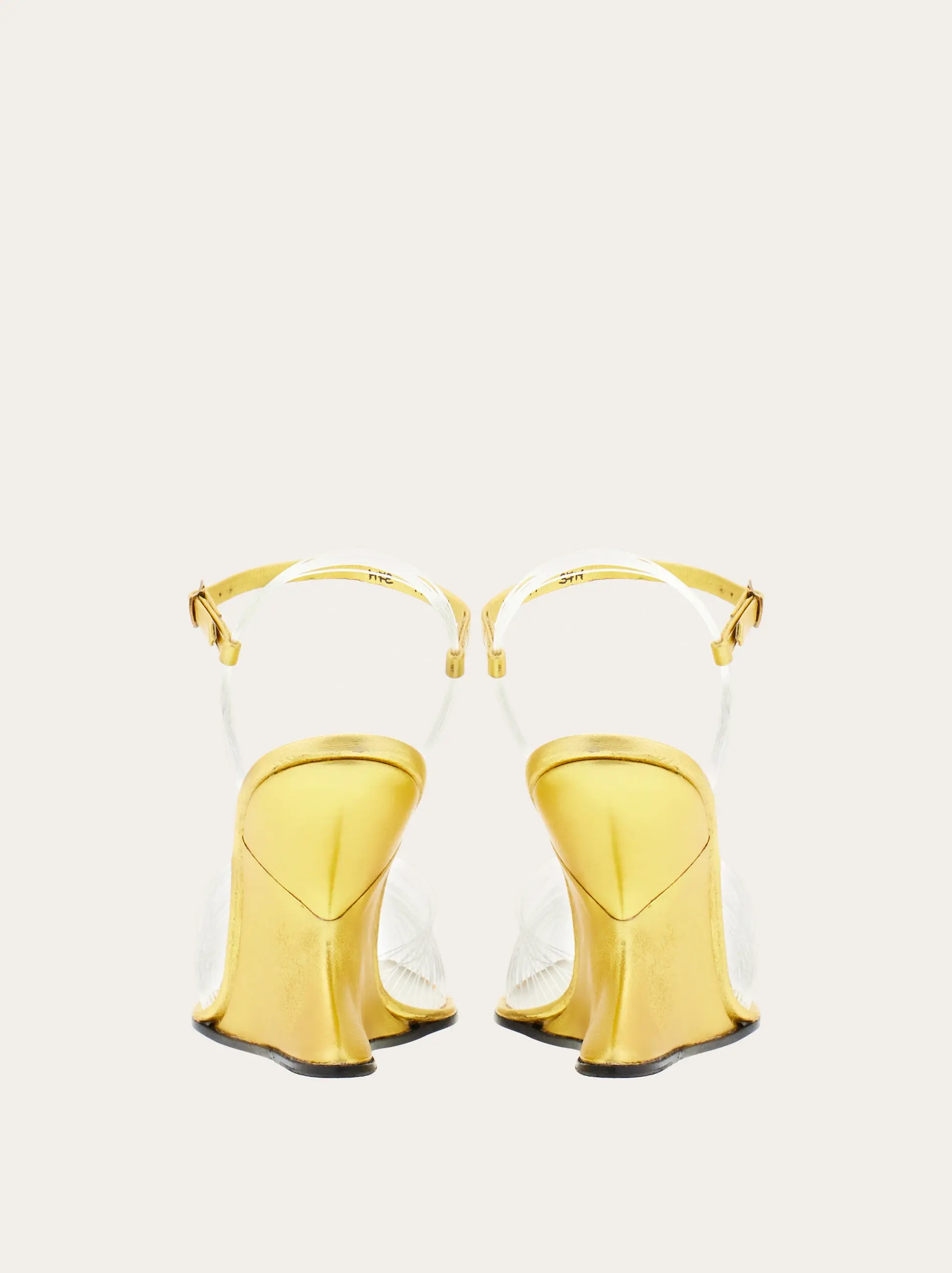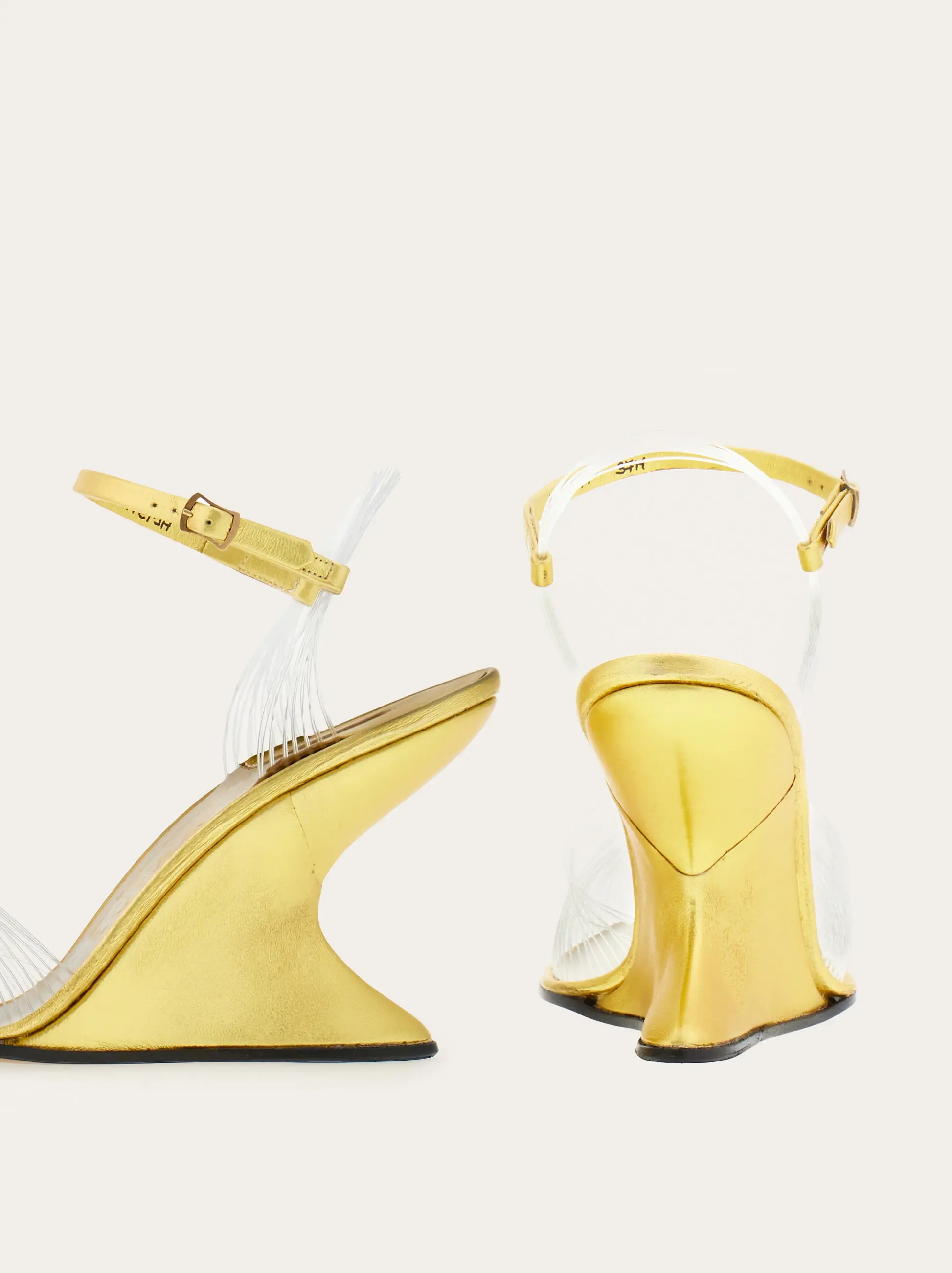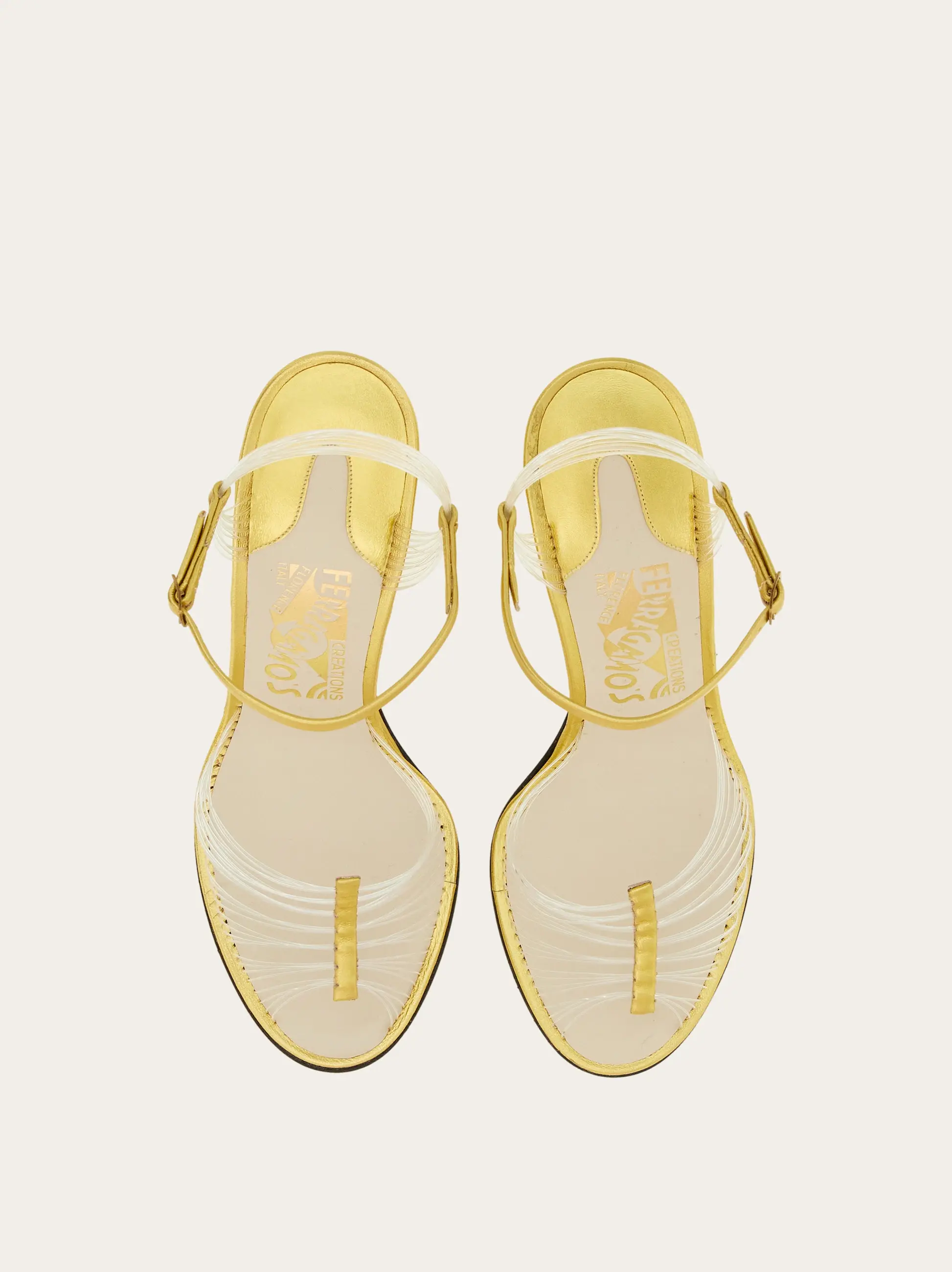 The Invisible sandal, crafted from a single nylon thread, is a step towards innovation, showcasing Salvatore Ferragamo's pioneering design. The F-shaped wood wedge sole adds a unique touch of style and comfort to this iconic creation, born in 1947 and embodying one of Ferragamo's most significant patents. This avant-garde shoe not only marks a milestone in history of fashion but also earned Ferragamo the prestigious Neiman Marcus Award in Dallas, Texas which is considered the Oscar of the fashion world.