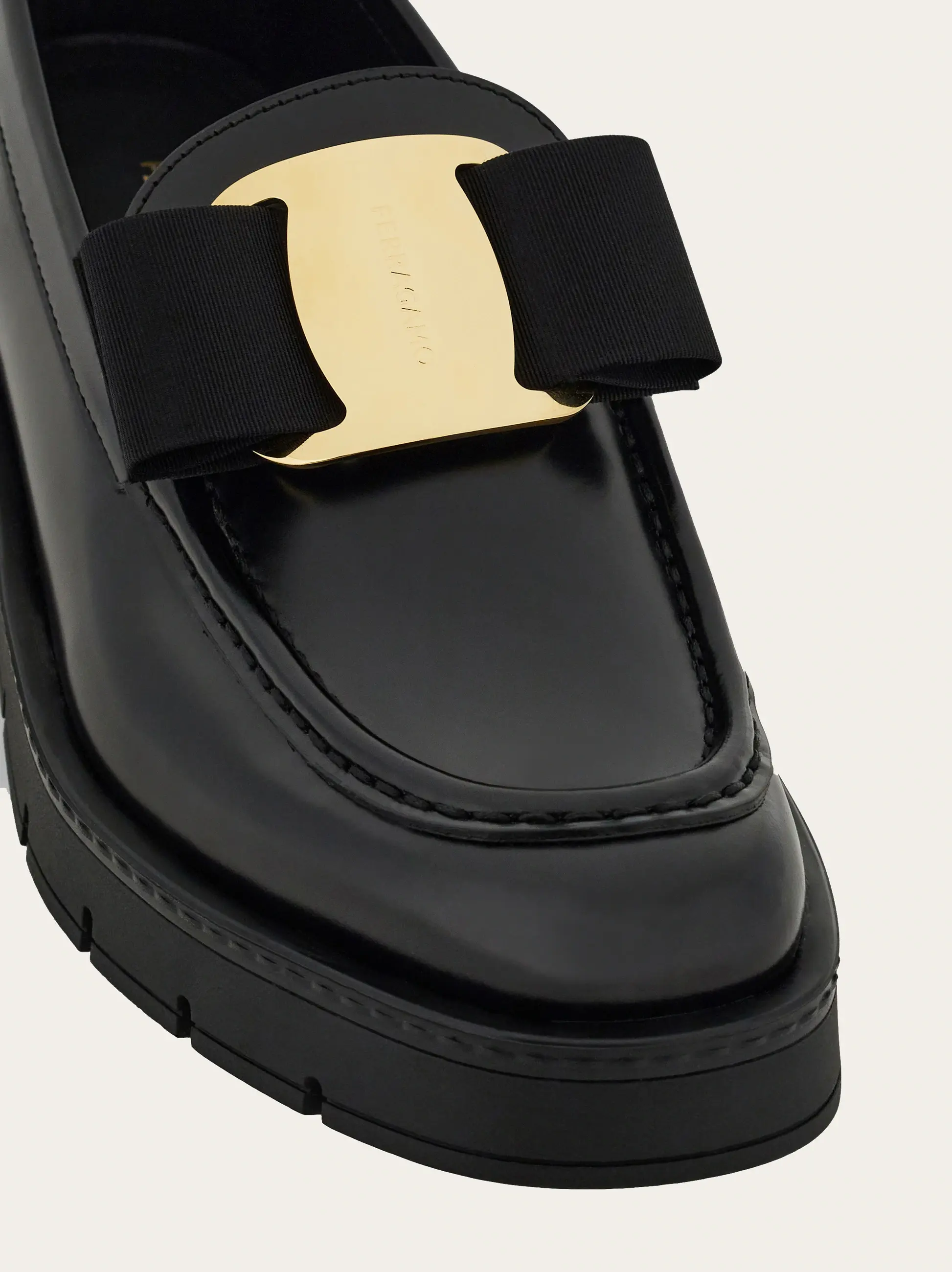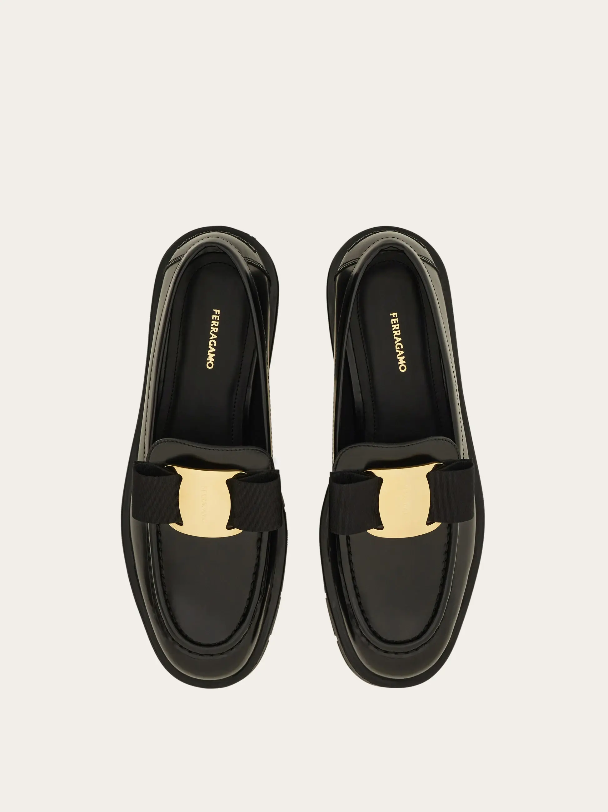 Edgy elements and feminine details come together harmoniously in this new take on the Ferragamo loafer. The buffed leather upper is graced by a gros grain Vara bow held by a custom golden buckle, and raised stitching around the vamp. Across the heel, raised stitching confirms the contemporary attitude echoed by the thick rubber sole with chunky custom tread, and deep grooves ensure a flexible fit.