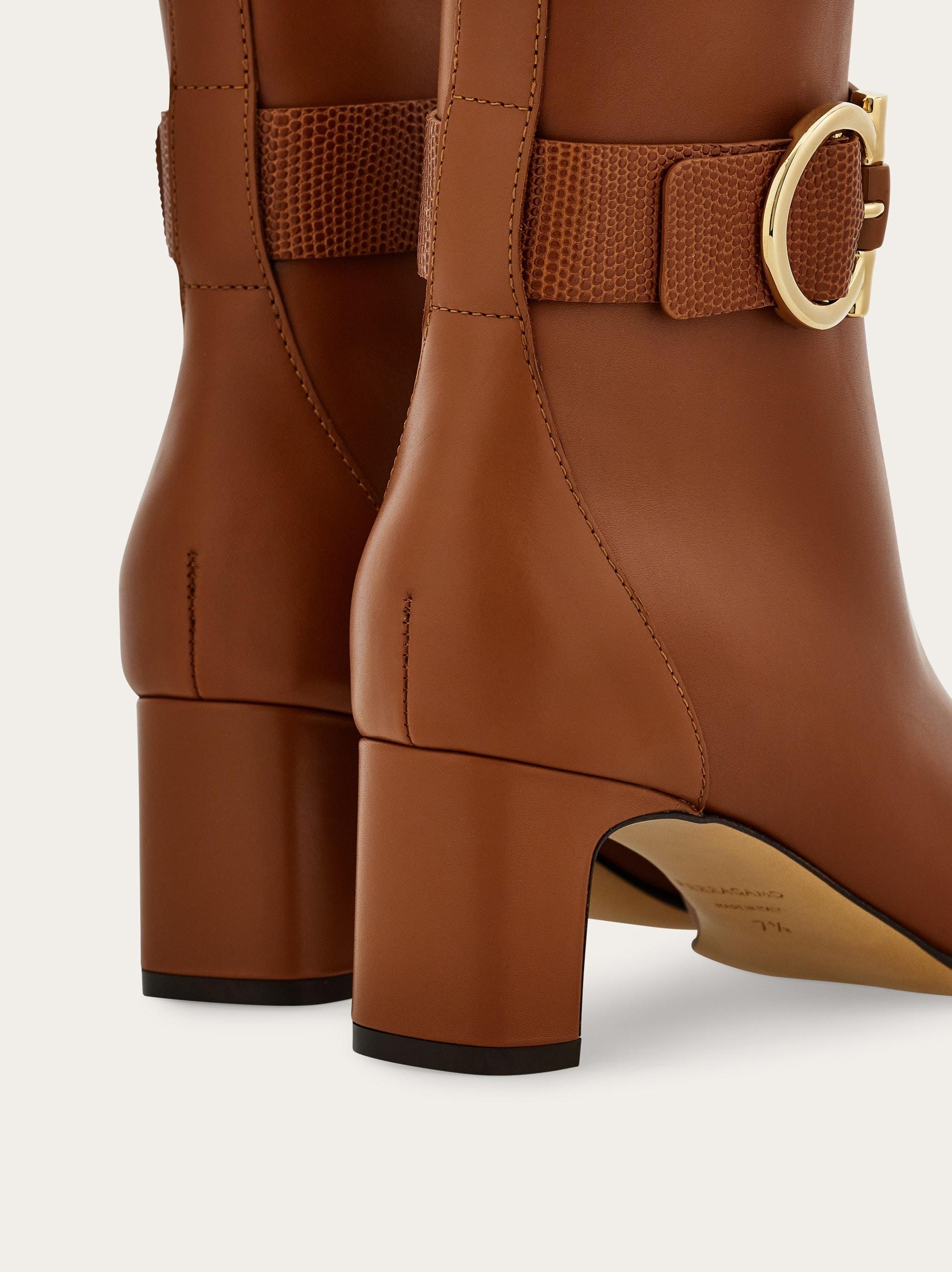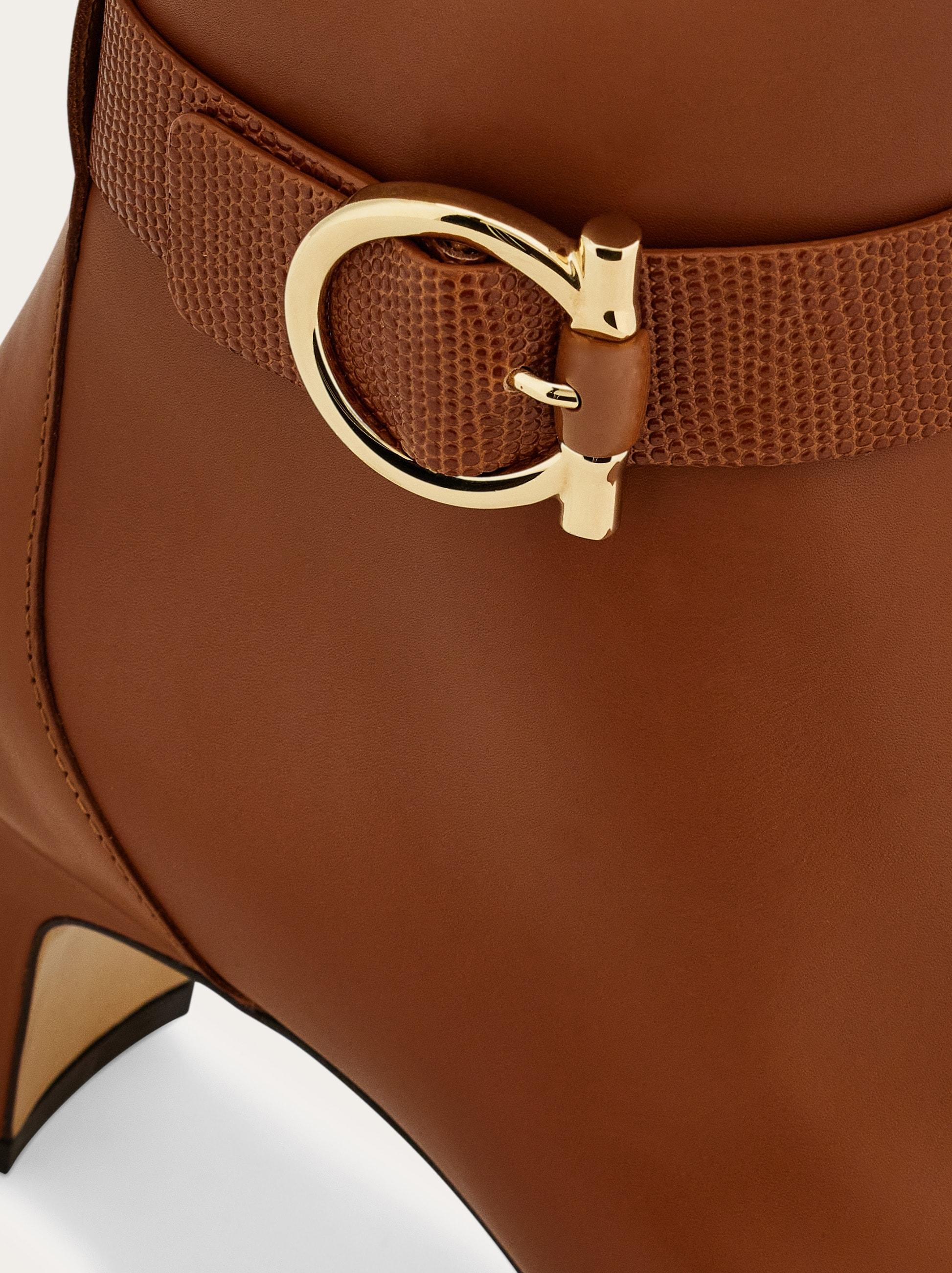 Smooth and buttery soft, the minimal, clean cut look of this sleek ankle boot is accentuated by meticulously placed details. The calfskin upper features a lizard print strap that wraps the ankle and fastens via a golden Gancio buckle. A zip on the inside of the ankle ensures a glove-like fit, while the 5.5cm chunky heel offers all day comfort.