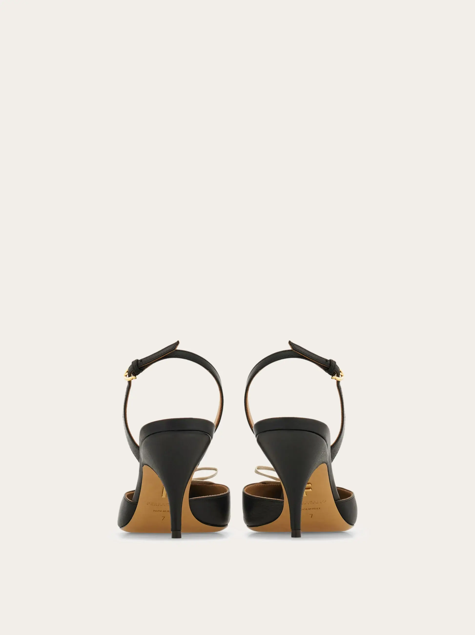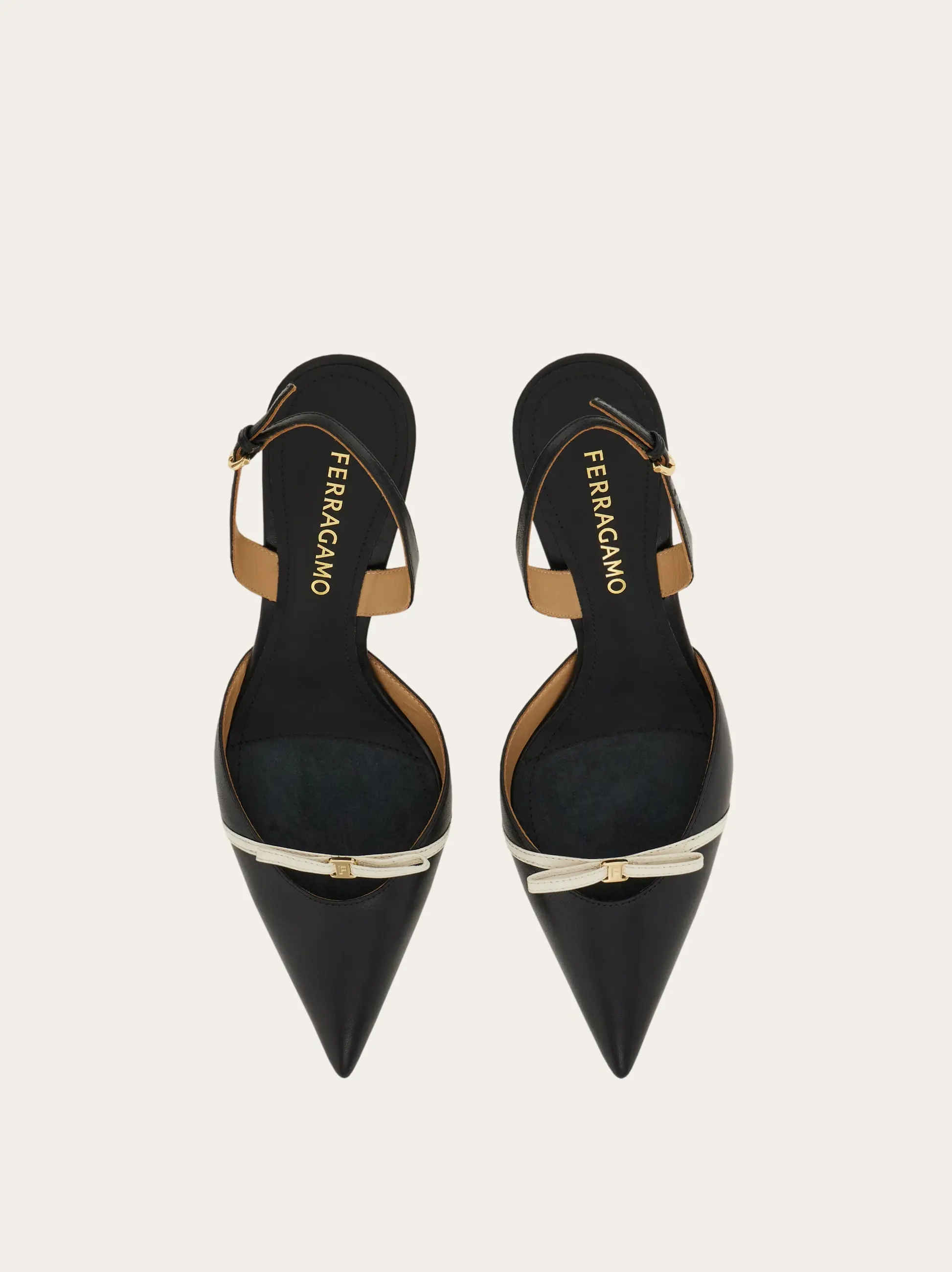 Above and beyond seasons and trends, this elegant slingback is simply timeless. Made of the softest kid leather with a buttery smooth feel, it has a pointed tip and a slim strand of leather across the toes that is tied in a bow just like a delicate ribbon whose line cuts the oval opening of the shoe. Set on a slim heel with a slight curve, the contrast in shapes adds a current twist to its romantic allure.