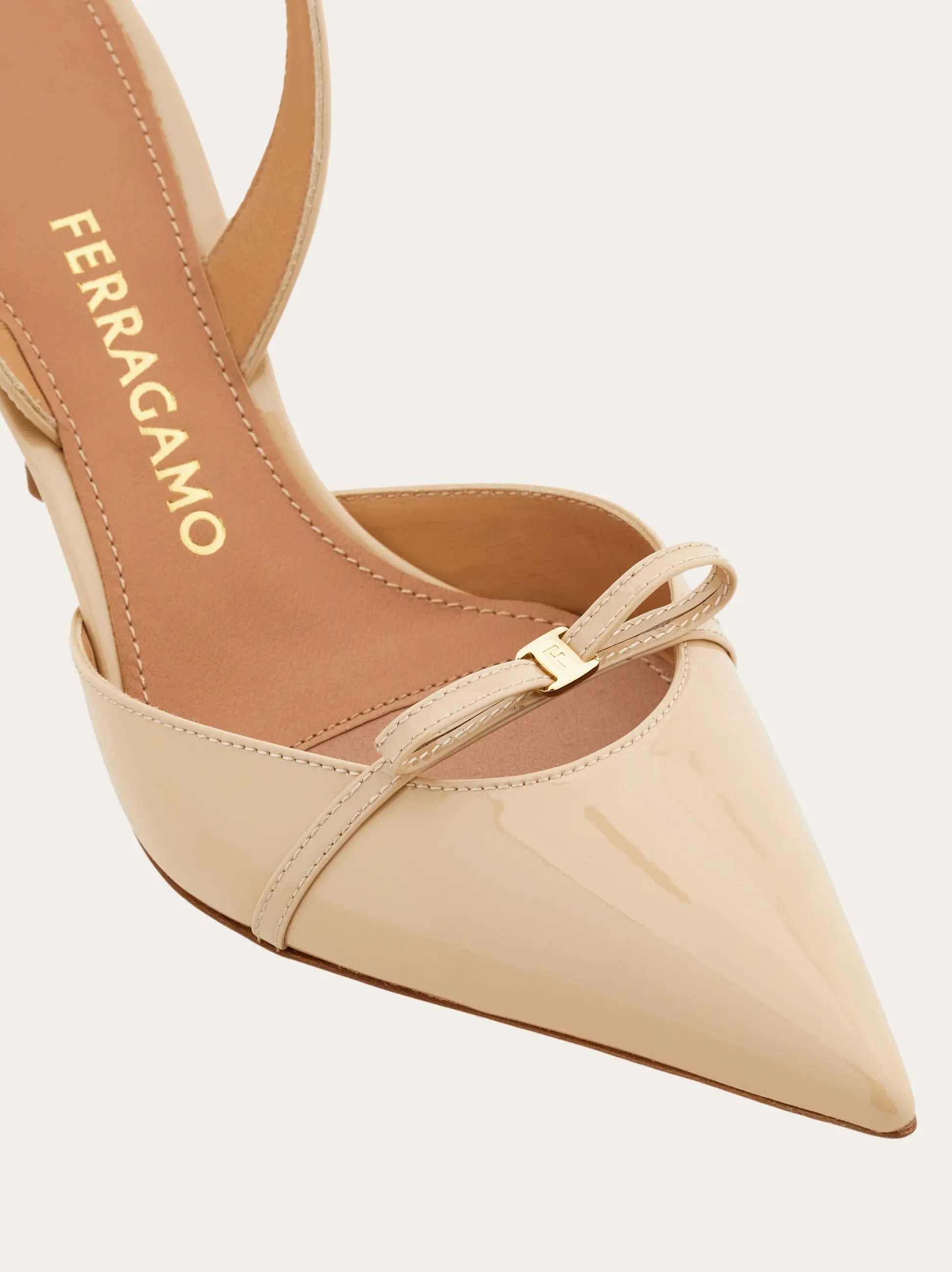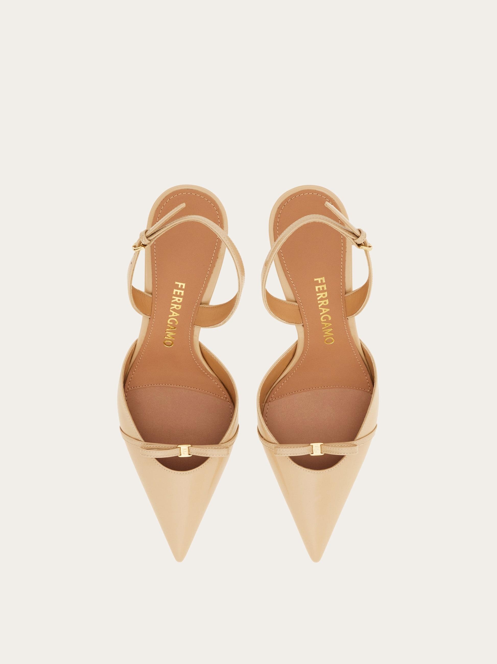 Above and beyond seasons and trends, this elegant slingback is simply timeless. Made of the softest kid leather with a buttery smooth feel, it has a pointed tip and a slim strand of leather across the toes that is tied in a bow just like a delicate ribbon whose line cuts the oval opening of the shoe. Set on a slim heel with a slight curve, the contrast in shapes adds a current twist to its romantic allure.