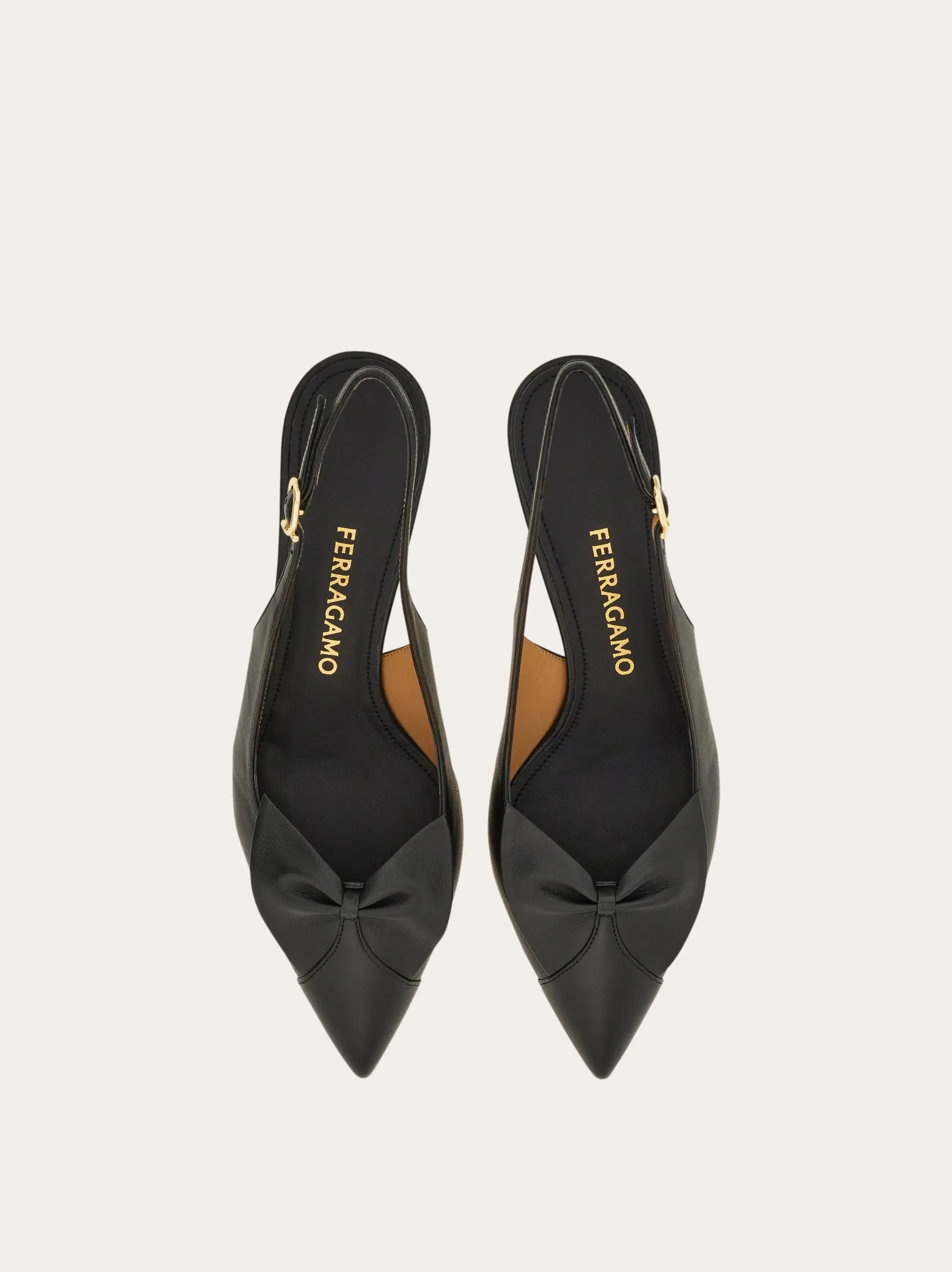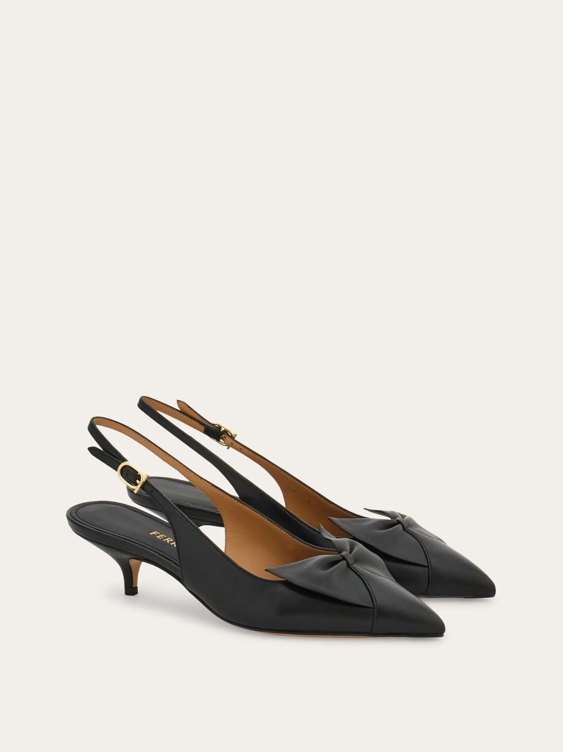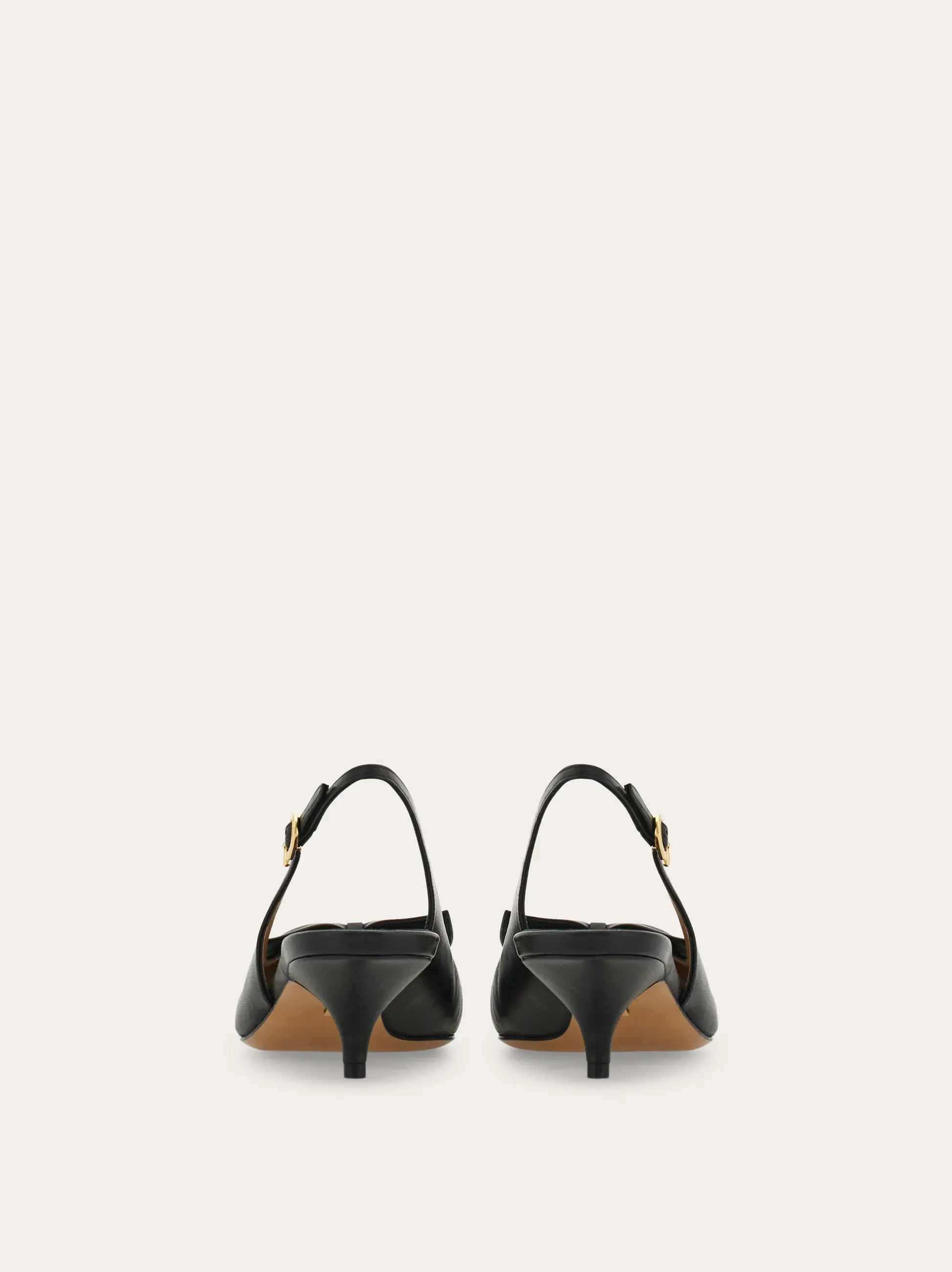 The 50s are back with a contemporary twist in this new slingback pump. The sleek, pointed profile is decorated with a sophisticated bow across the toes and the signature golden Gancini buckle that illuminates the strap. Leather sole and slim heel with a non-slip rubber tip.