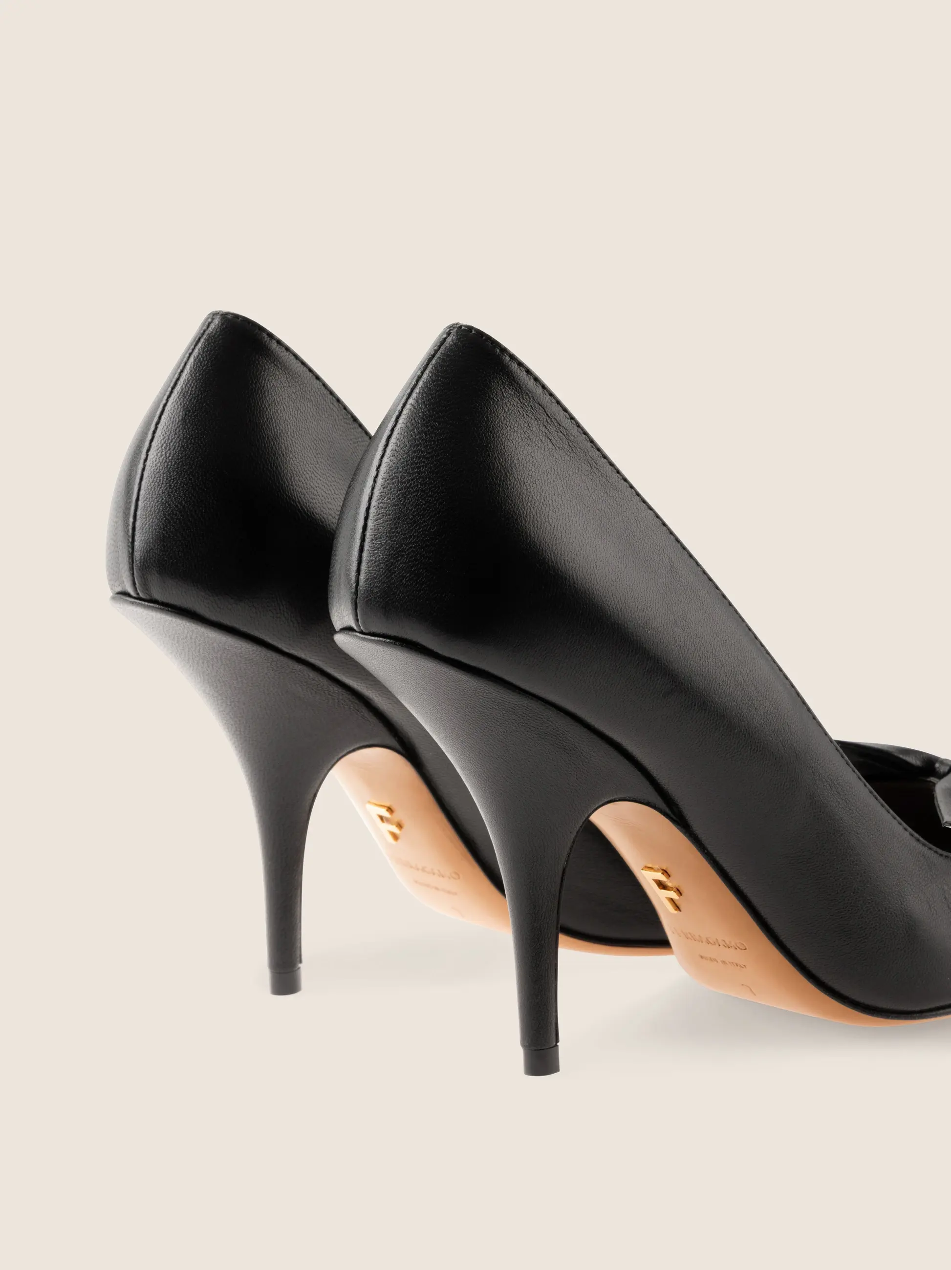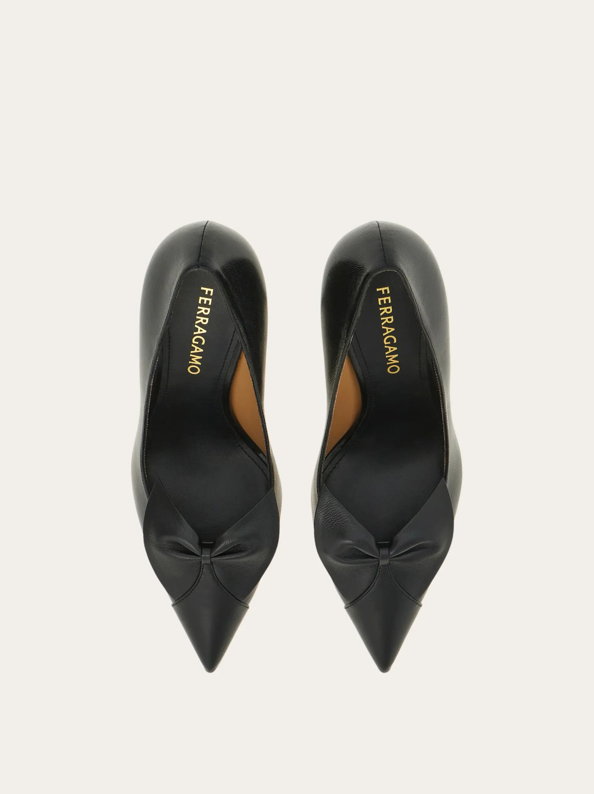 A redefined classic: this pointed pump is made from supple nappa leather with a sculptural bow across the toes for a dose of 50s charm. A slim leather-covered heel with a rubber tip and a supple leather sole complete this irresistibly feminine design.