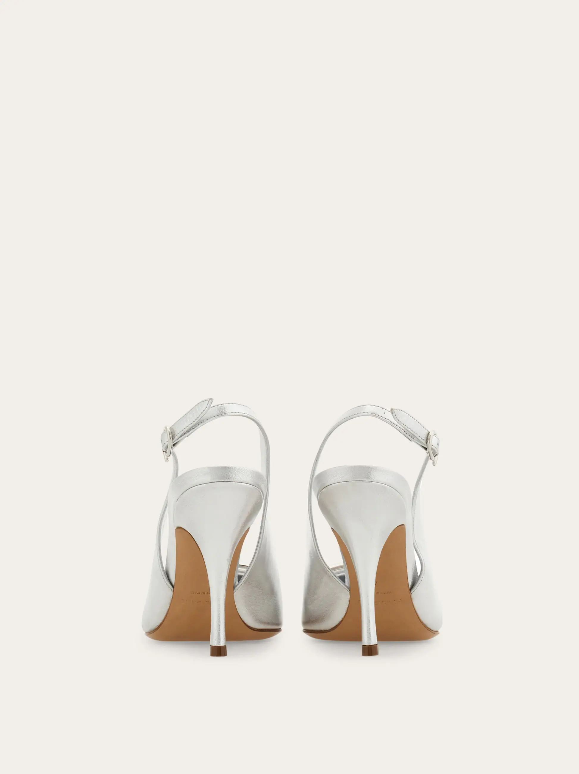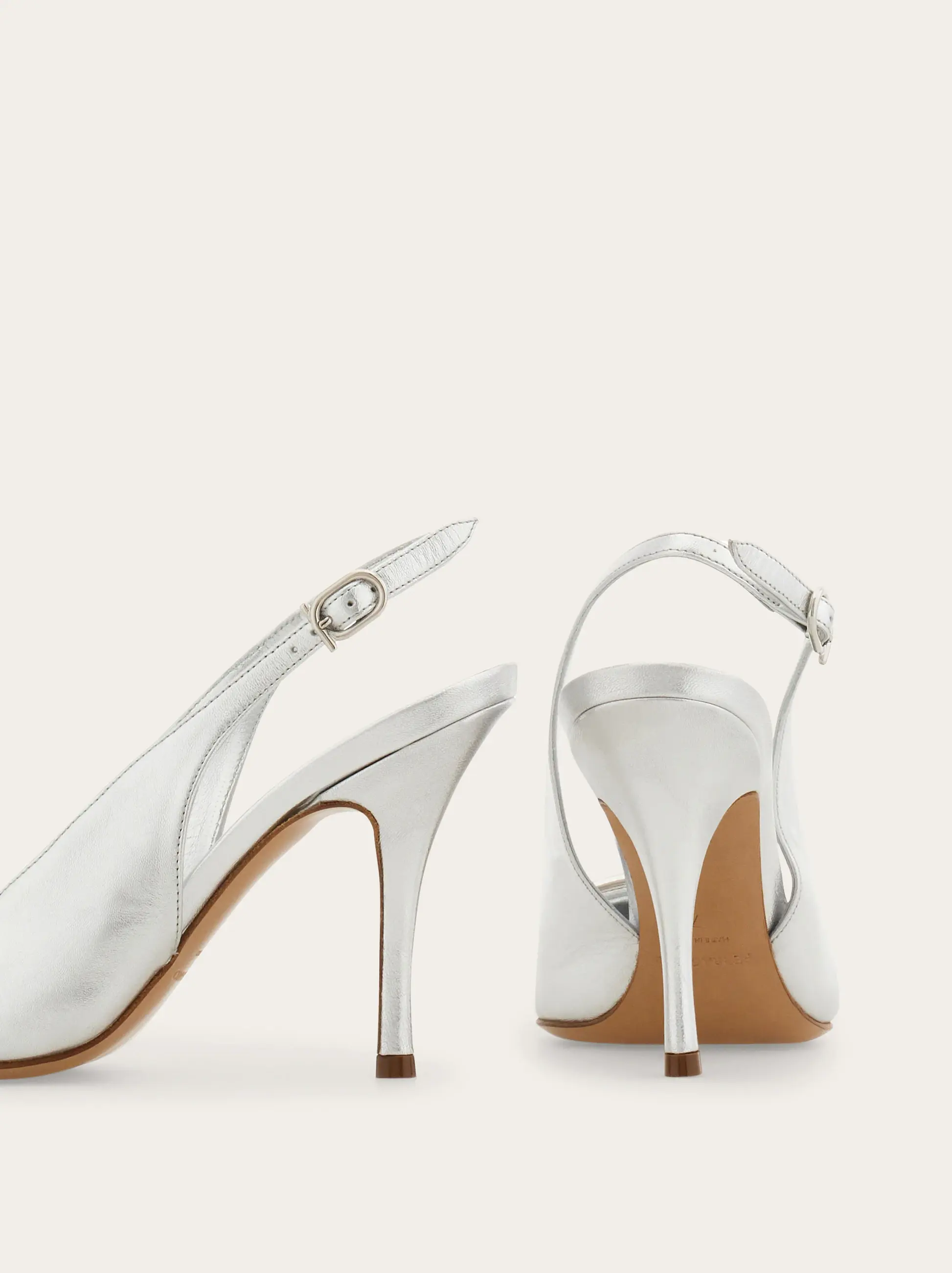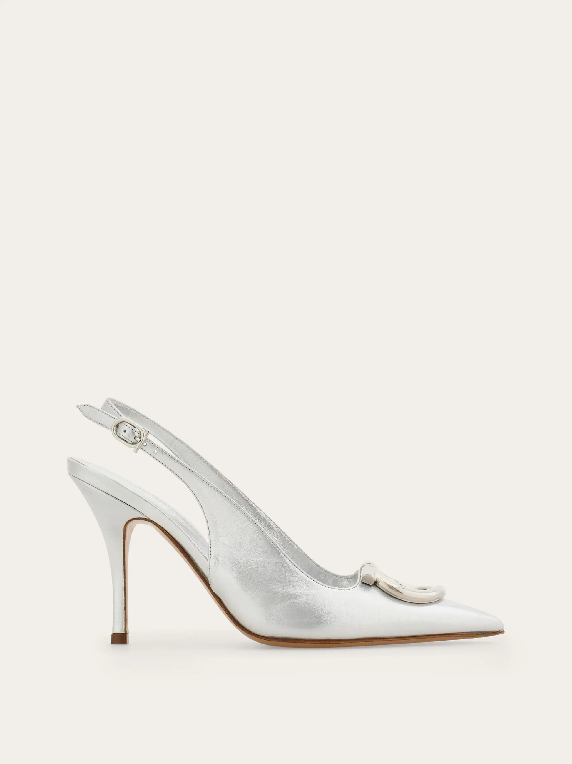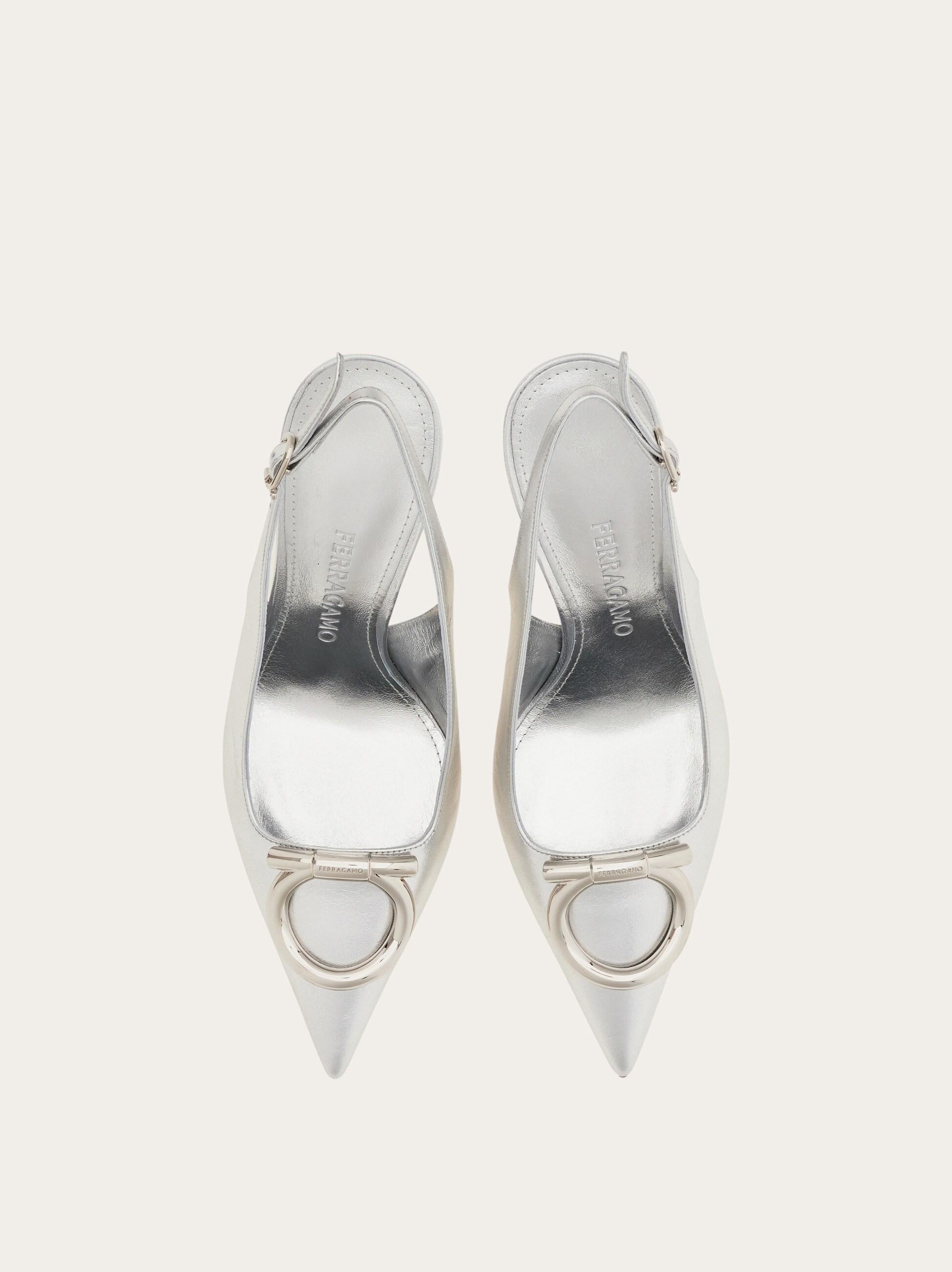 Sophisticated and empowering: this slingback pump features an elegantly cut, rounded vamp and a thin stiletto heel wrapped in tonal leather. The flattering, subtly sensual silhouette is finished with an oversized version of the Gancini motif in a glistening golden finish.