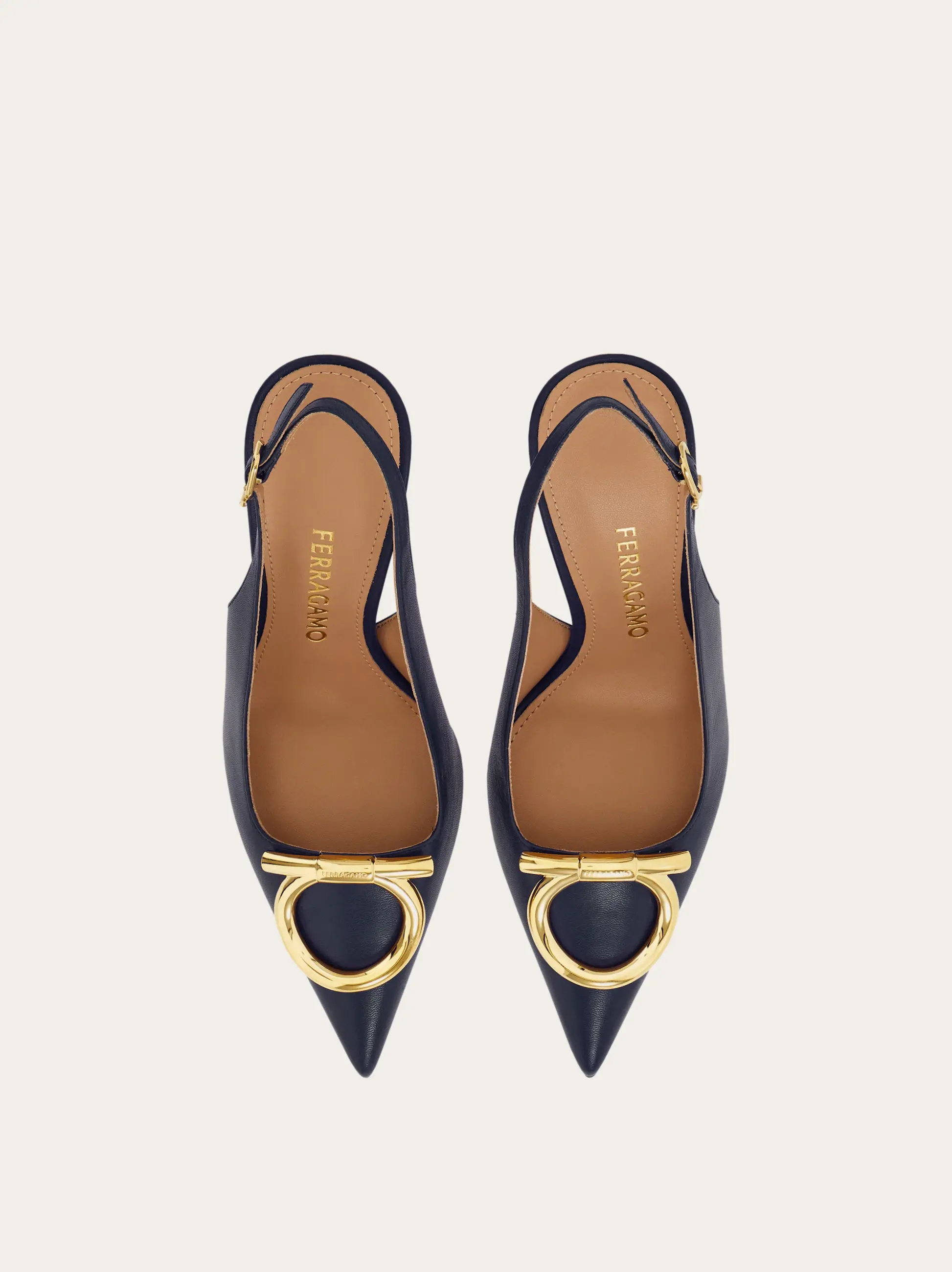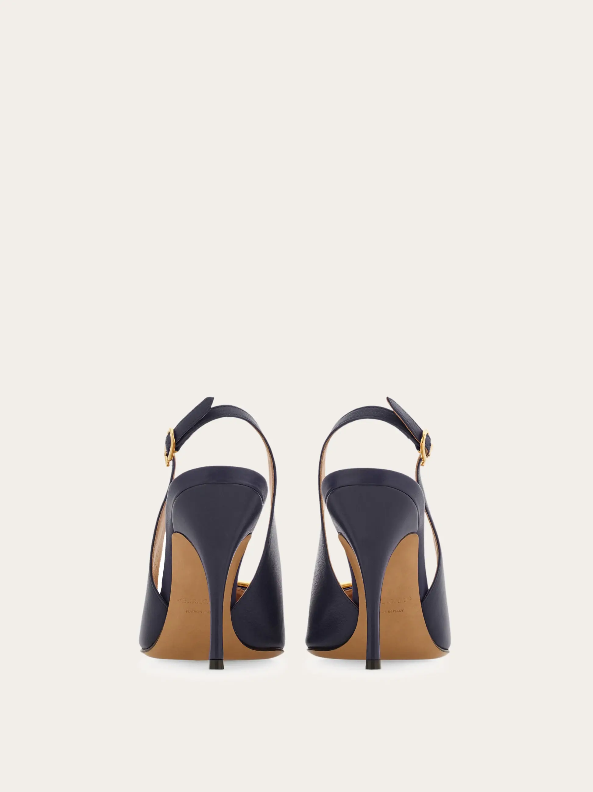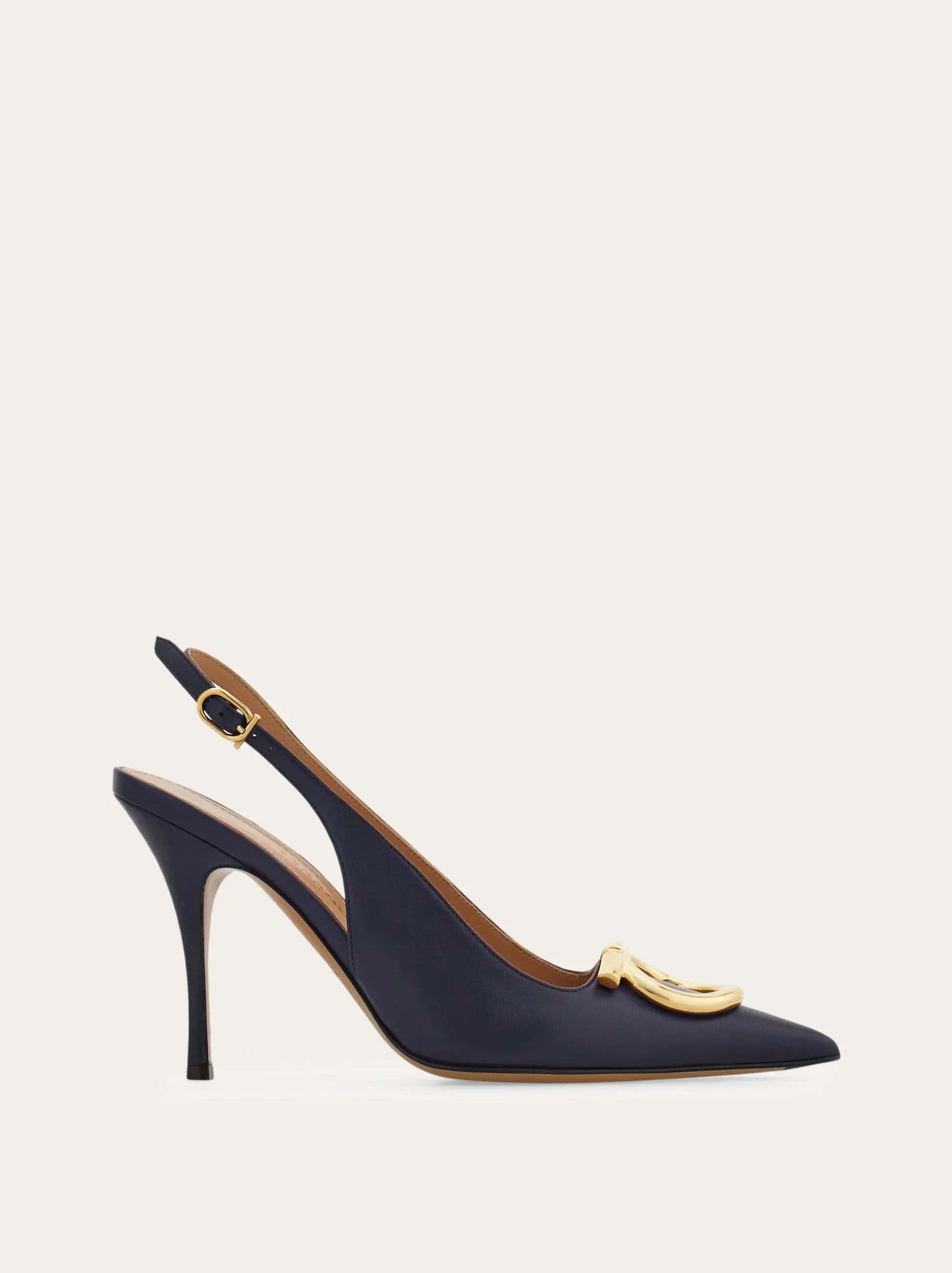 Sophisticated and empowering: this slingback pump features an elegantly cut, rounded vamp and a thin stiletto heel wrapped in tonal leather. The flattering, subtly sensual silhouette is finished with an oversized version of the Gancini motif in a glistening golden finish.