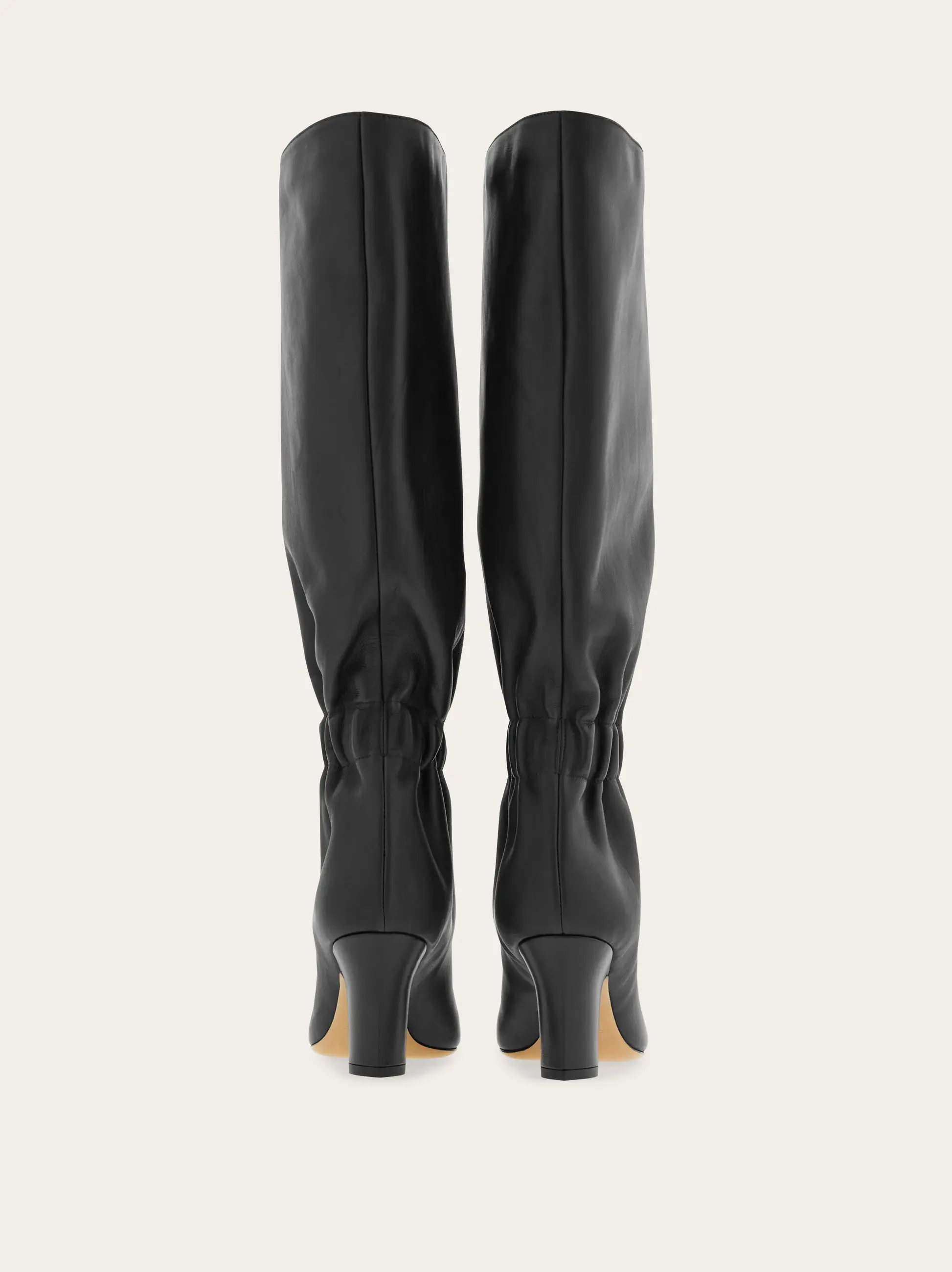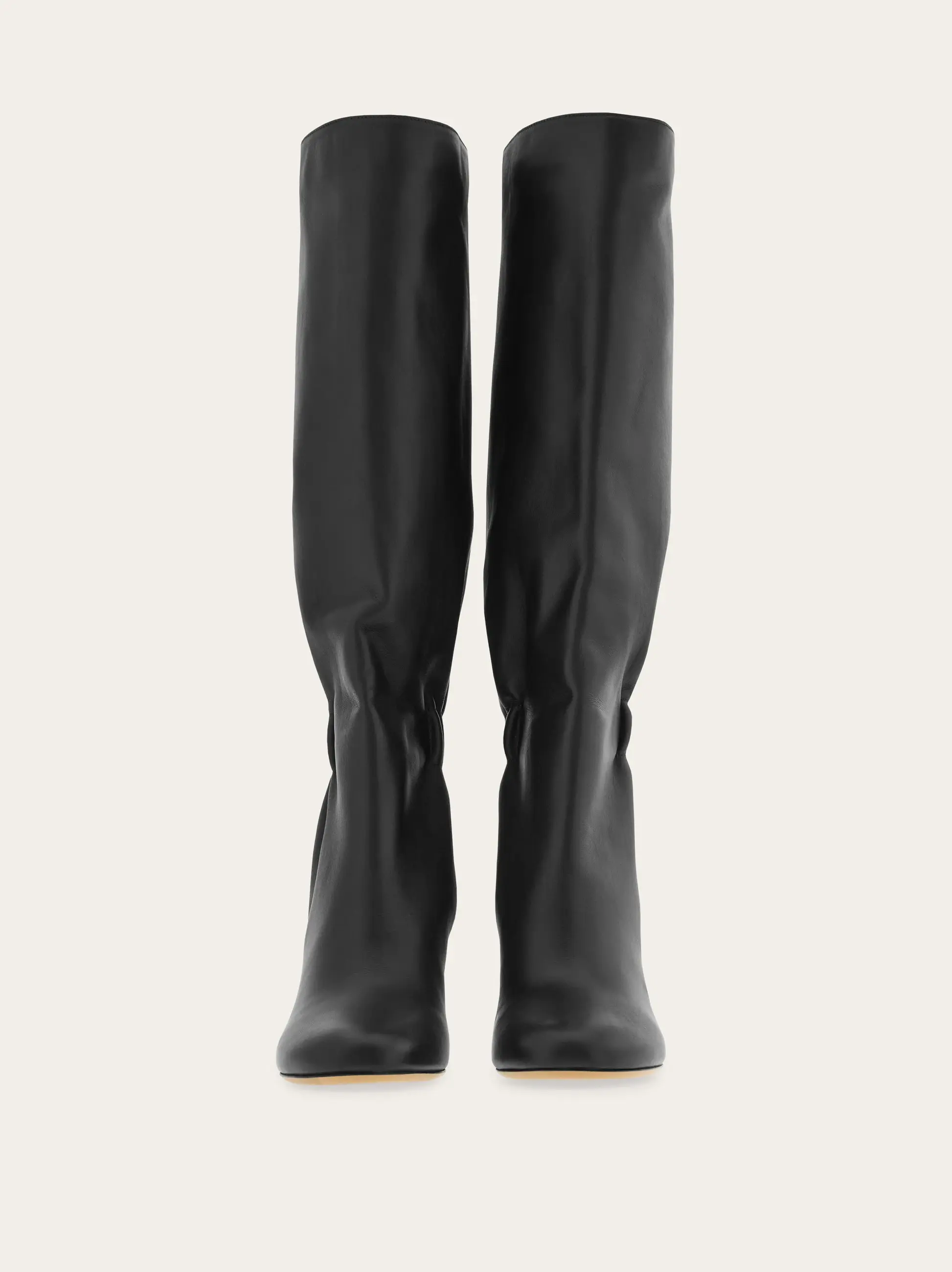 With its sophisticated, slouchy look, this knee boot promises to take your wardrobe in a stylish new direction. The square-toe profile is adorned with an oversized version of the Gancini motif in gleaming gold and set on a comfortable leather-covered block heel measuring 7 cm.