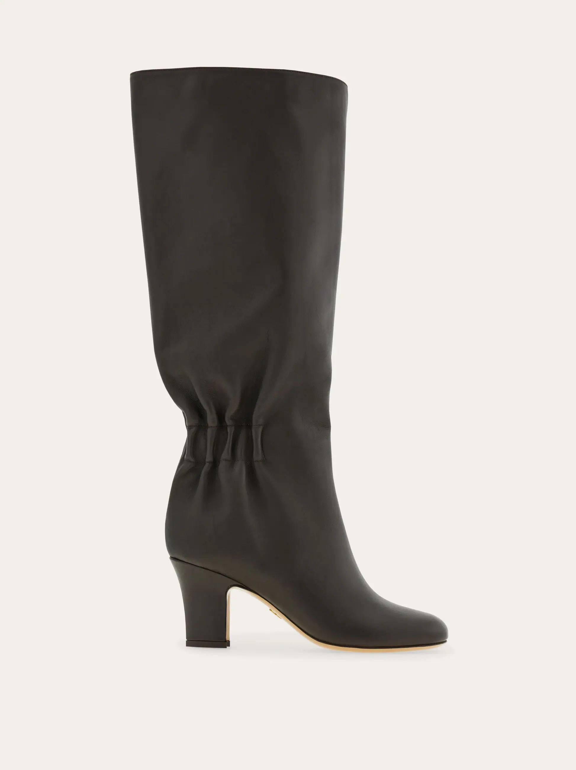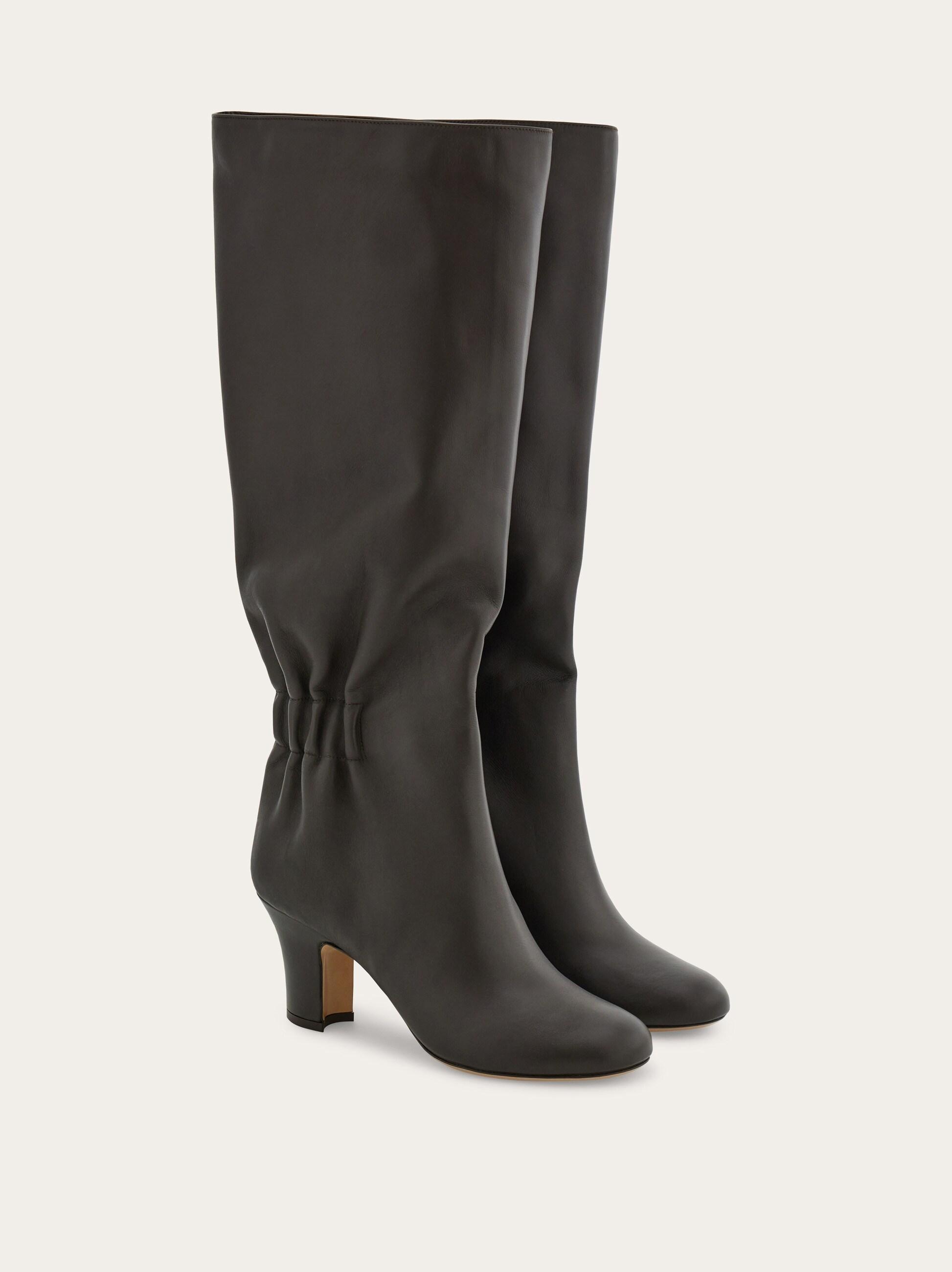 With its sophisticated, slouchy look, this knee boot promises to take your wardrobe in a stylish new direction. The square-toe profile is adorned with an oversized version of the Gancini motif in gleaming gold and set on a comfortable leather-covered block heel measuring 7 cm.