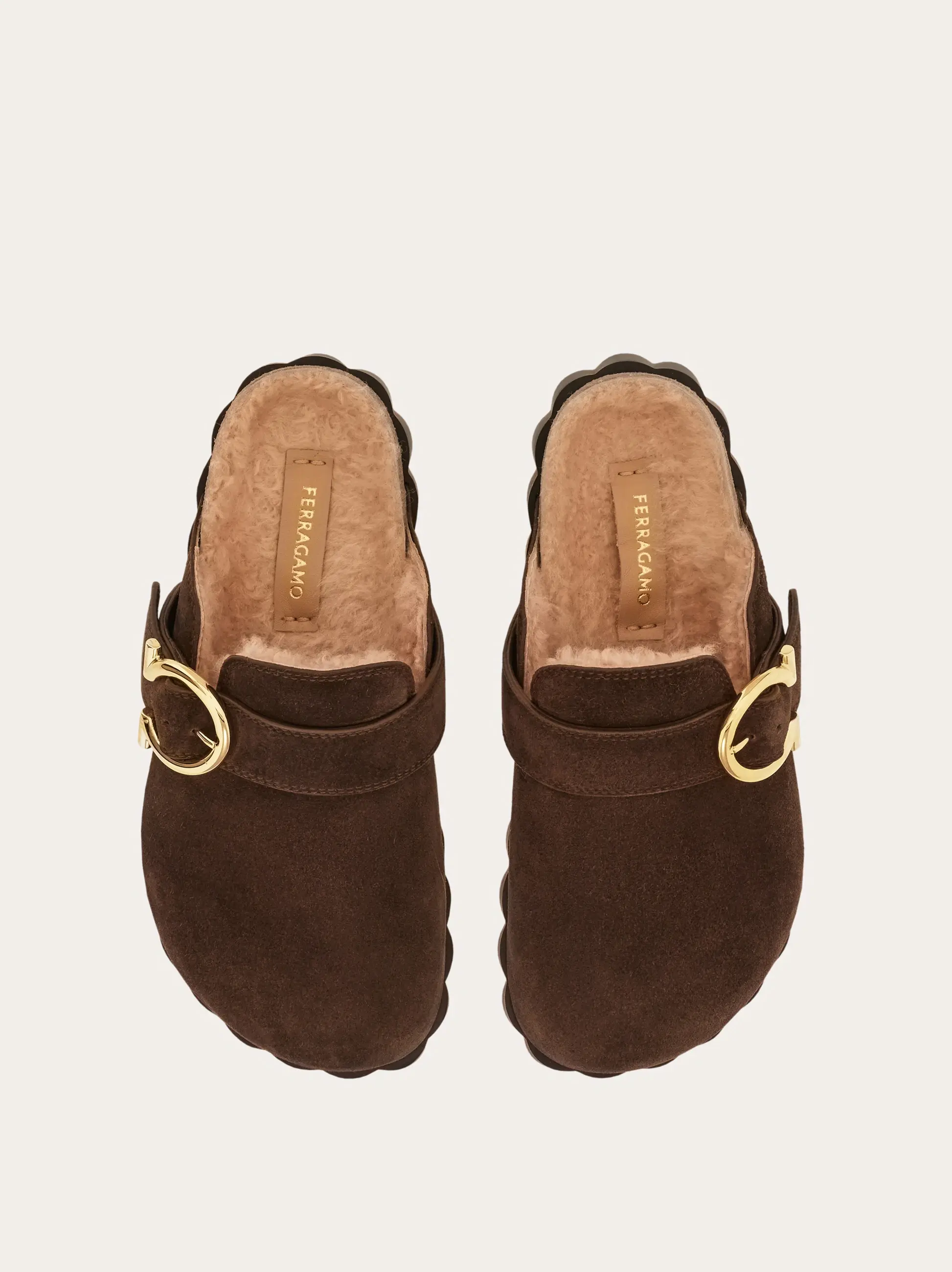 A fresh take on a timeless silhouette with iconic details. The soft suede upper of this slip on clog is pierced by a golden Gancio buckle, and the fluffy merino wool lining makes it warm and cosy. Inspired by the iconic Colonna heel, the chunky rubber sole is rippled all the way around.