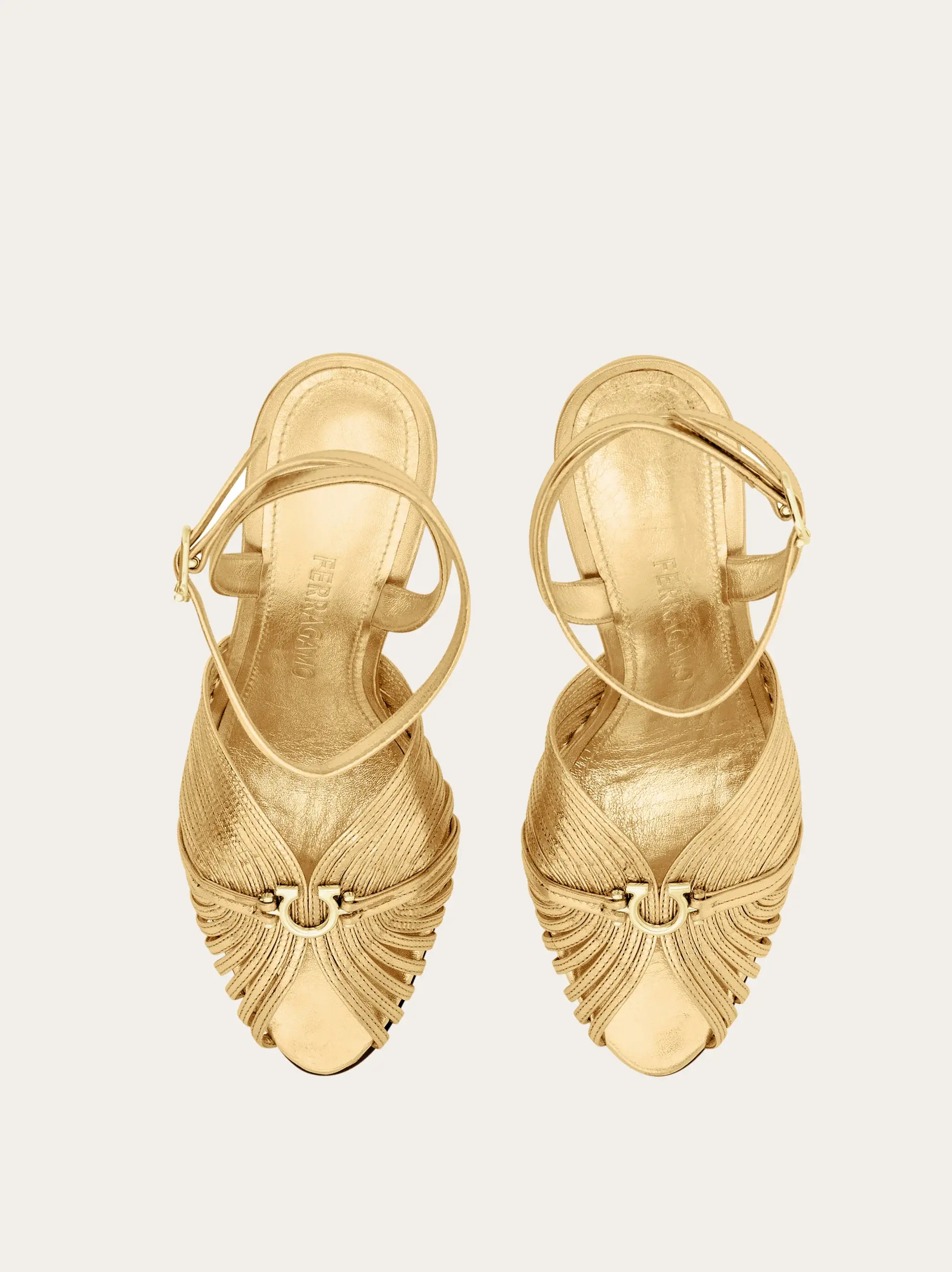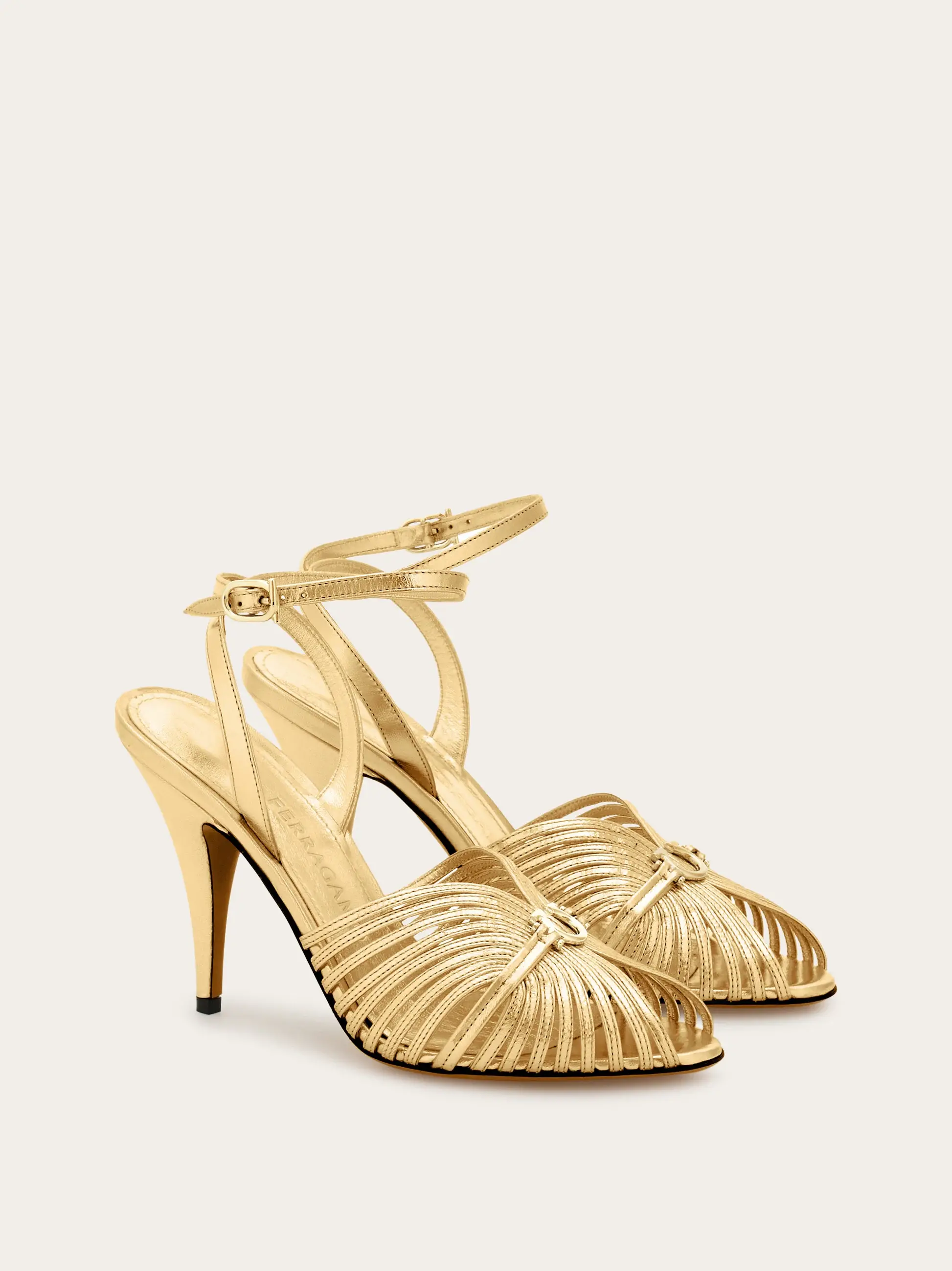 Maximilian Davis blends bold new femininity with Ferragamo's legendary legacy, and this retro-inspired sandal is proof. The sleek, strappy silhouette is held together by the signature golden Gancini and set on a spotlight-stealing tapered stiletto heel. Adjust the ankle strap to find your perfect fit.