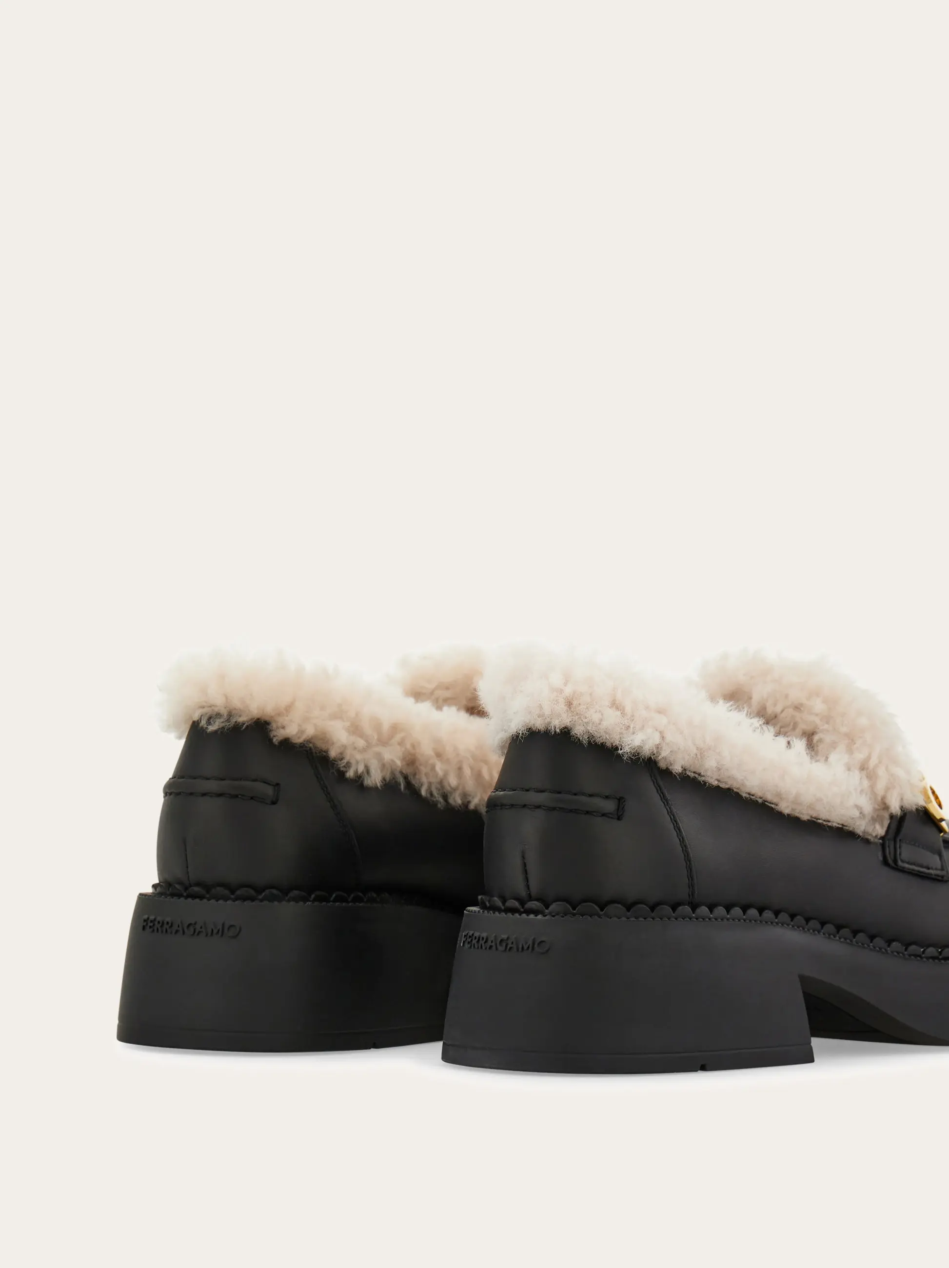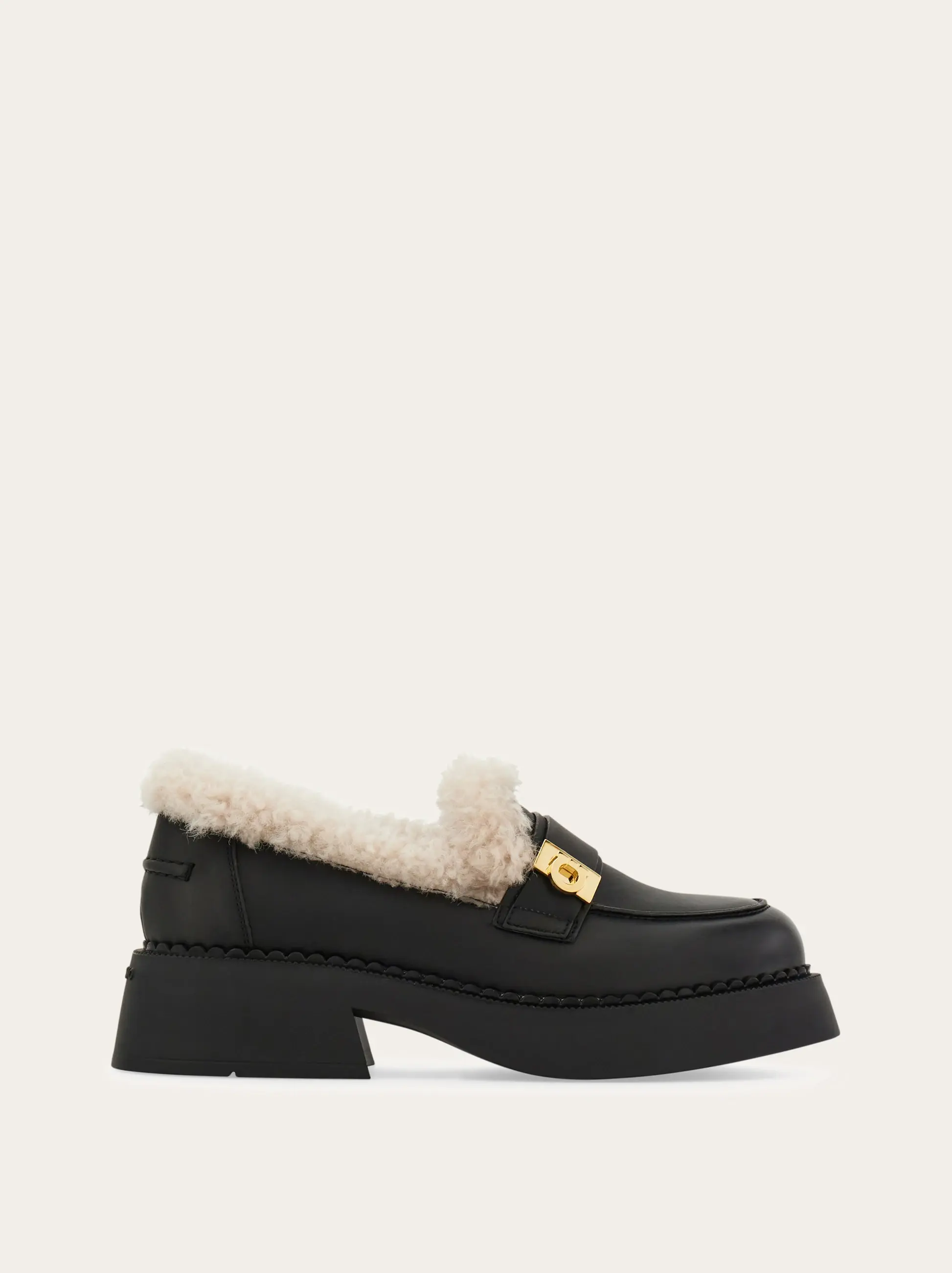 Tufts of sumptuous shearling burst from the opening of this contemporary loafer cut from the finest calfskin. The leather is pierced at the side of the instep by a golden Gancio buckle, set on a chunky ultra-light rubber sole with diagonal slit on the heel.