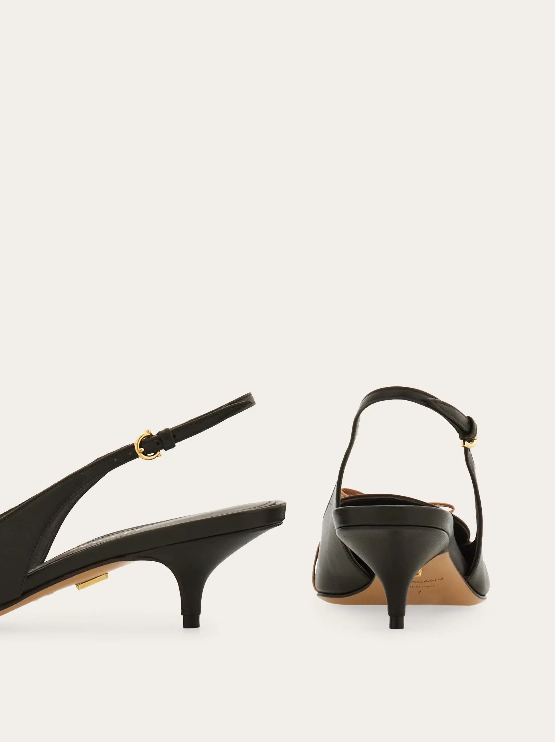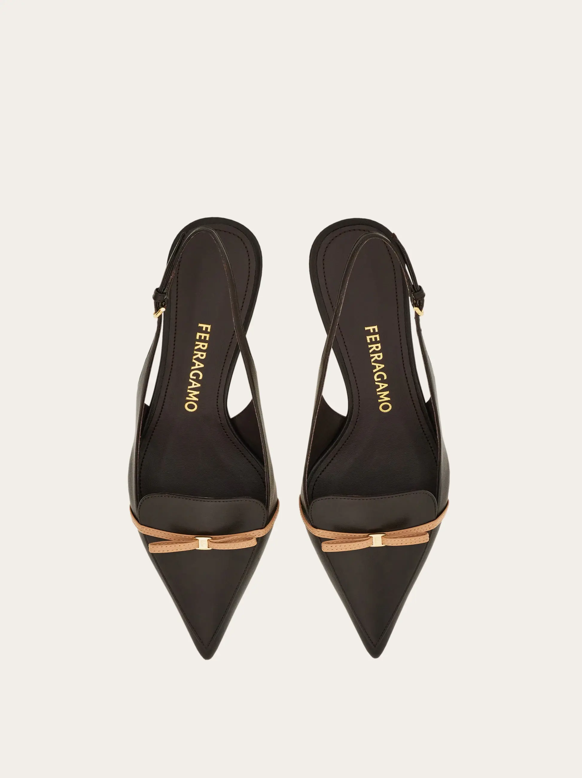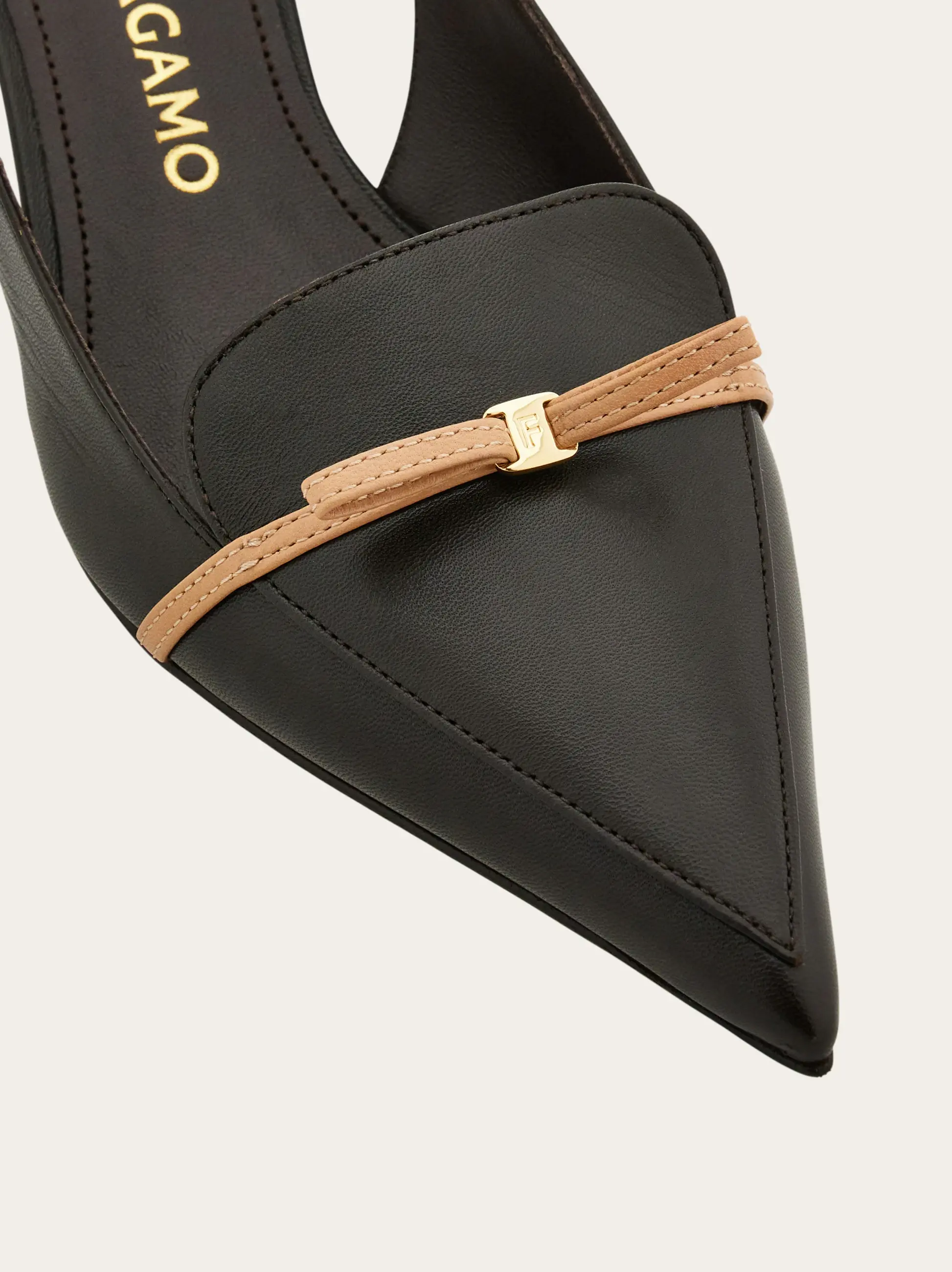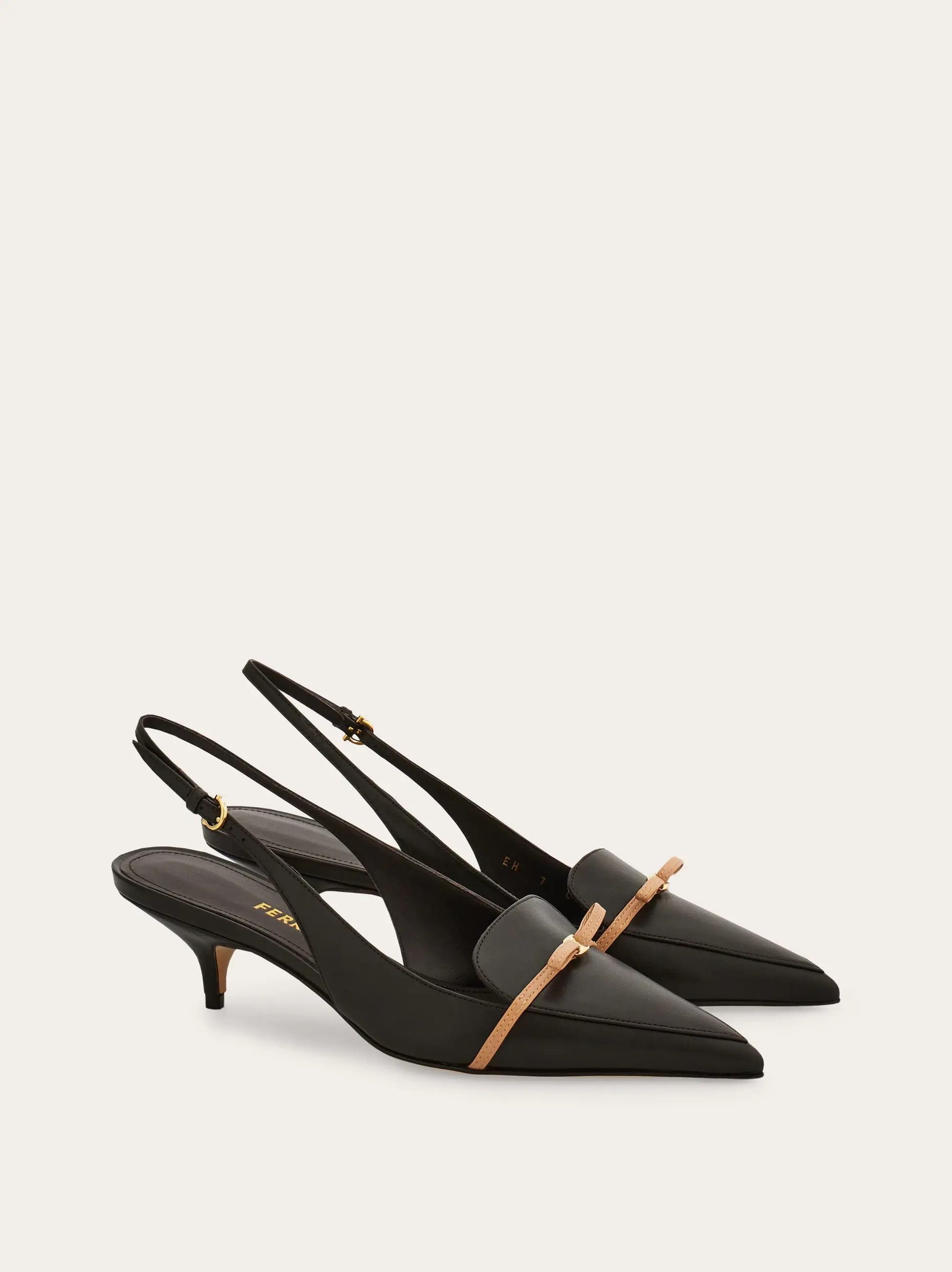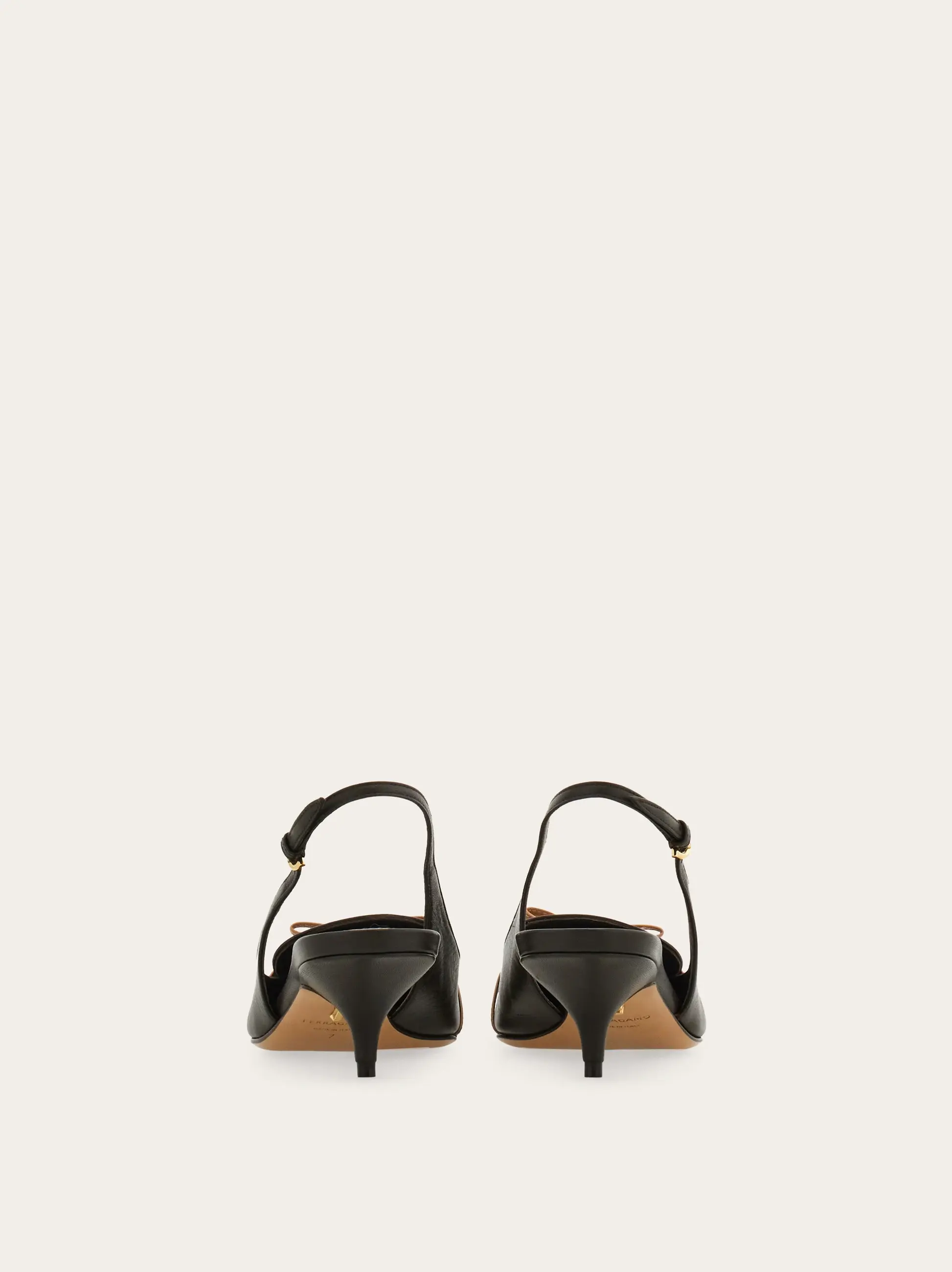 With a pointed tip and slim contrasting micro bow, this new Ferragamo slingback means business. Supple and refined, the kid leather upper has a loafer-like cut with double stitching, while the slim covered heel stands at a comfortable mid height.