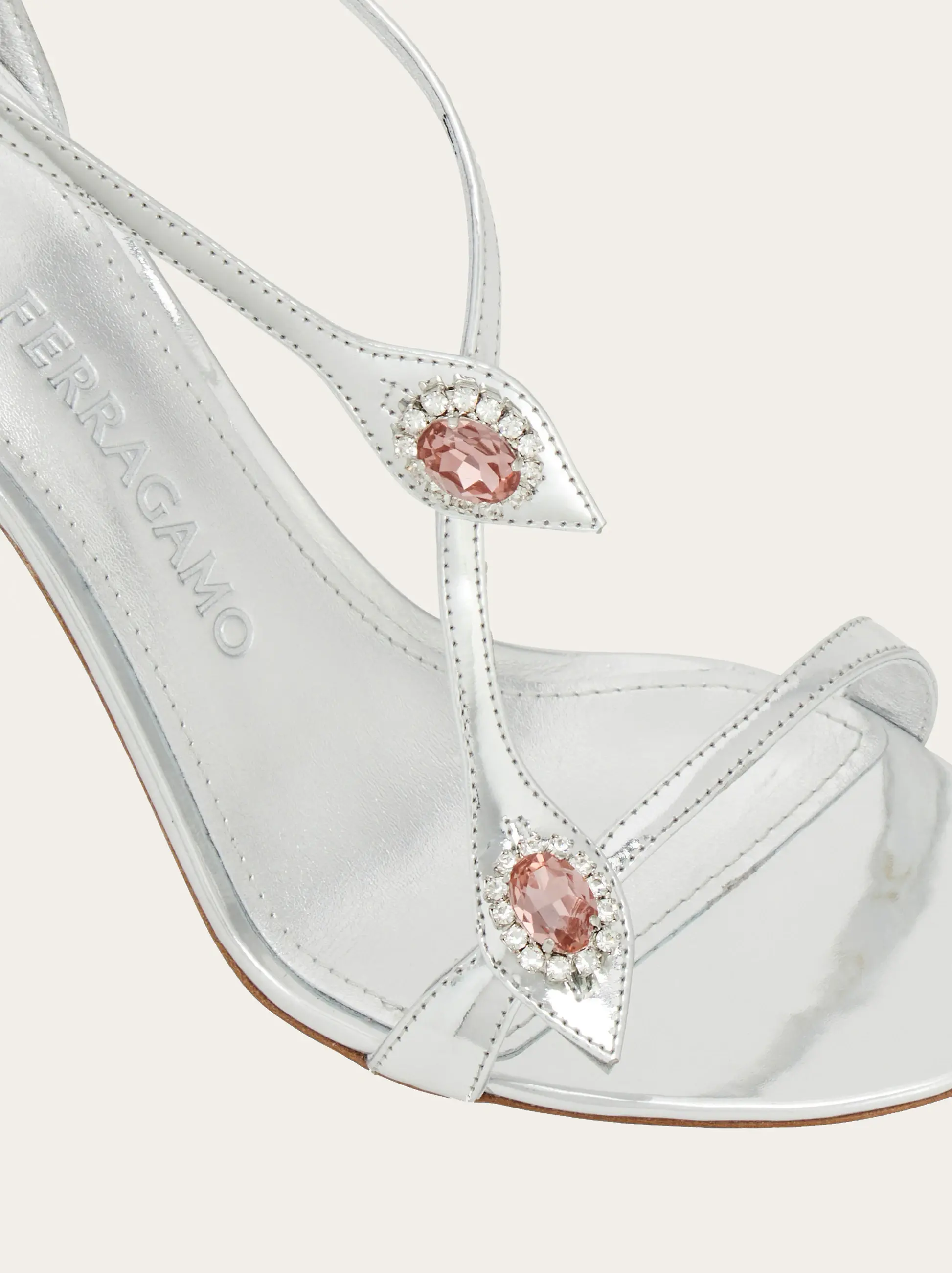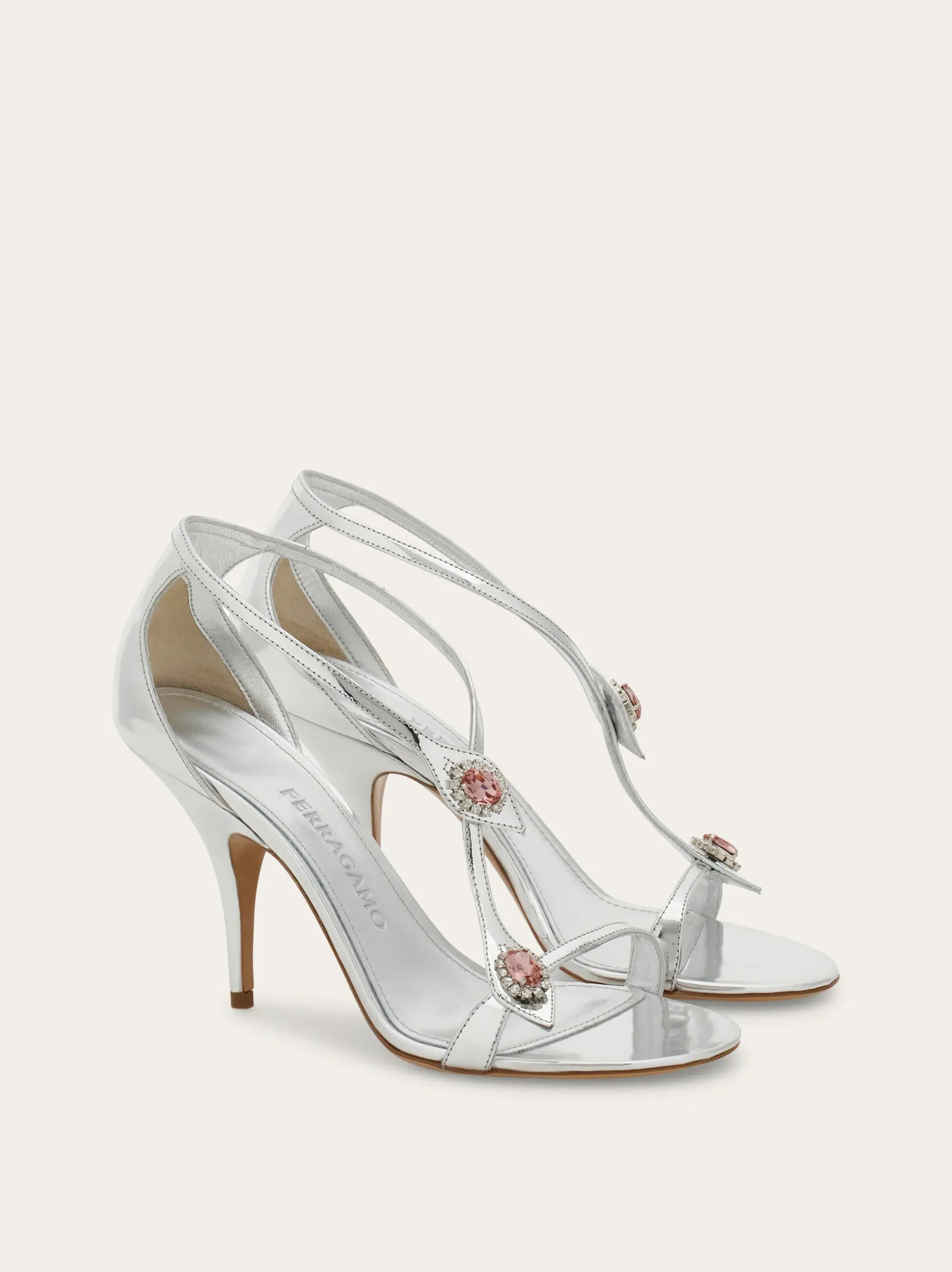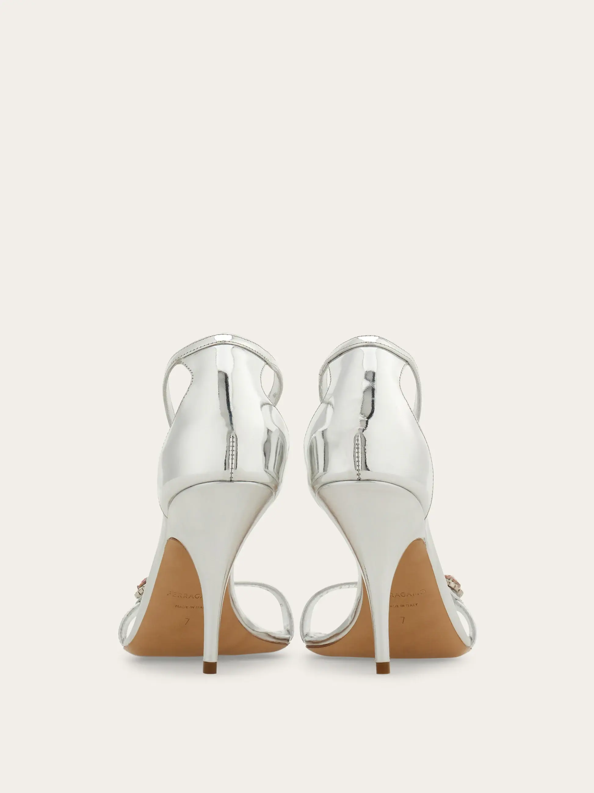 Showstopping sandal made from laminated calfskin leather with a cool silver shimmer. The sensual silhouette features three strategically placed straps adorned with flower-shaped cabochon crystals for an ultra-glam finish. The slim contoured heel recalls a shoe designed by Salvatore Ferragamo for Marilyn Monroe.