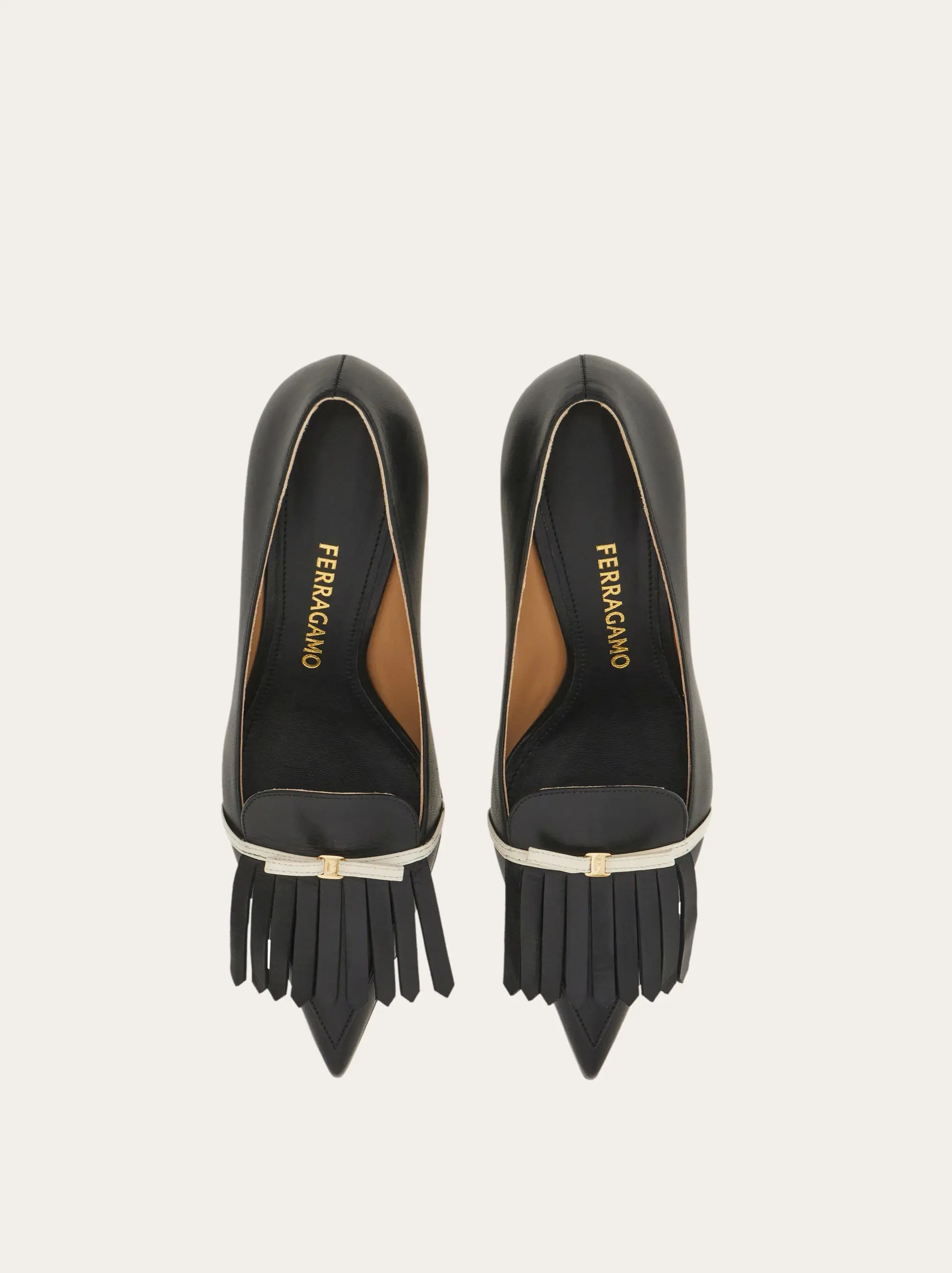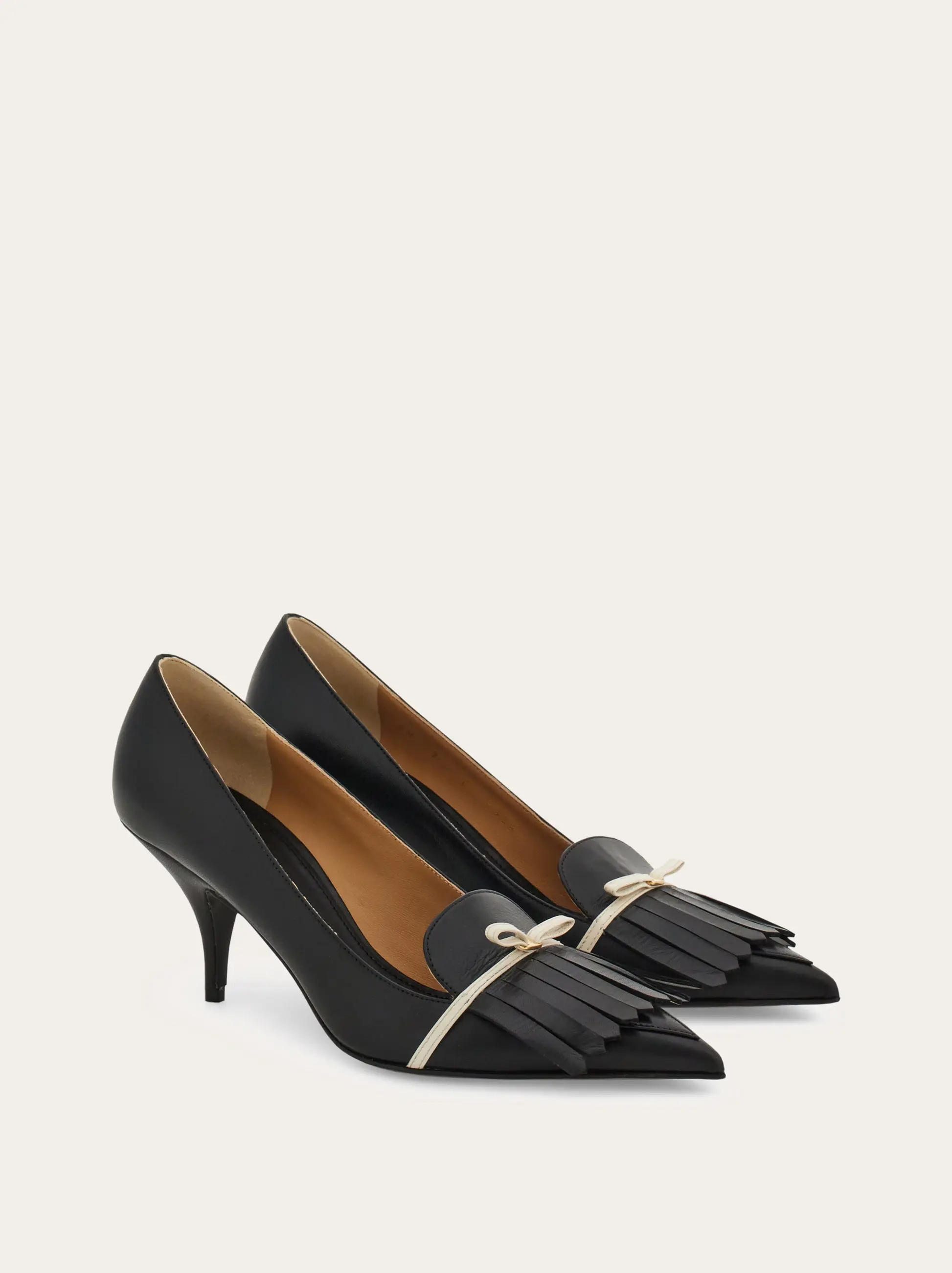 Cut from the softest kid leather, this new Ferragamo pump is the perfect blend of uptown chic and effortless femininity. The slim mini bow cuts across the tip where a loafer inspired fringe detail adds a preppy twist. The curved heel is the ideal height for all day comfort.