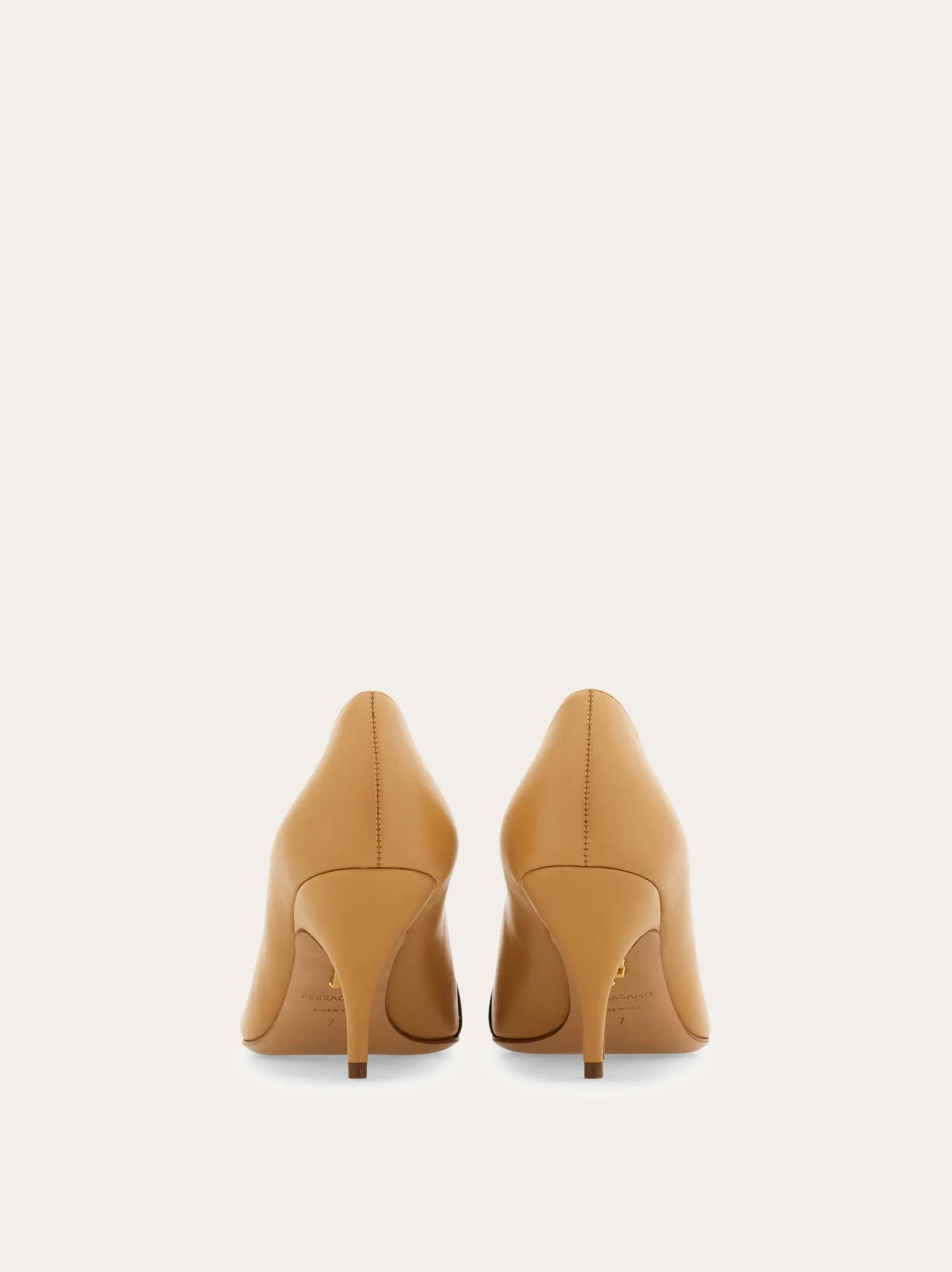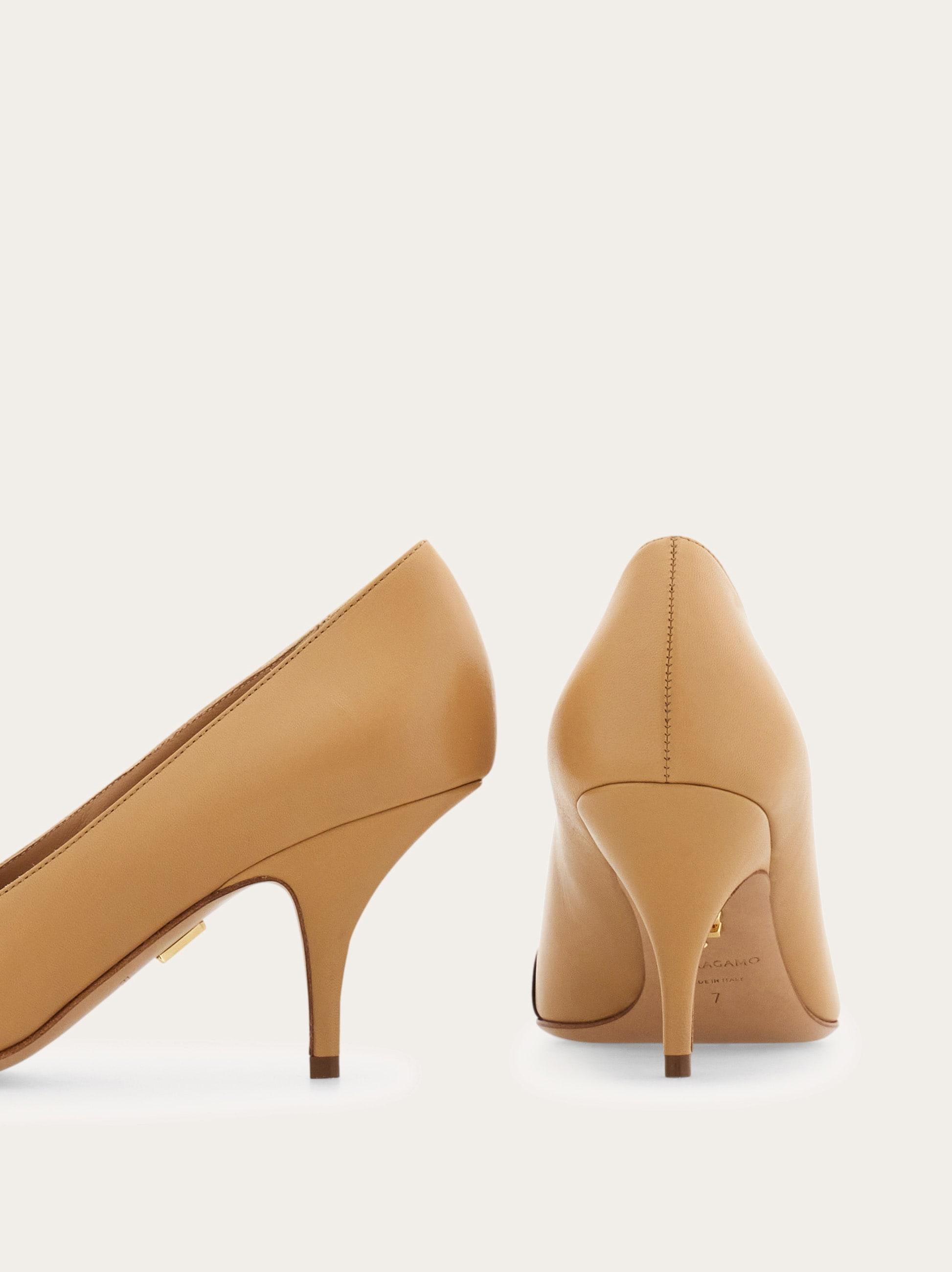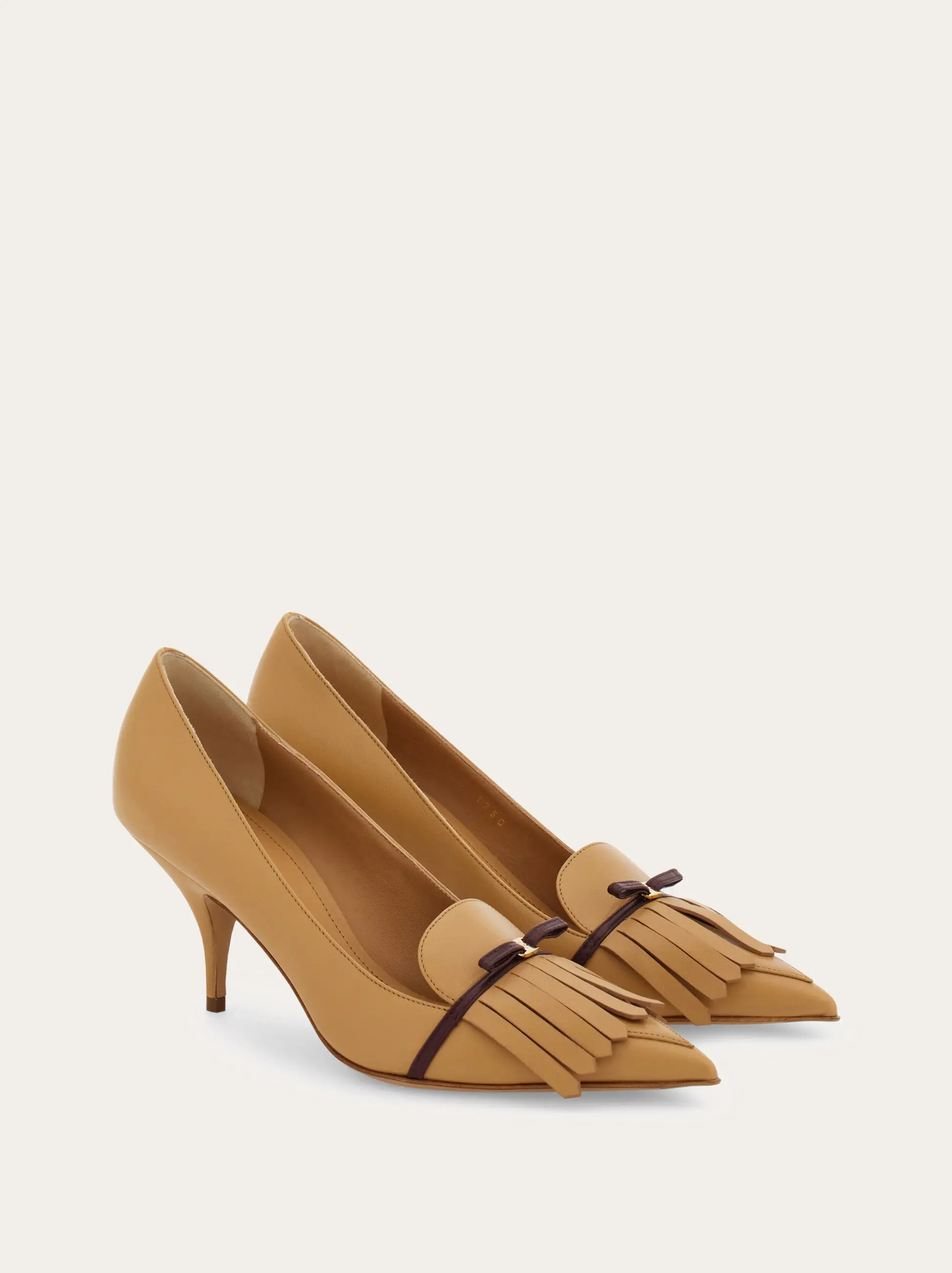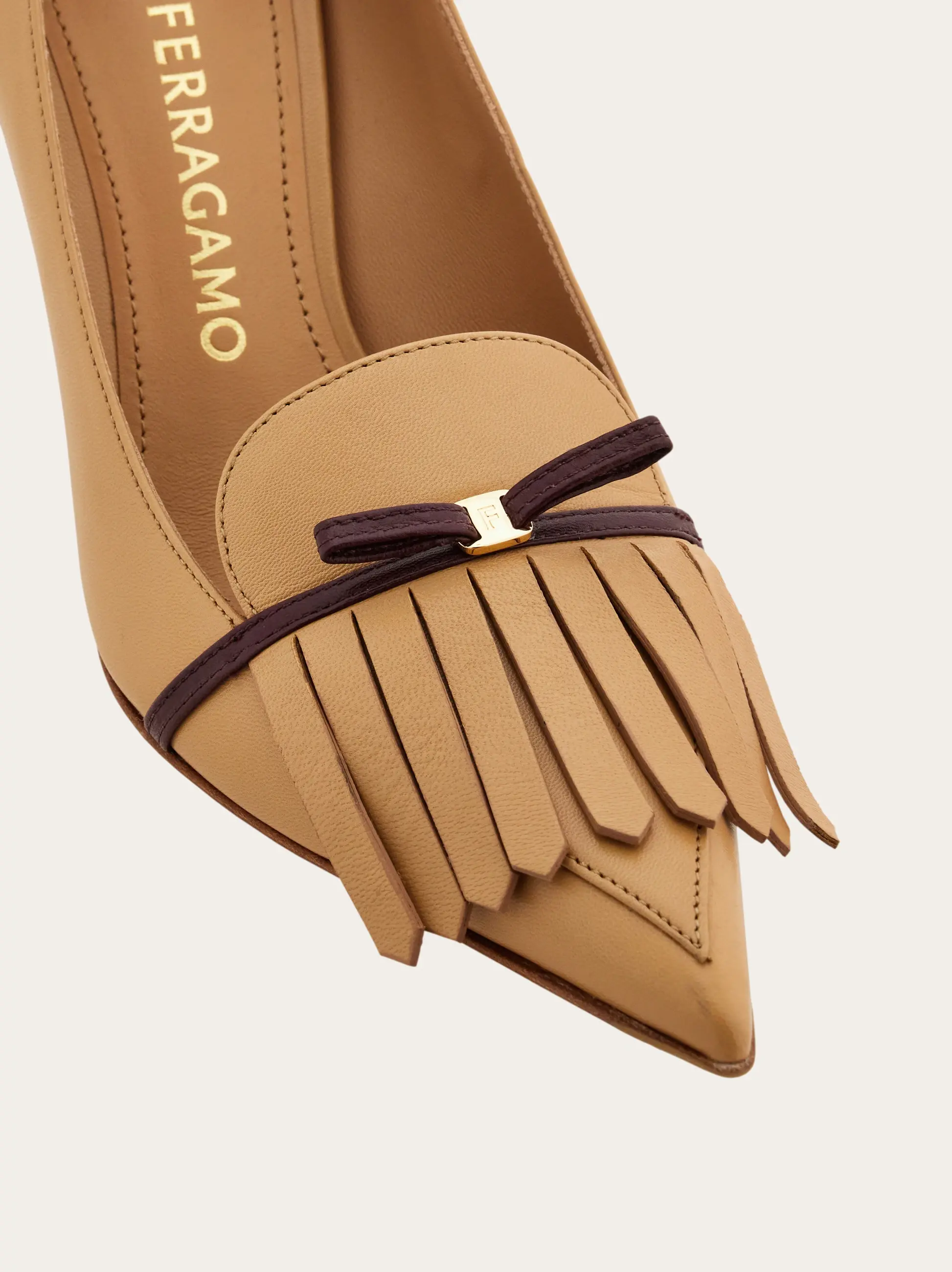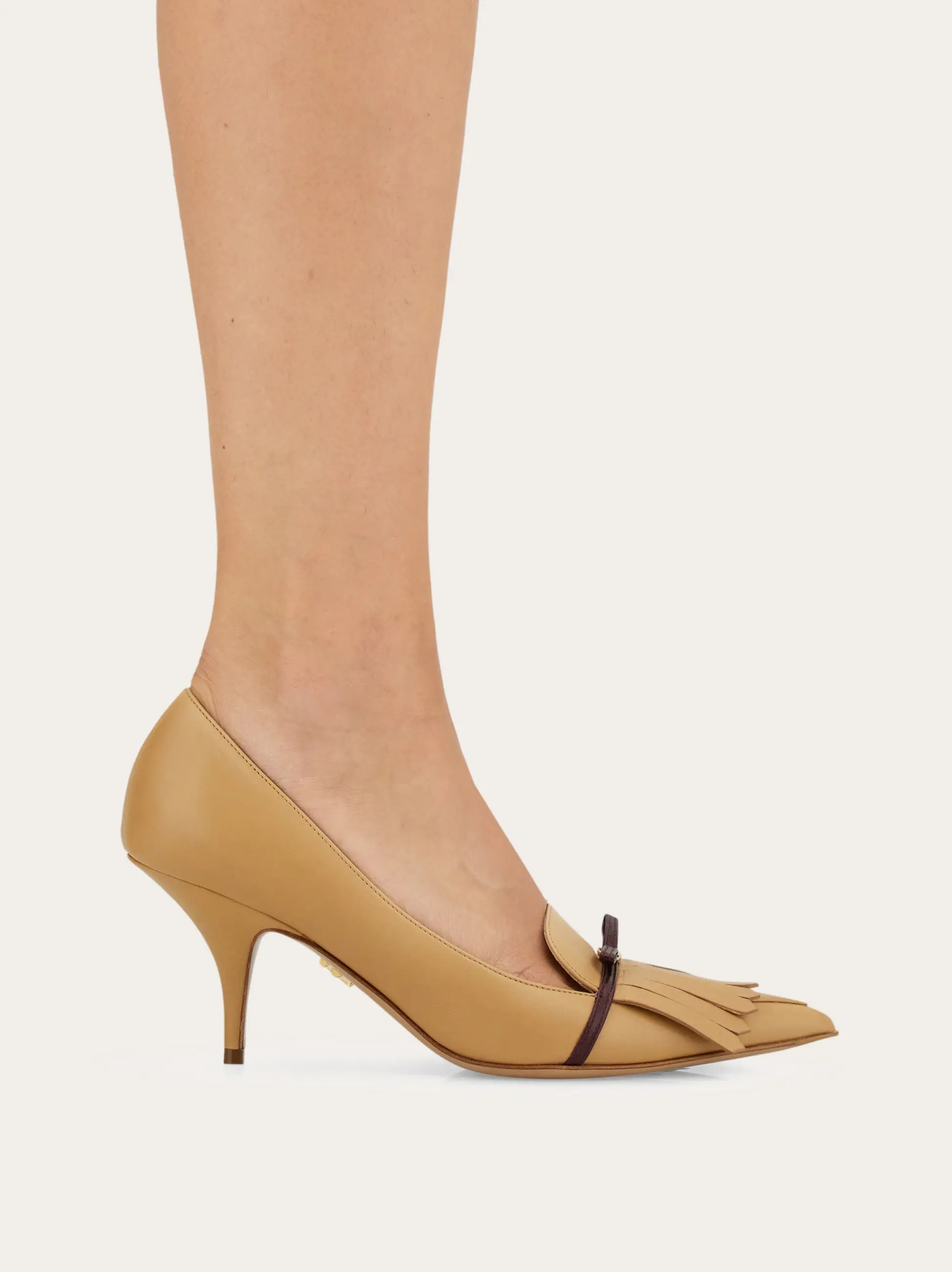 Cut from the softest kid leather, this new Ferragamo pump is the perfect blend of uptown chic and effortless femininity. The slim mini bow cuts across the tip where a loafer inspired fringe detail adds a preppy twist. The curved heel is the ideal height for all day comfort.