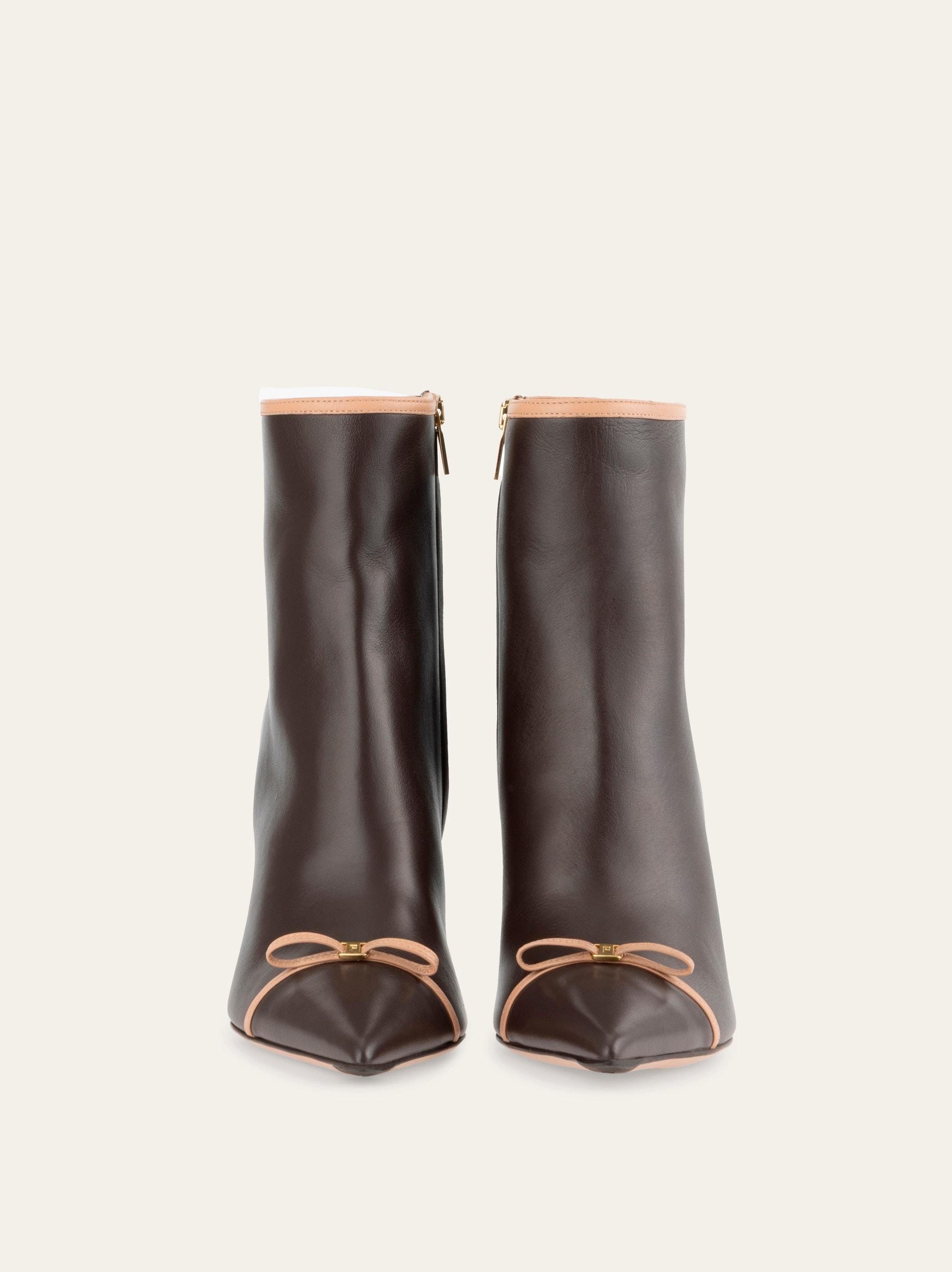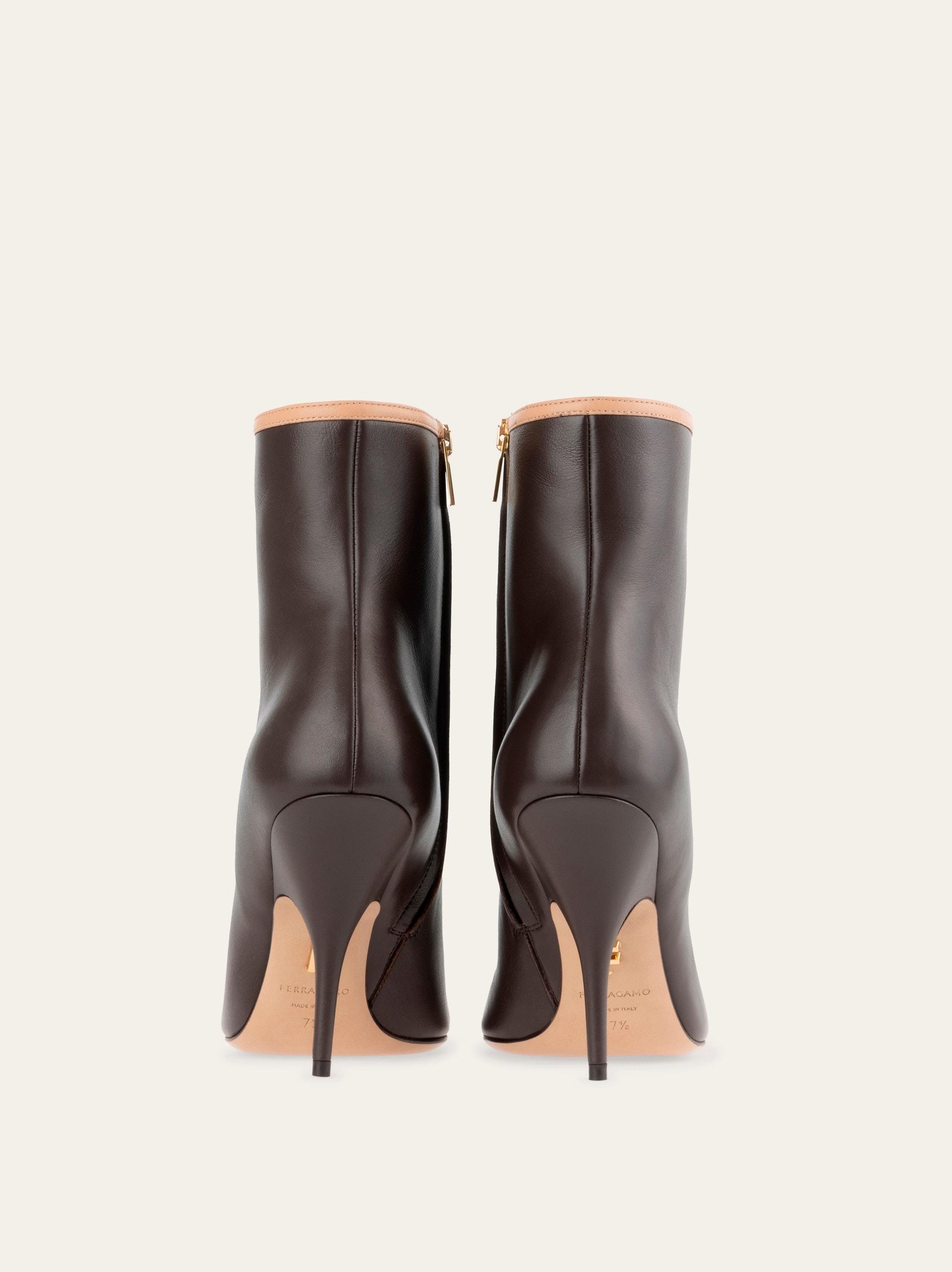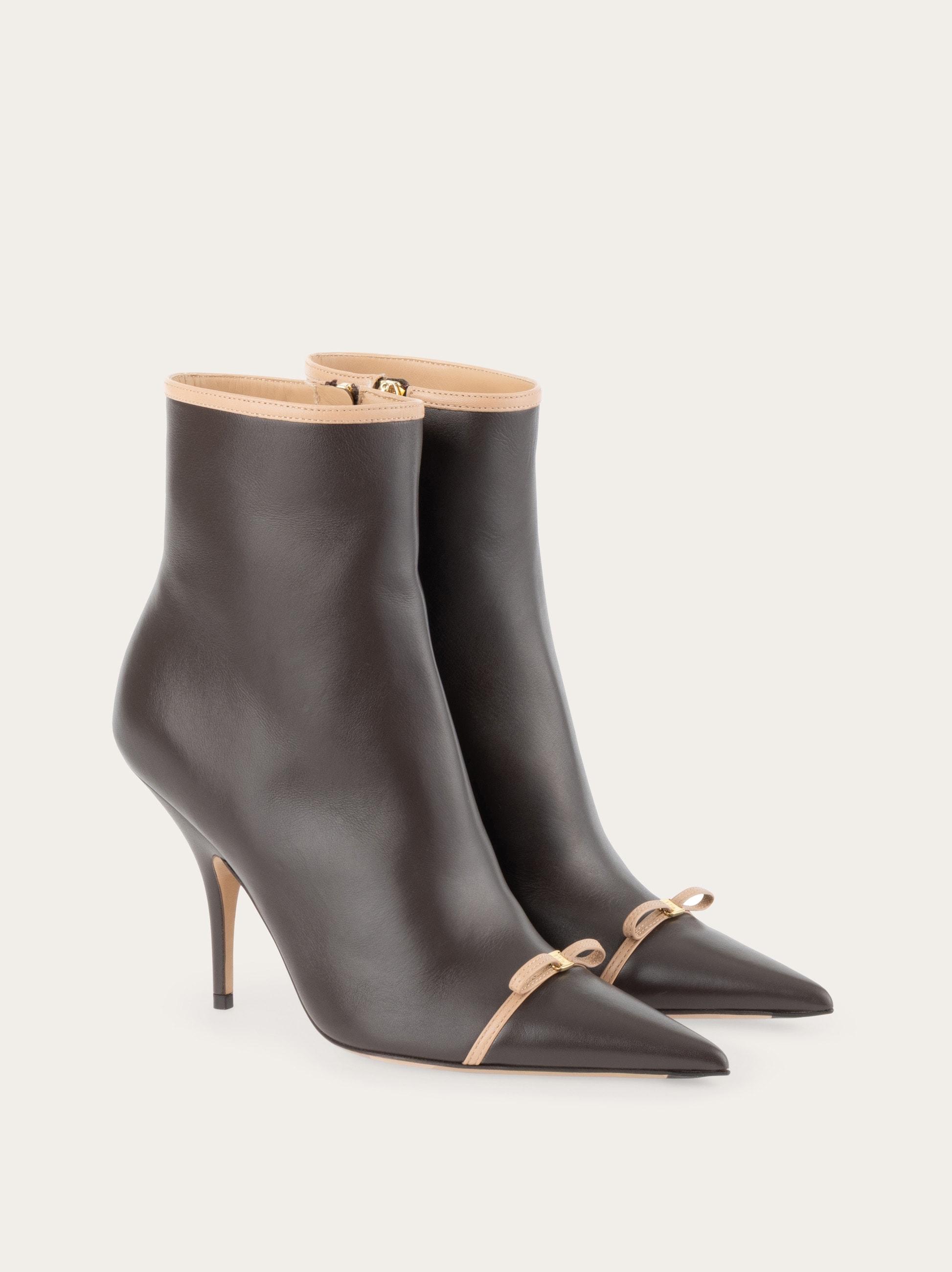 Ladylike and contemporary with just the right amount of grit. This new Ferragamo ankle boot is set on a slim mid heel with a tonal zip at the ankle for a glove-like fit. Contrasting piping and a mini bow across the toe add a touch of modern romance.