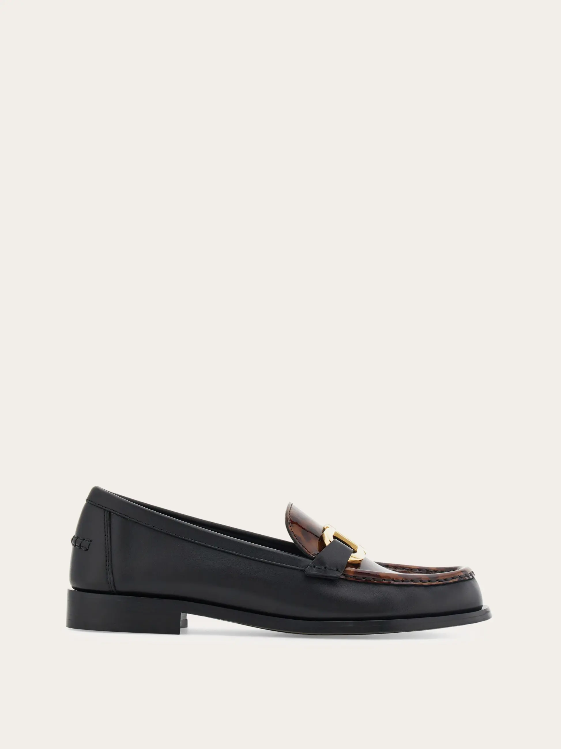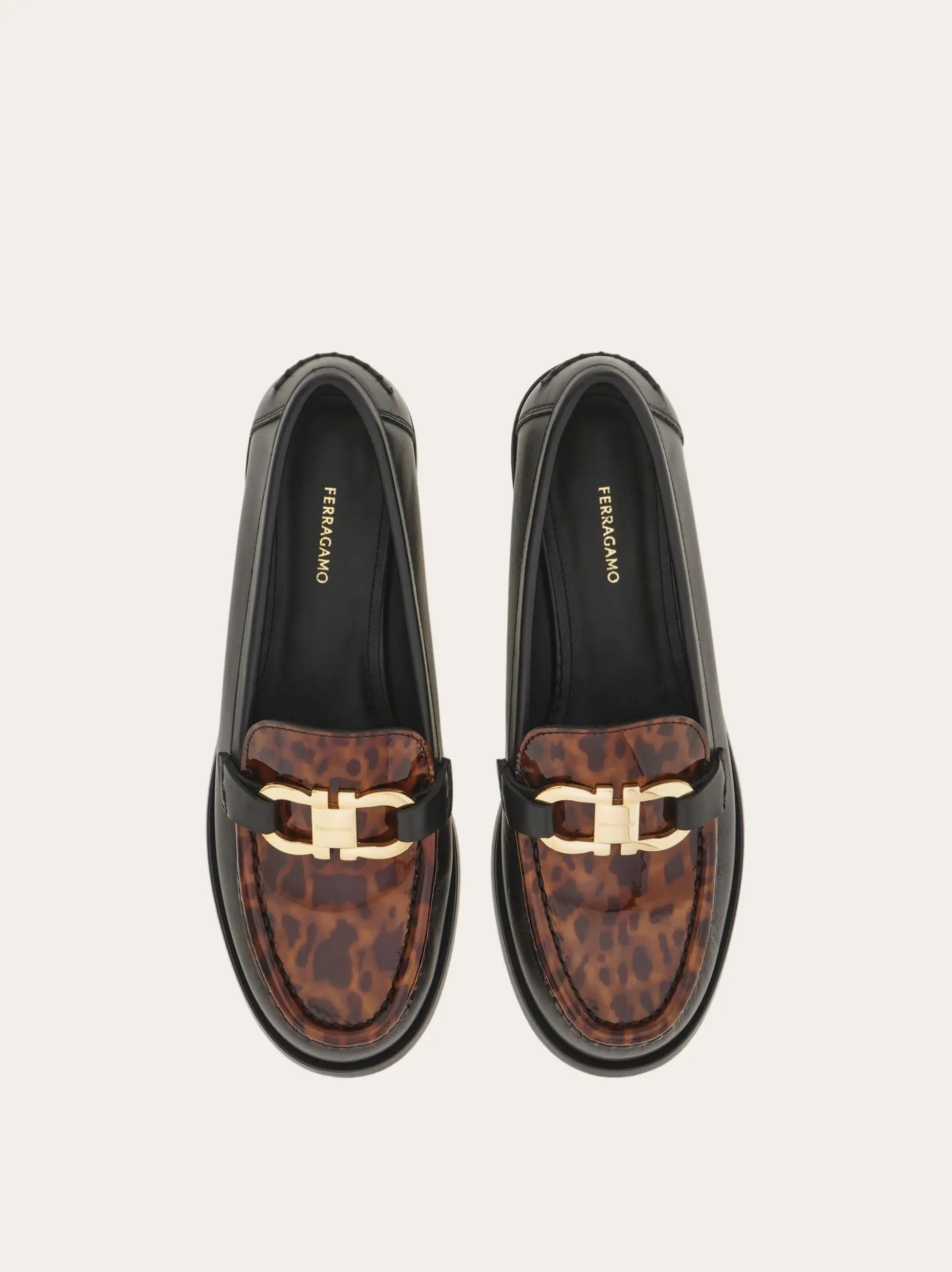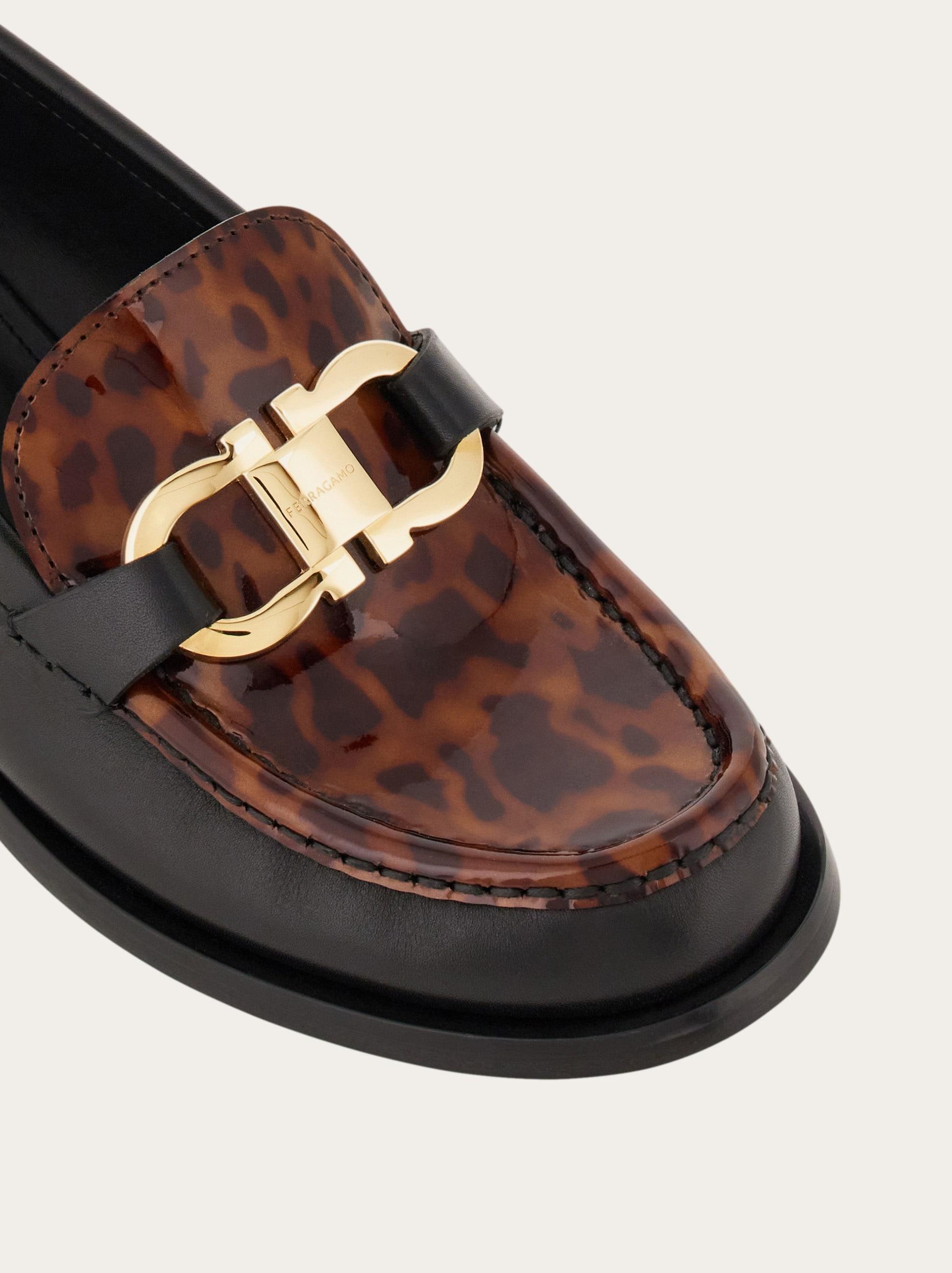 The luxurious tortoiseshell motif on the patent leather vamp confirms the exclusive feel of this new Ferragamo loafer. Topped with a golden Gancio across the instep, the classic loafer elements are all present and correct: raised stitching around the toe and heel and a luxurious leather sole.