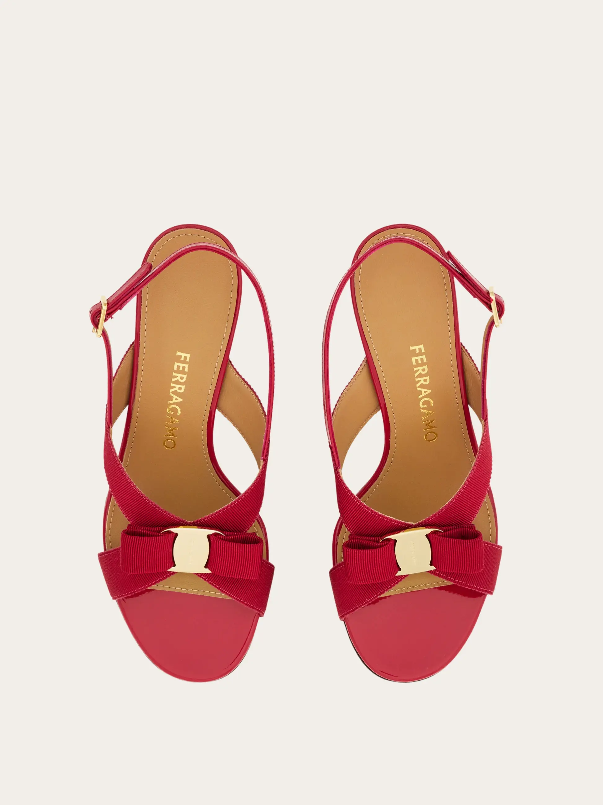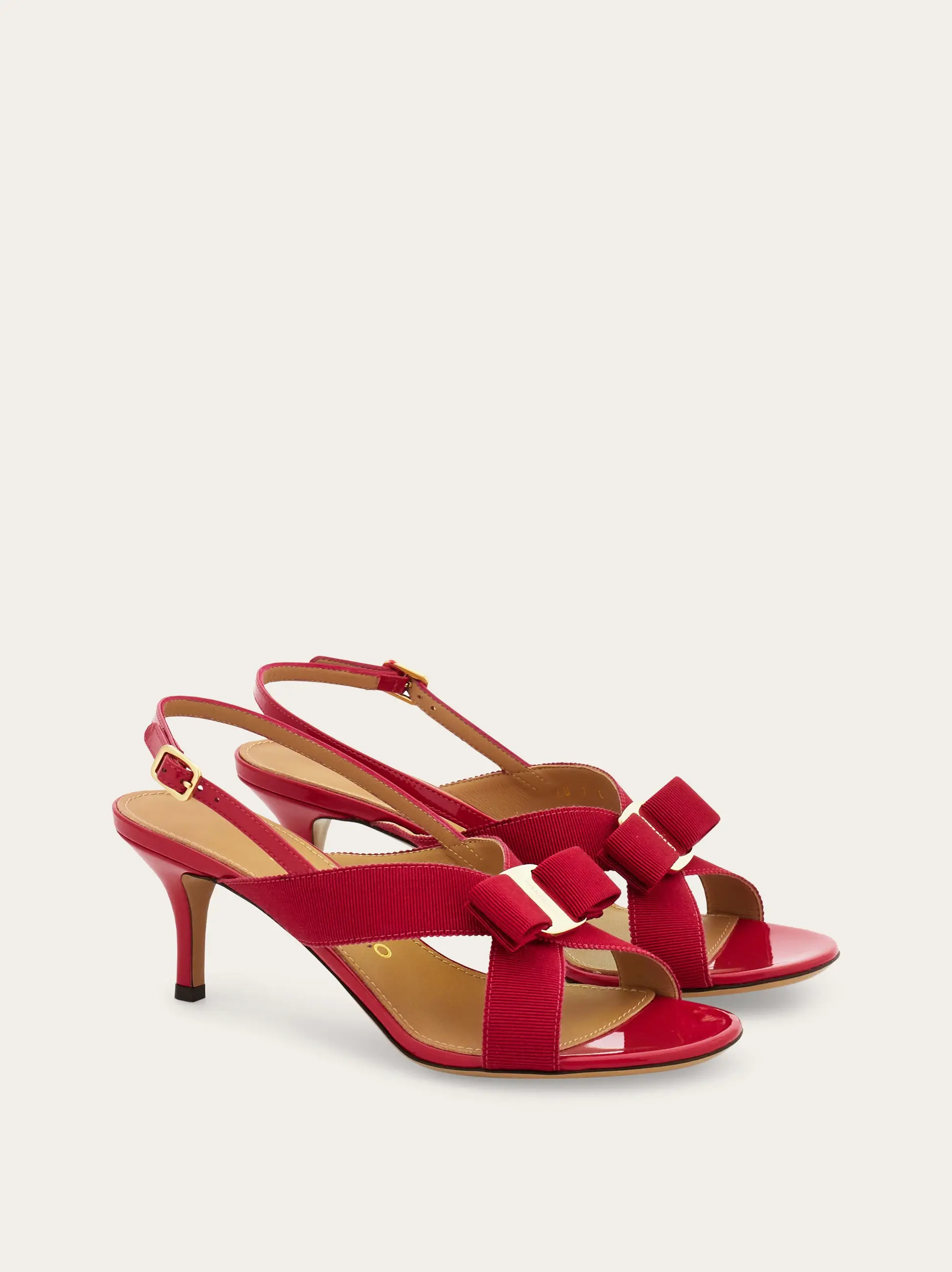 A classic silhouette with a contemporary twist: the new Ferragamo sandal with iconic grosgrain Vara bow. The enveloping grosgrain straps, adjustable slingback with buckle and mid-height curved heel ensure a comfortable fit.