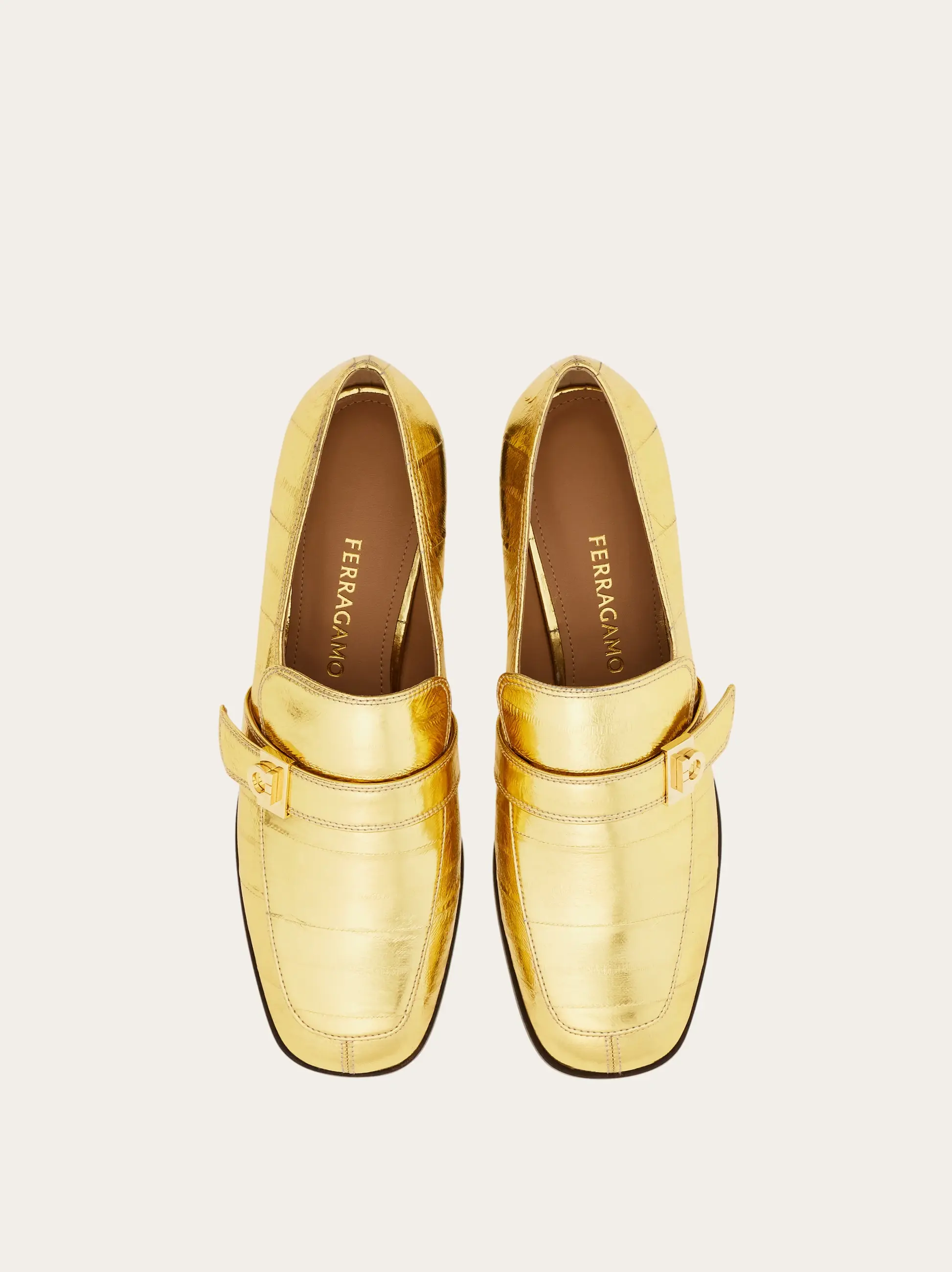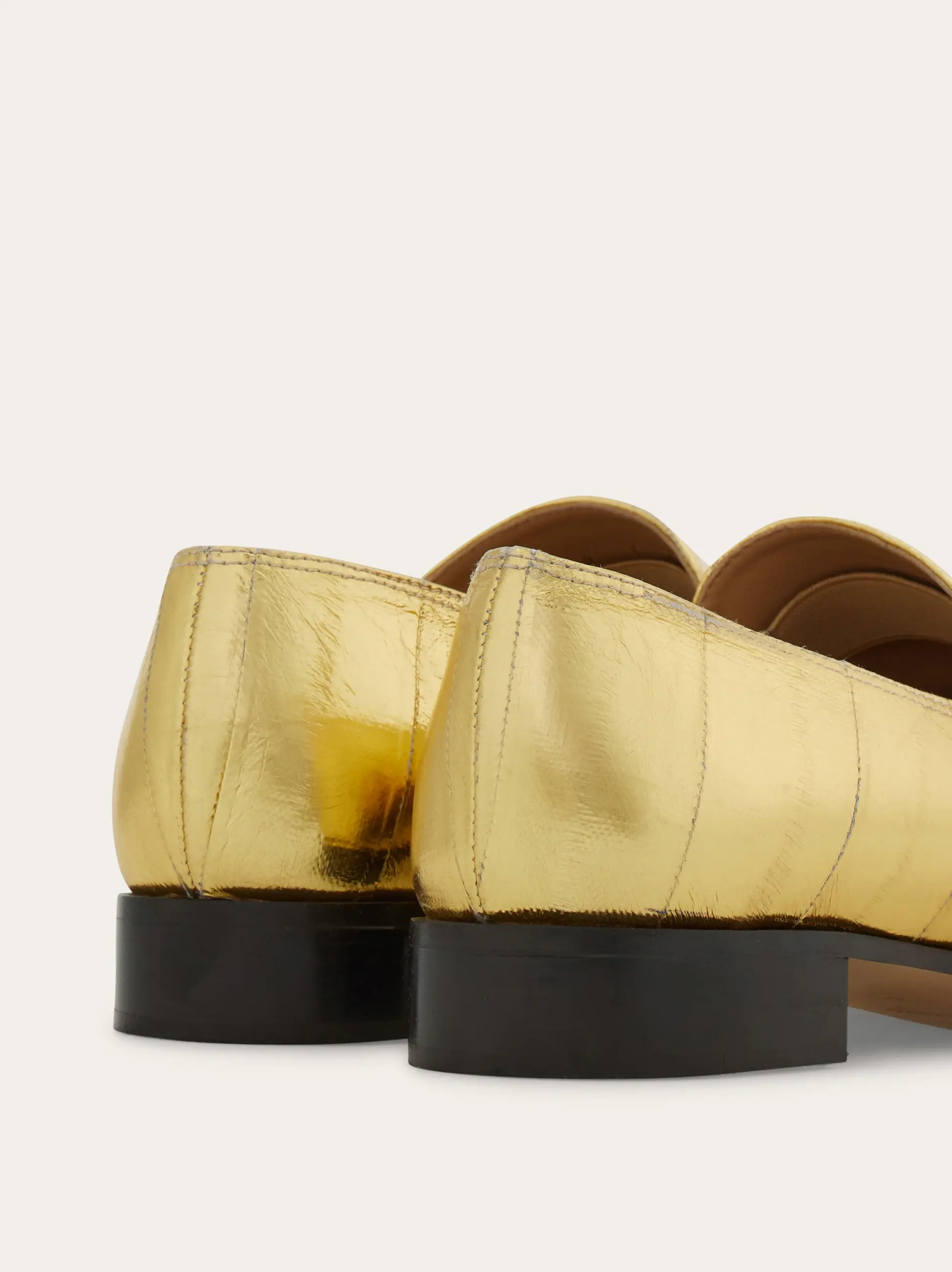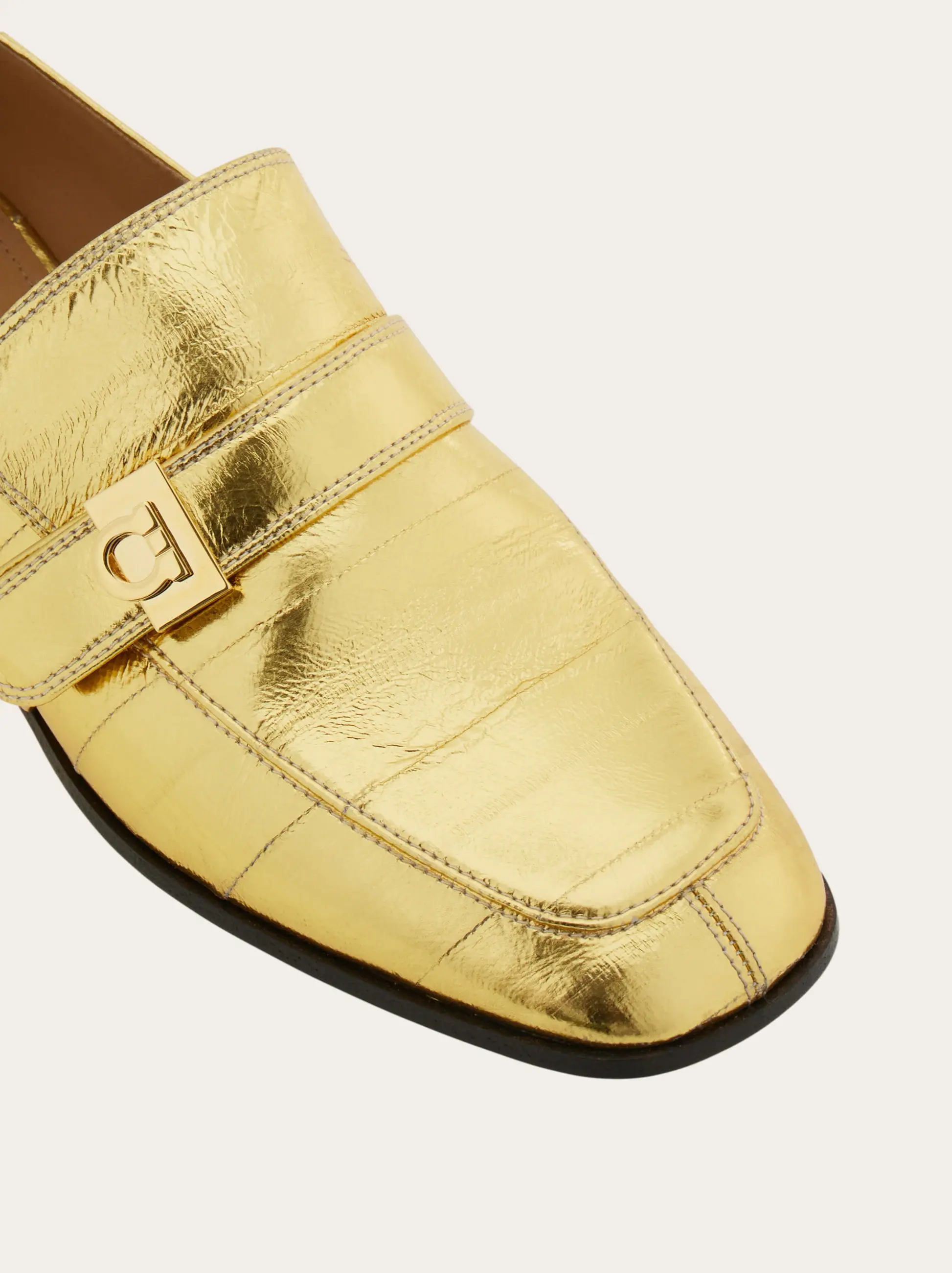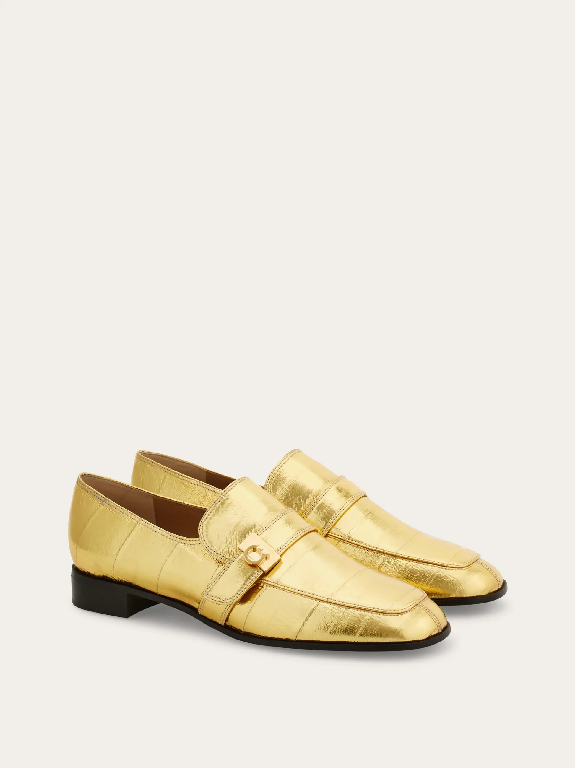 A masculine silhouette with a feminine feel, this new Ferragamo slip on glows in laminated eel leather. The golden upper is punctuated by visible stitching and detailed with a tonal Hug buckle at the side of the instep. Leather sole with rubber island for impeccable grip even on the dancefloor.