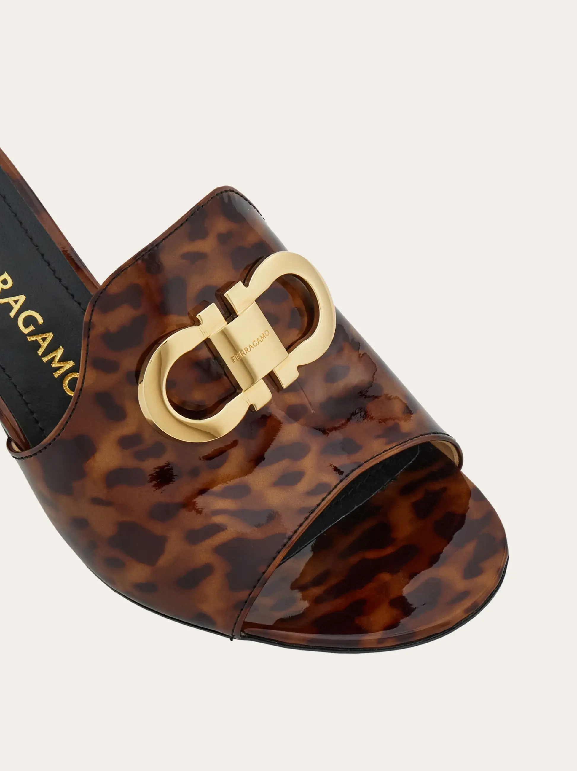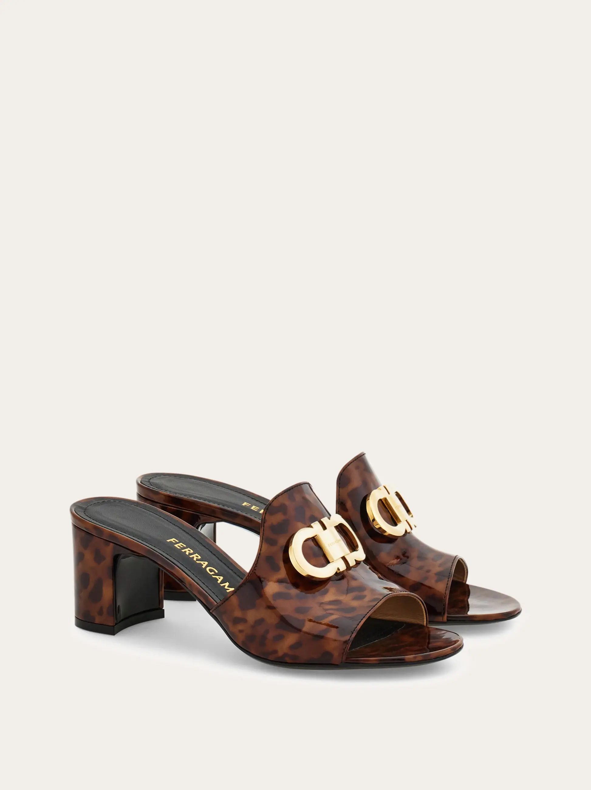 Slinky and easy to wear thanks to the mid-height block heel, this new Ferragamo mule is cut from patent calfskin with a high shine finish. The glow of the luxurious leather is detailed with a golden Gancio buckle across the instep, and the soft inner curve of the heel echoes a directional feel.