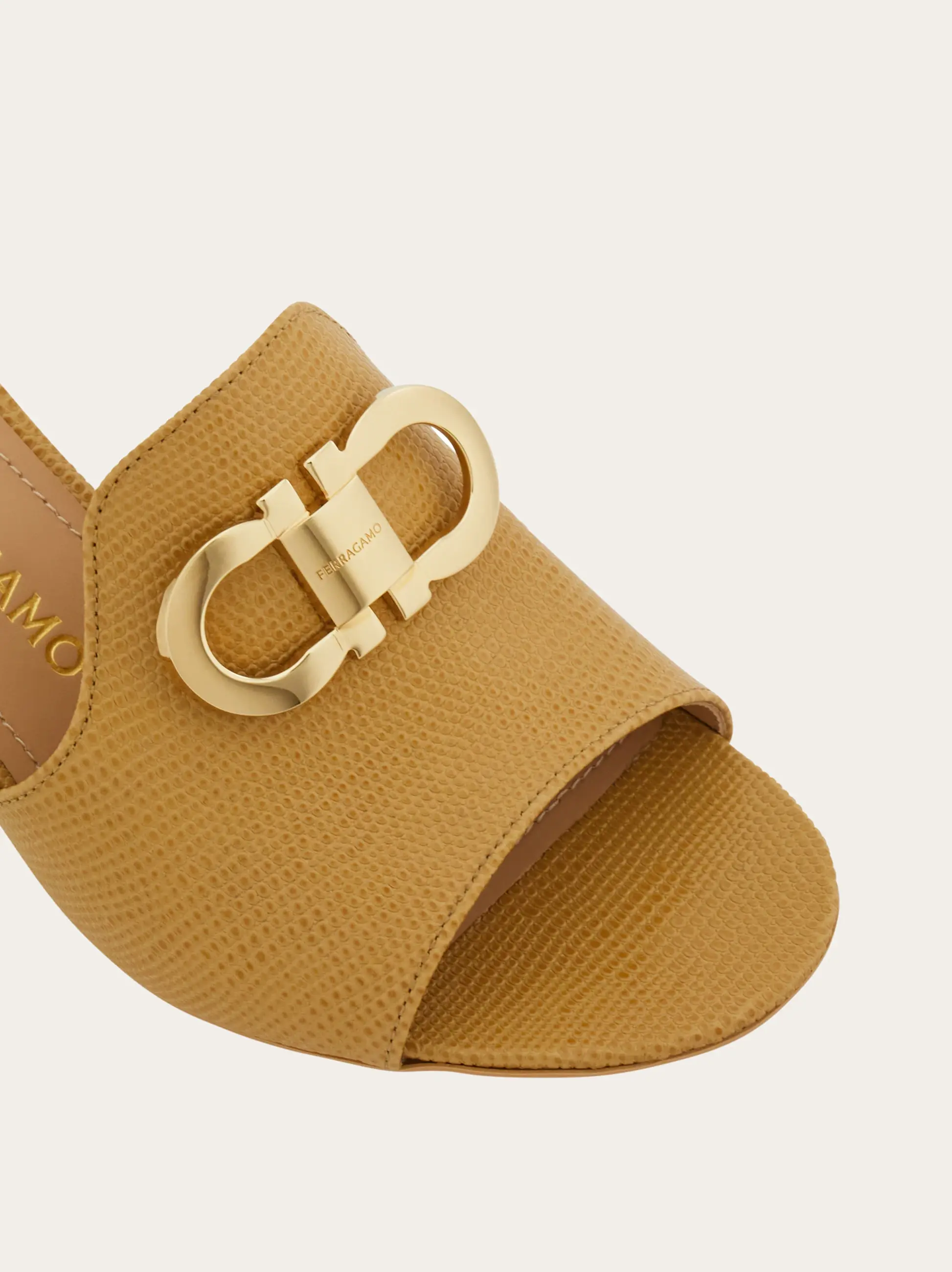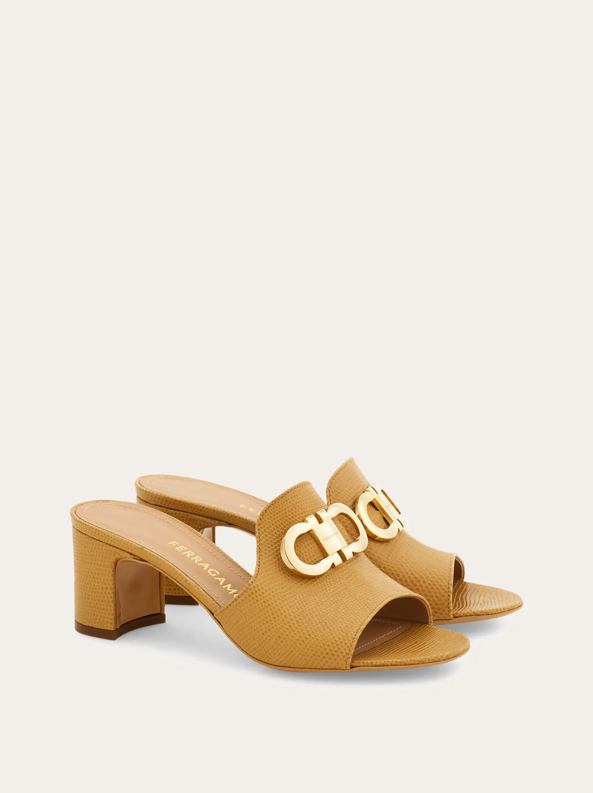 Slinky and easy to wear thanks to the mid-height block heel, this new Ferragamo mule is cut from soft, Italian calfskin. The leather is printed with a lizard motif whose high-glam look is detailed with a golden Gancio buckle across the instep, and the soft inner curve of the heel echoes a directional feel.