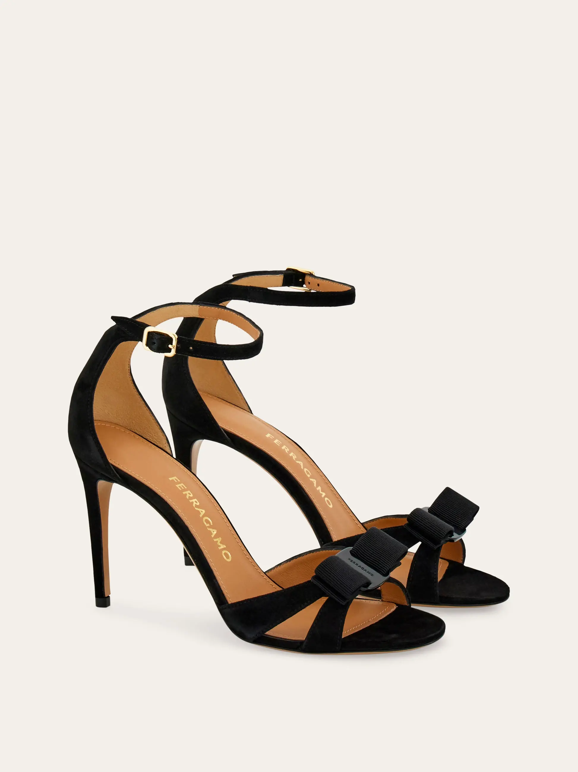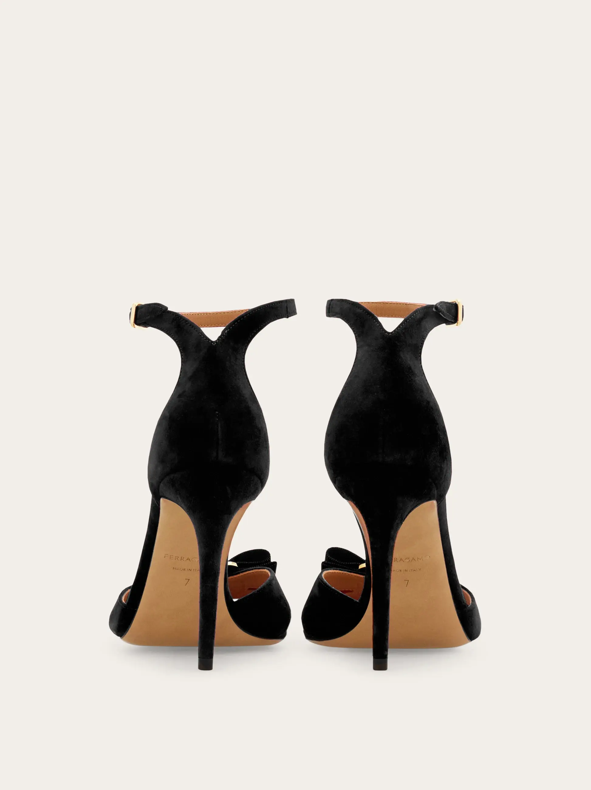 A sensual silhouette with something of an effortless flair, this new Ferragamo sandal is the perfect balance of high-end ladylike glamour and cool girl nonchalance. The slim toe straps are topped with a tonal gros grain Vara bow and the ankle strap is cut in a sensual V-shape at the heel. They make it look so easy. Slim tonal covered heel.