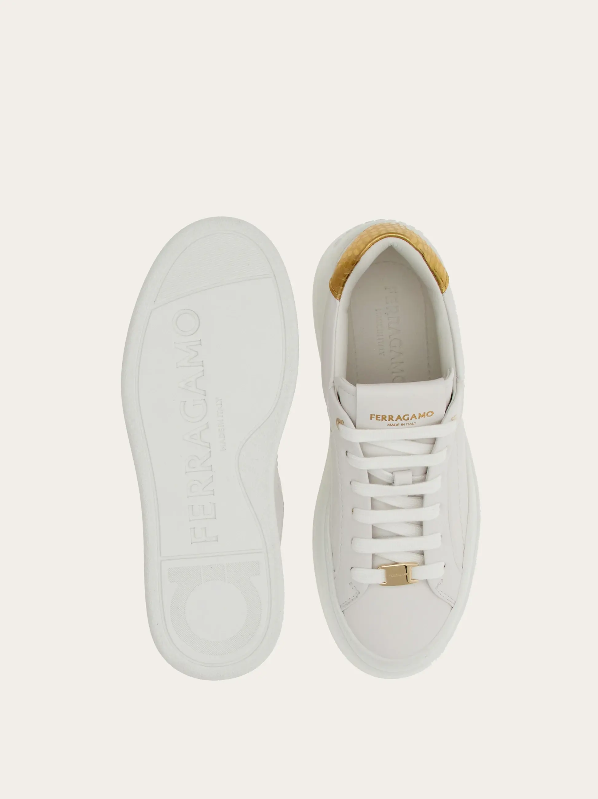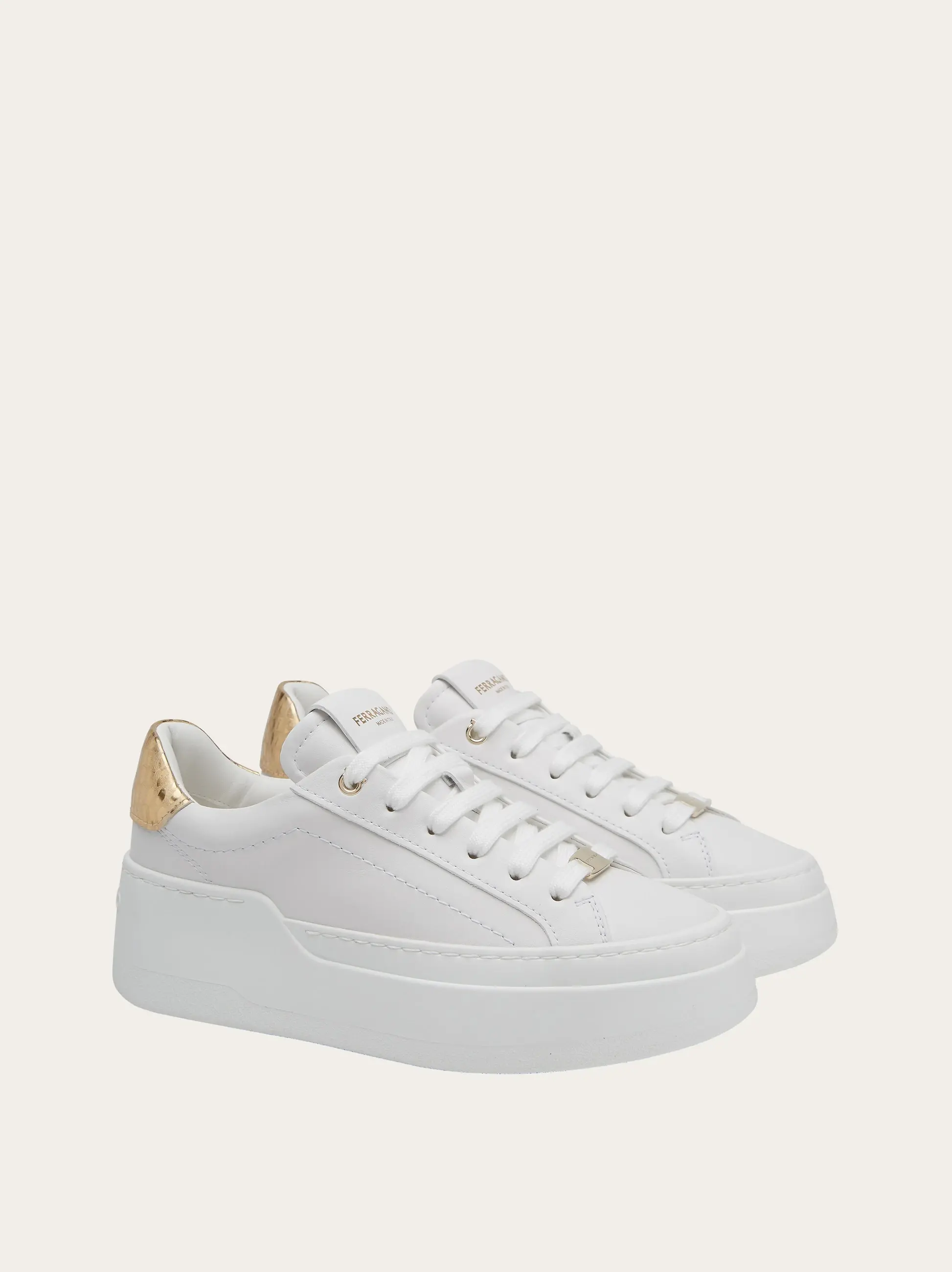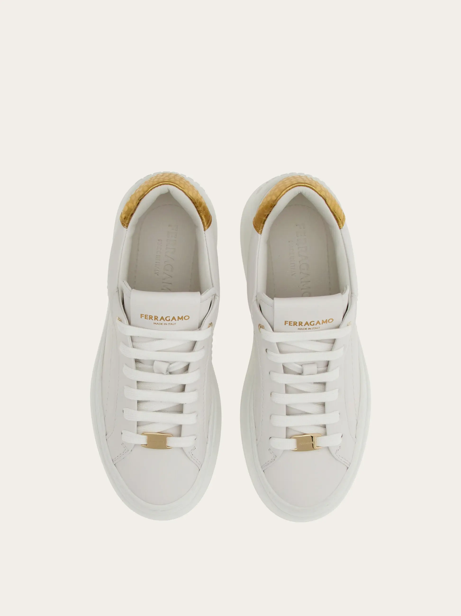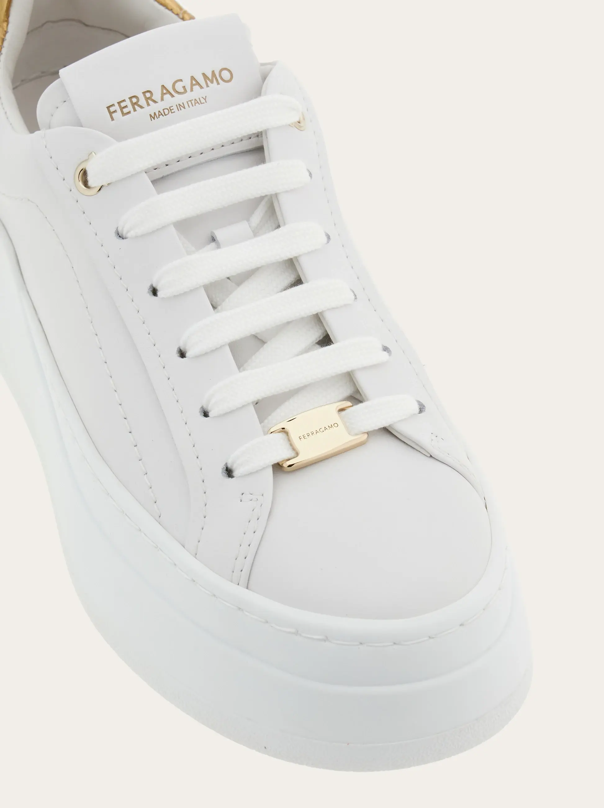 Nineties inspiration and clean lines define this new Ferragamo sneaker. The smooth calfskin upper features a reptile print strip with a golden finish for a touch of glam. A buckle runs through the laces, and the ultra-light rubber sole has a platform wedge with embossed signature. Leather insole.
