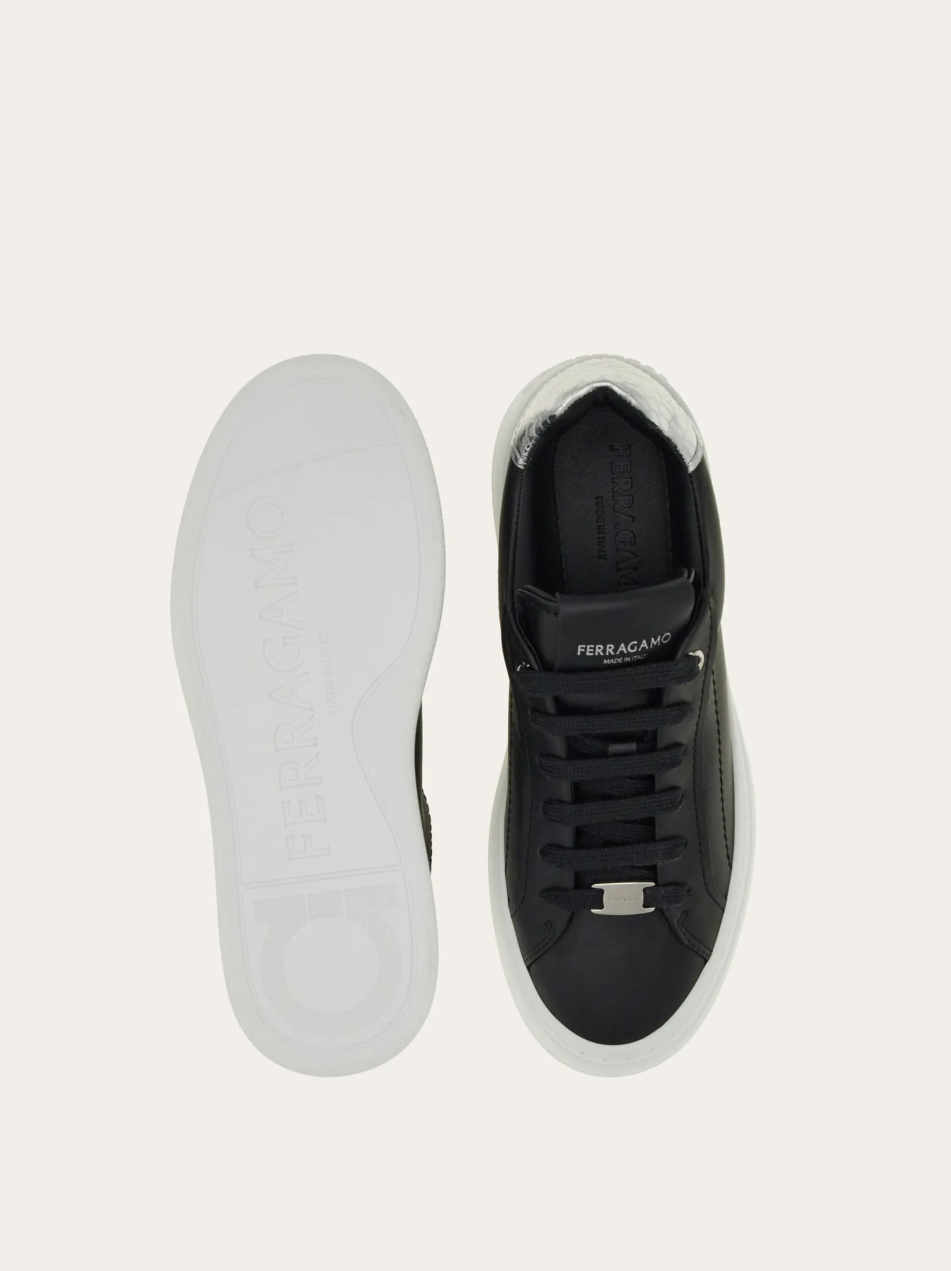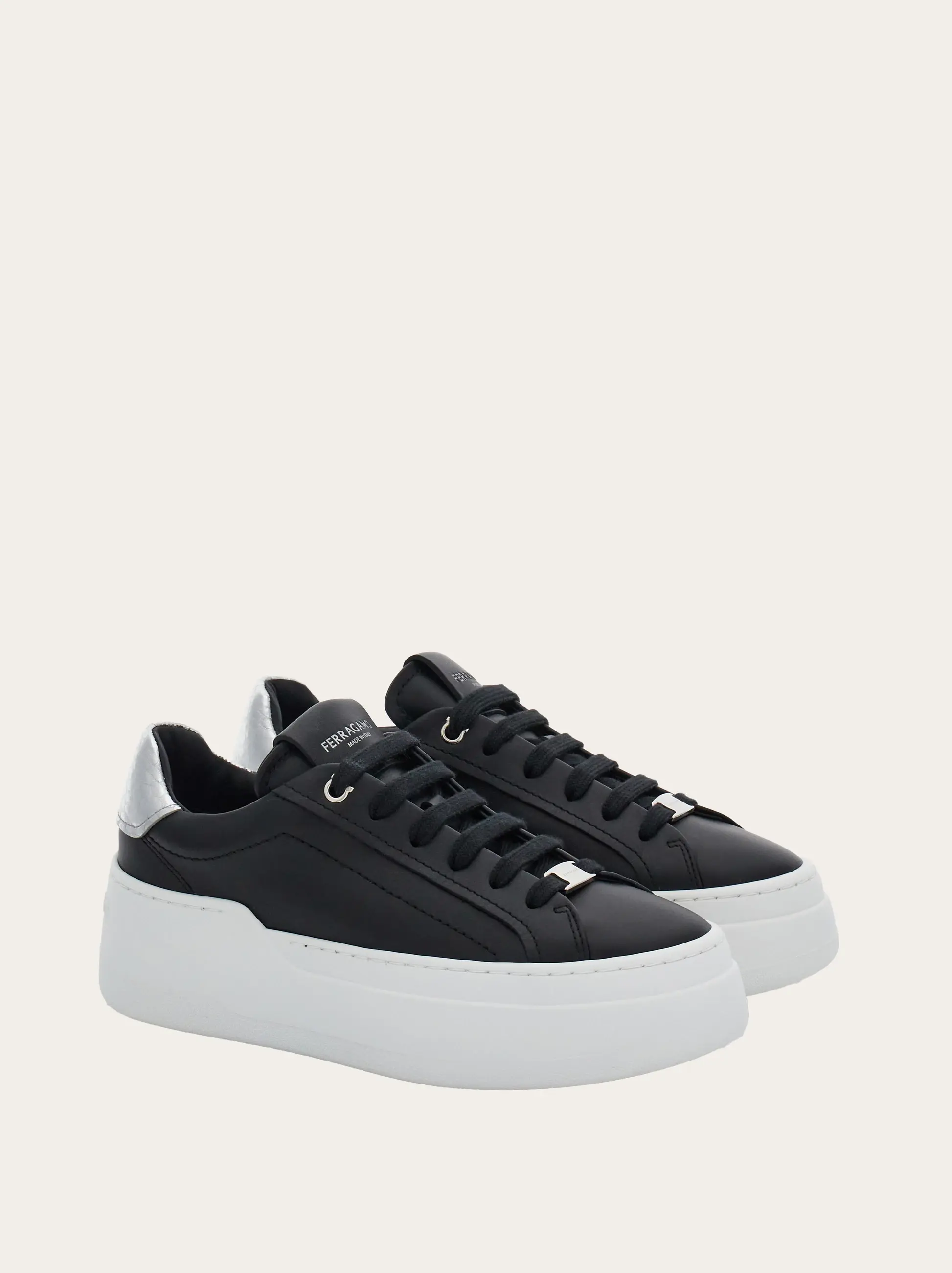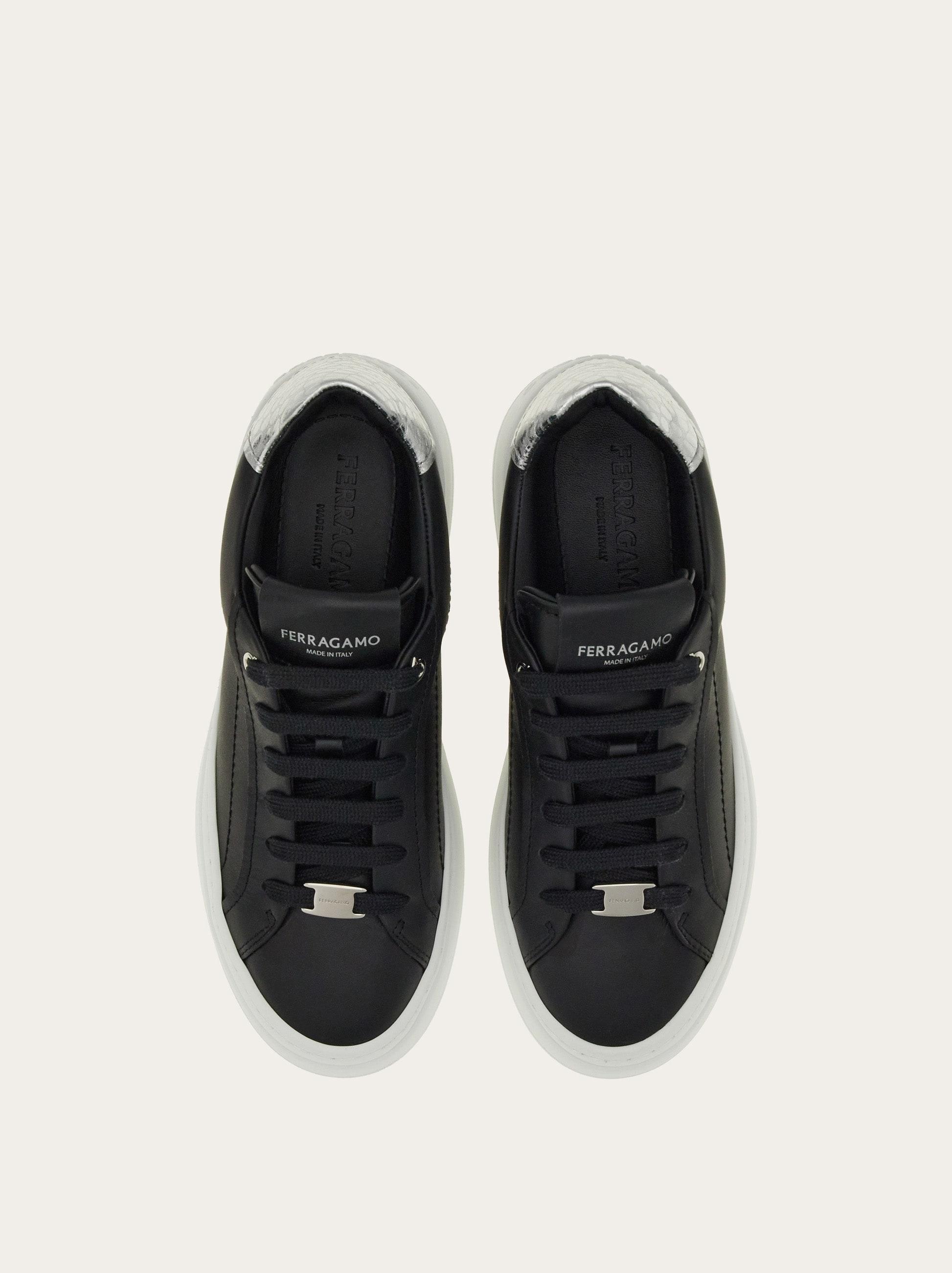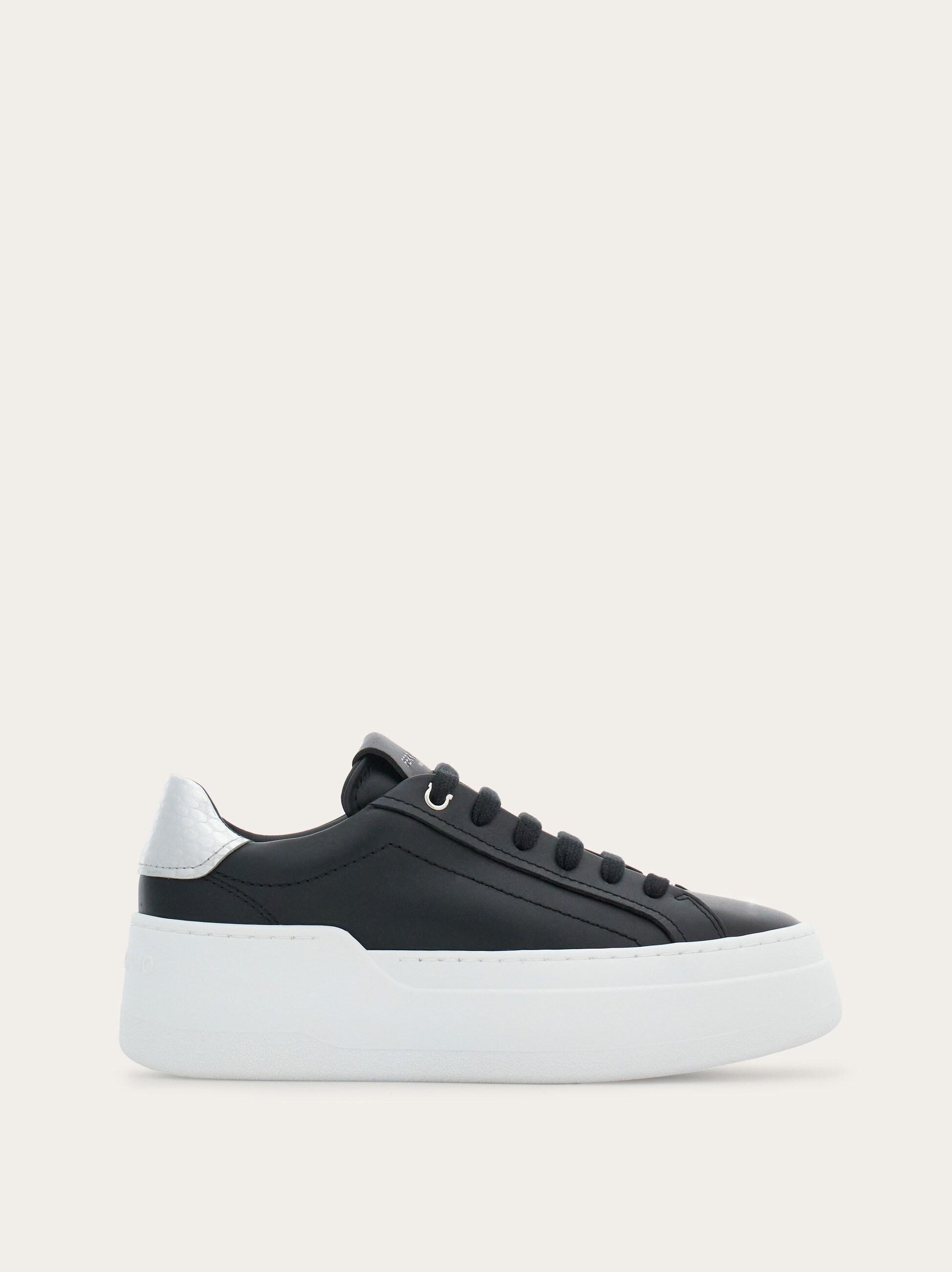 Nineties inspiration and clean lines define this new Ferragamo sneaker. The smooth calfskin upper features a reptile print strip with a golden finish for a touch of glam. A buckle runs through the laces, and the ultra-light rubber sole has a platform wedge with embossed signature. Leather insole.