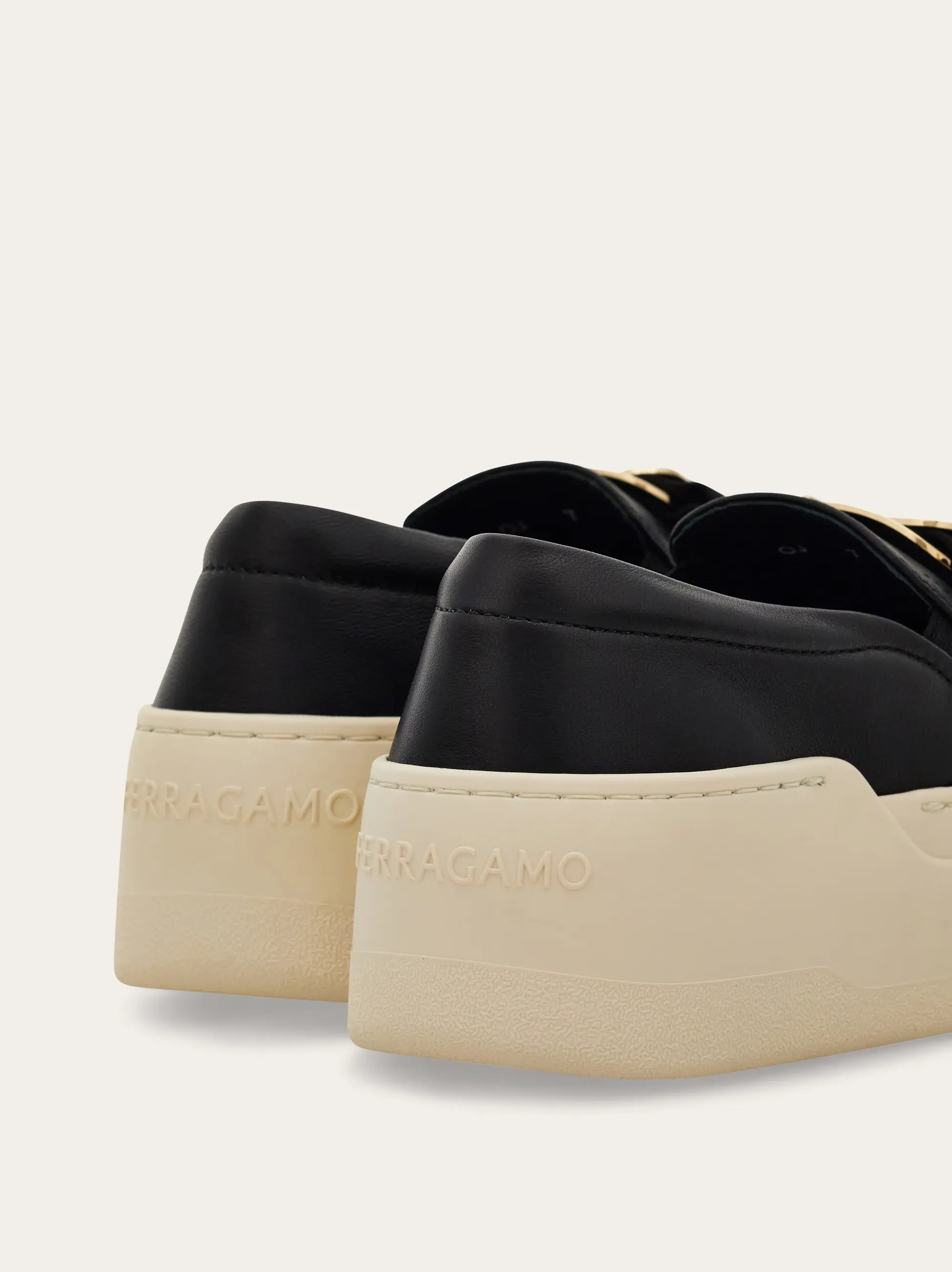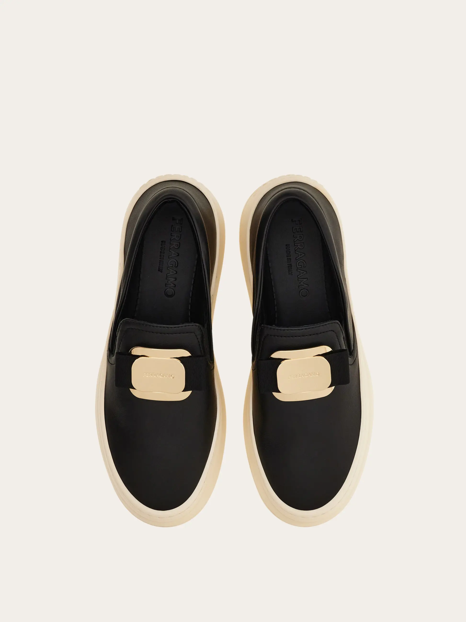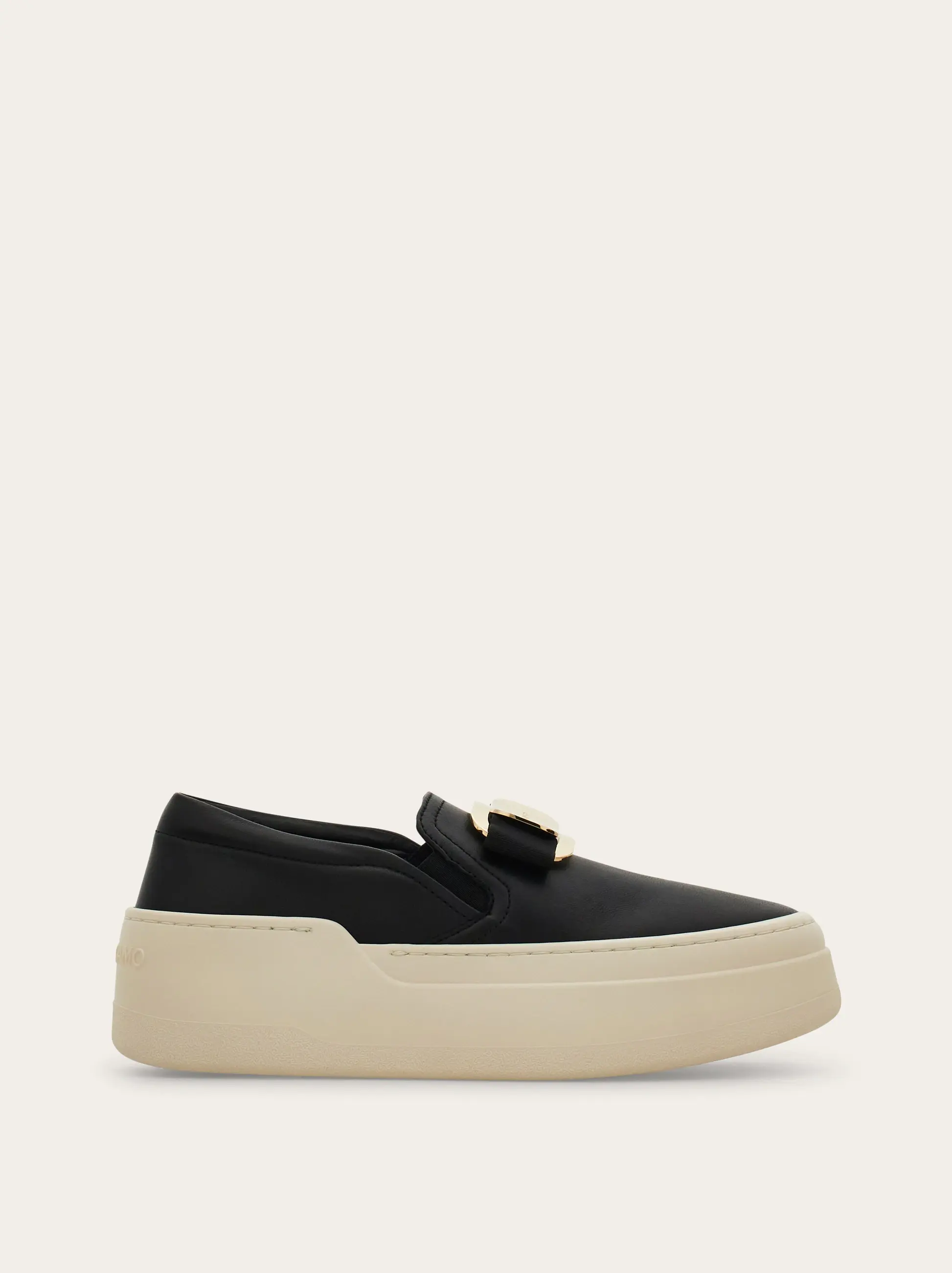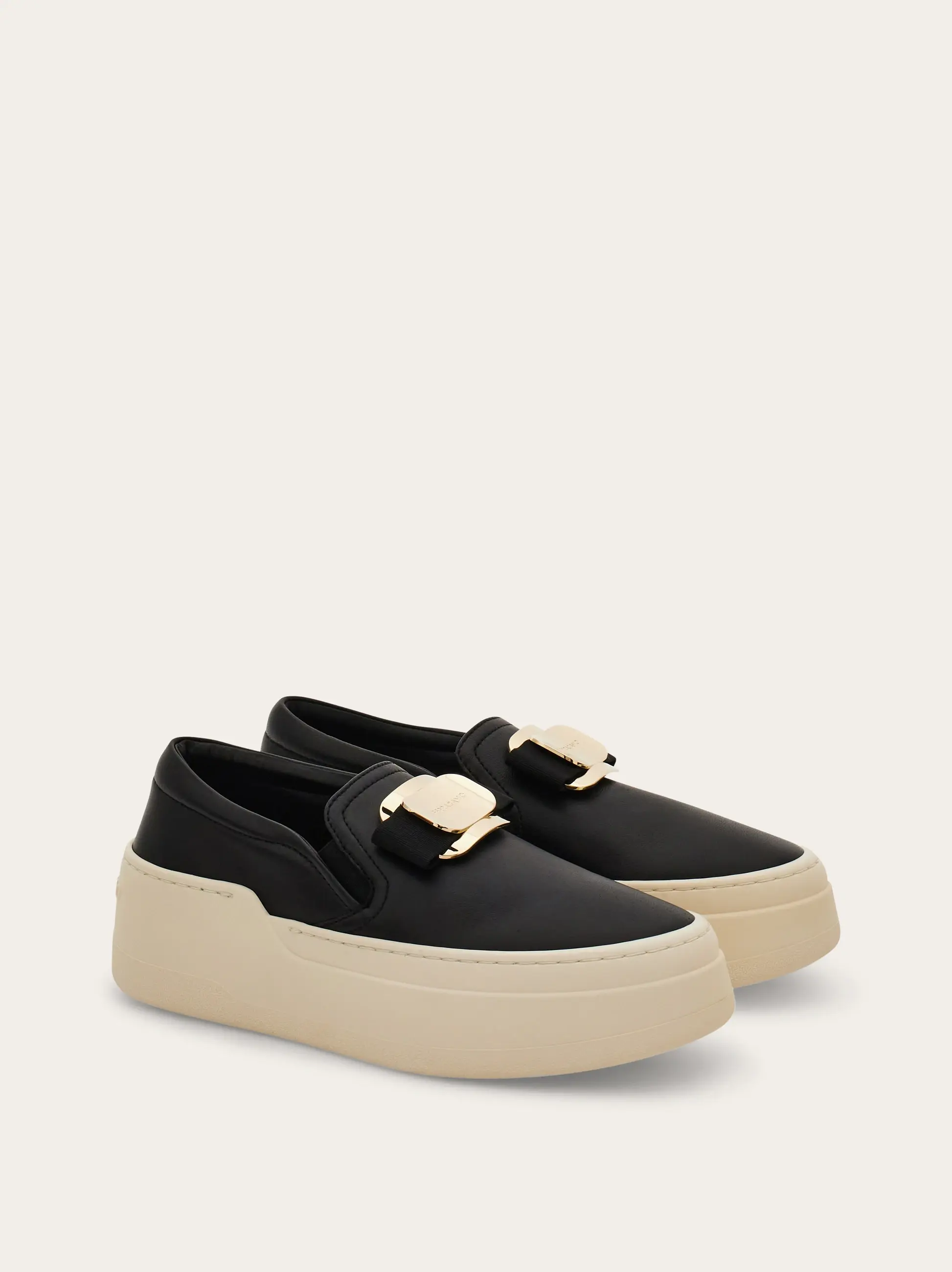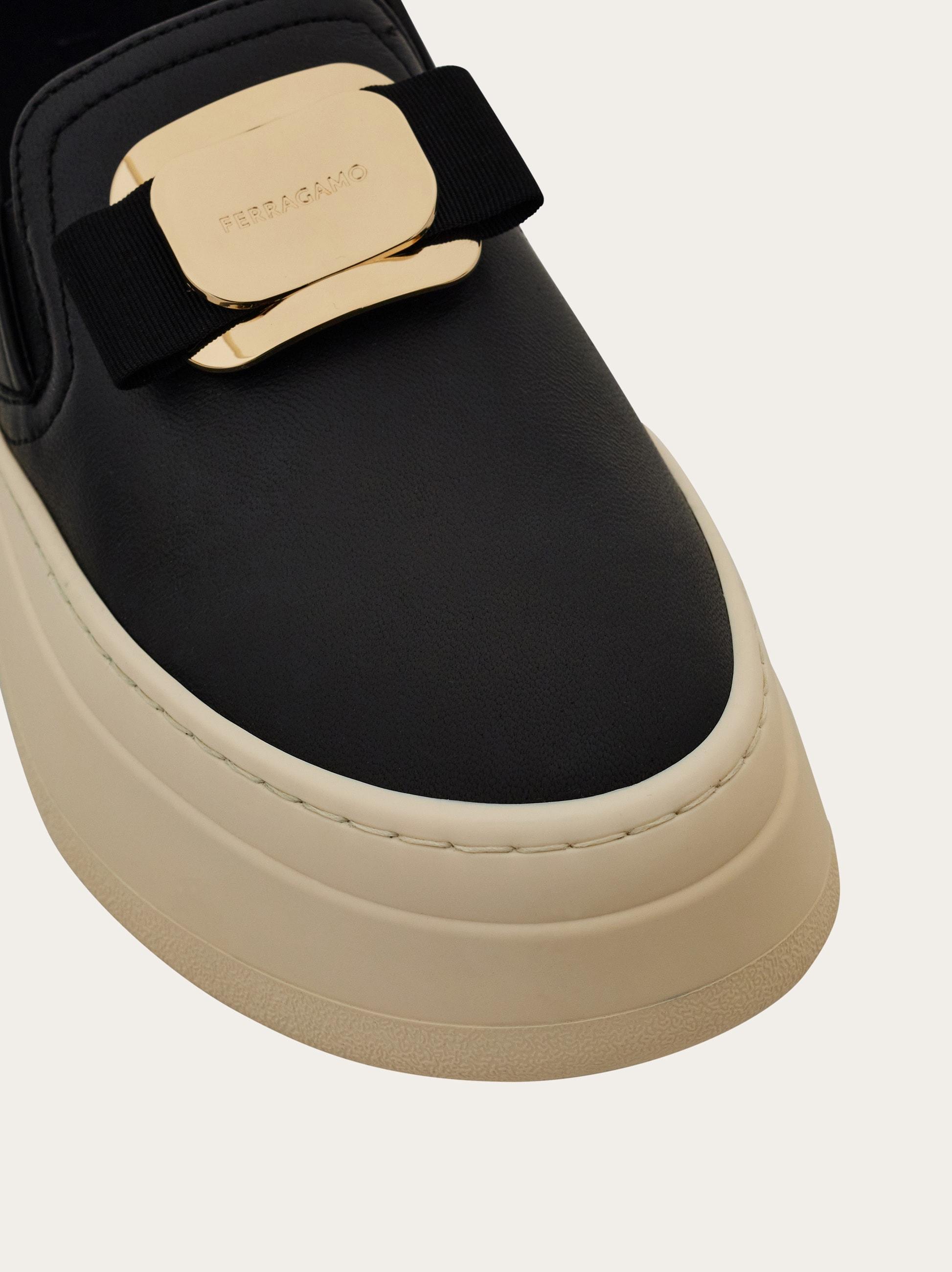 The slip-on sneaker is a versatile and stylish option for casual occasions. The nappa leather upper is soft and adorned with a new golden Vara buckle, featuring an on-tone grosgrain bow for a feminine touch. Elastic bands and padding along the neckline provide a comfortable fit. The rubber platform sole is lightweight and has custom detailing.