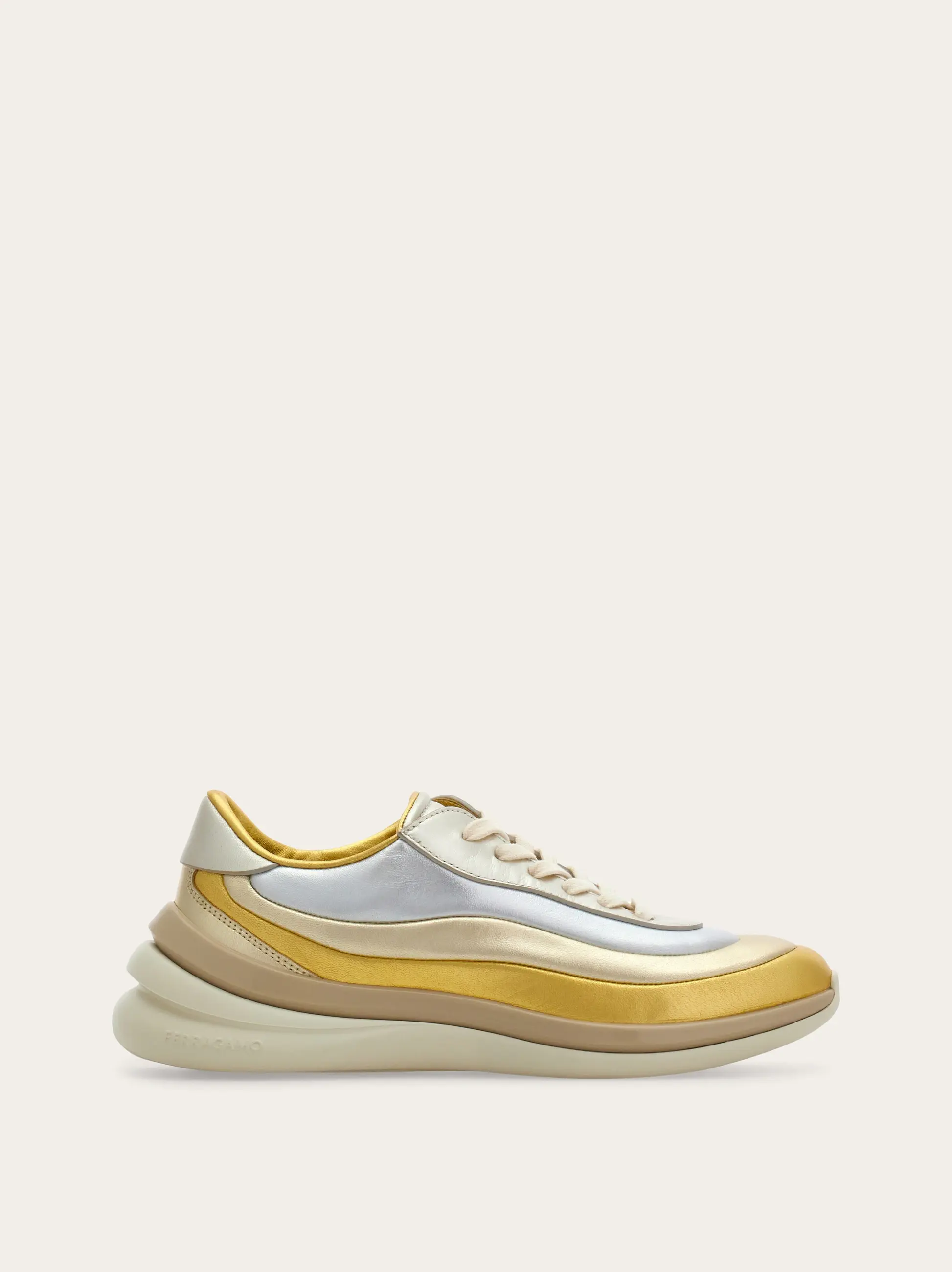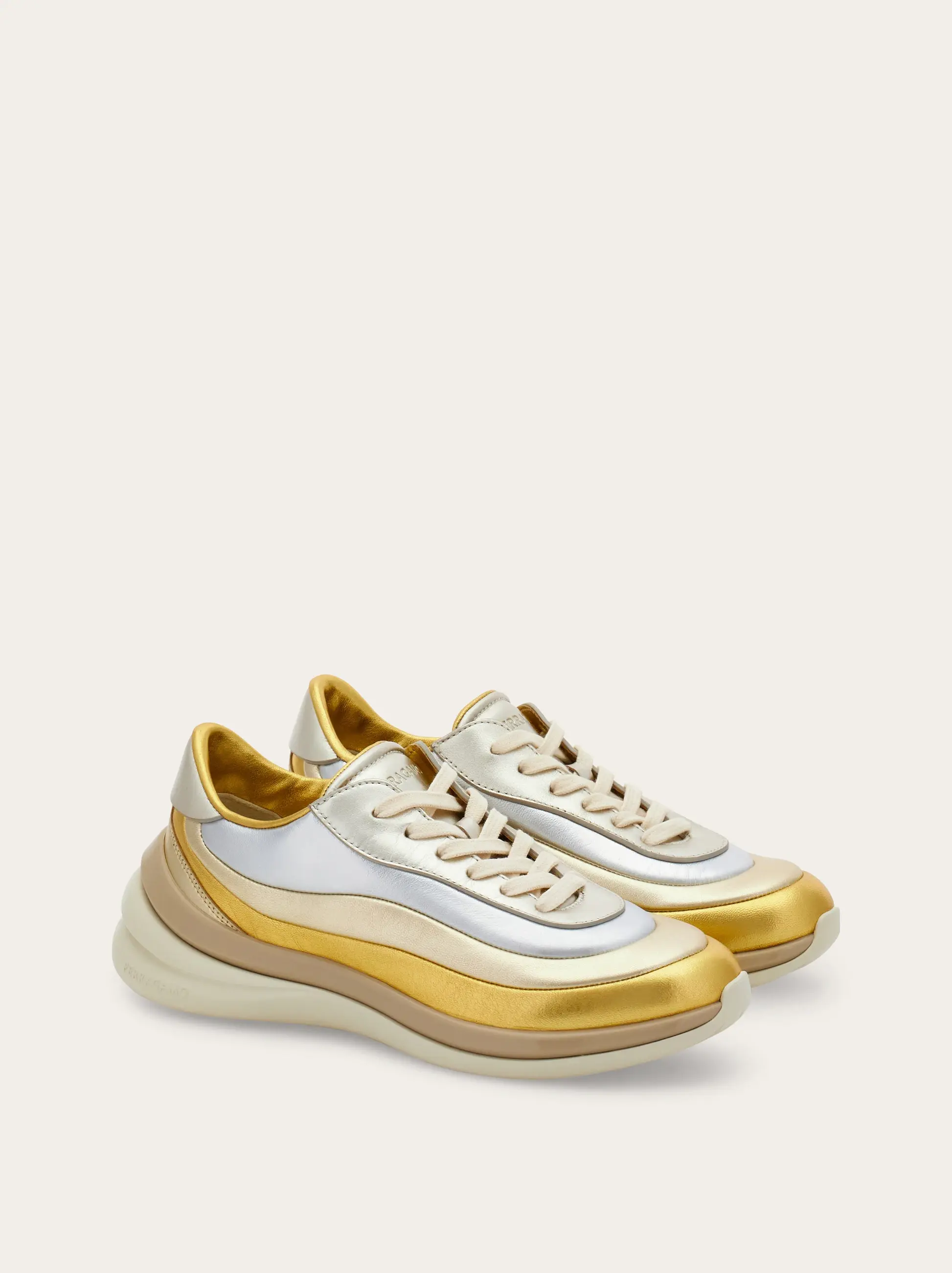 A savvy mix of an iconic nineties silhouette and the unmistakable Rainbow shoe, this new nappa sneaker has a street style outline with artistic details. The gradient of wavy colors stripes is set on an ultra-light rubber sole with custom tread.