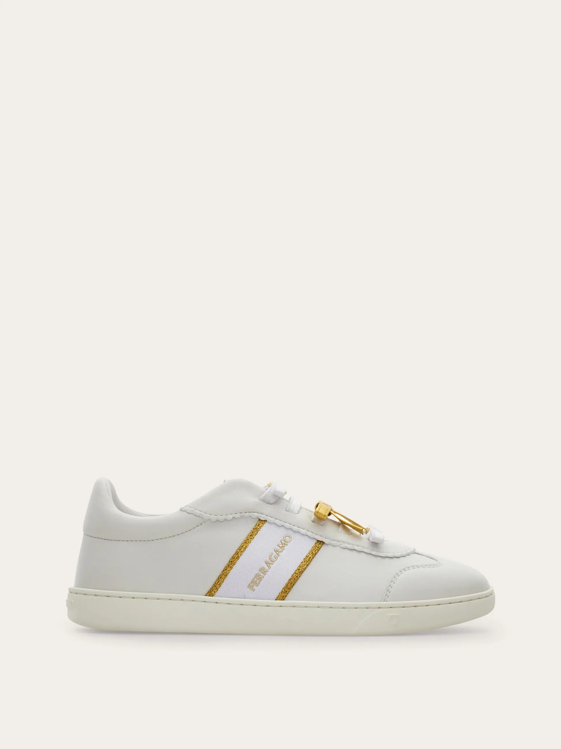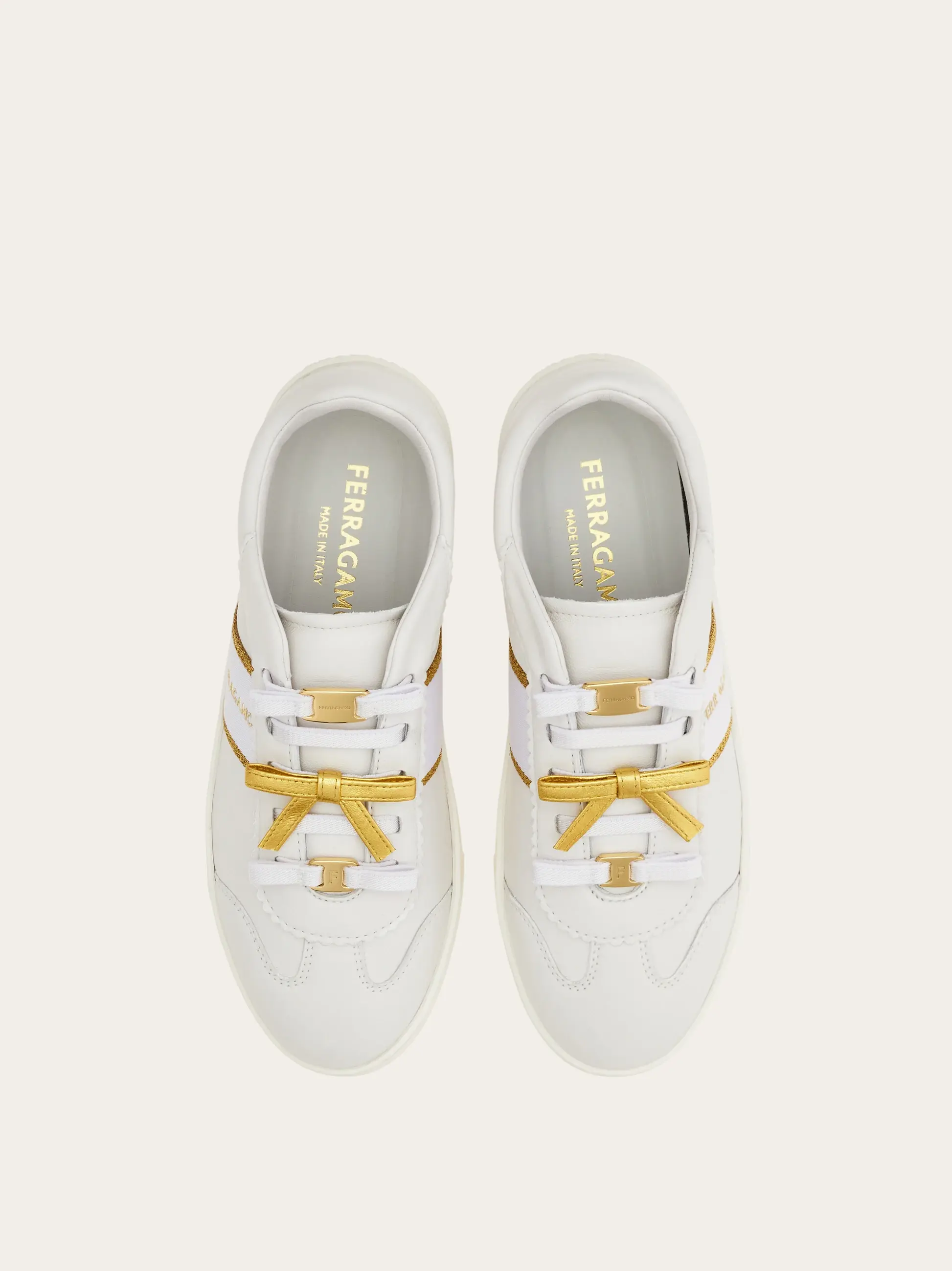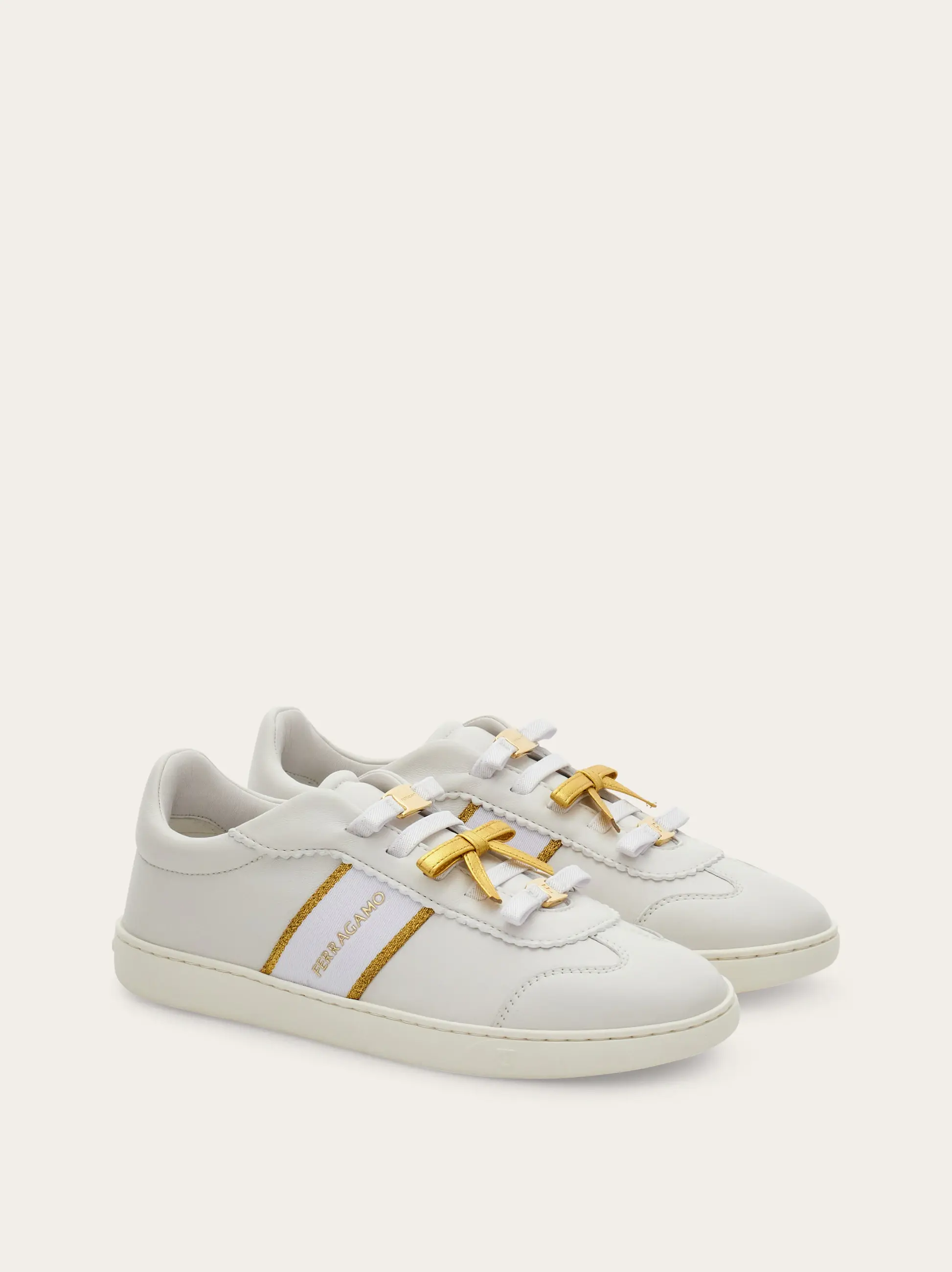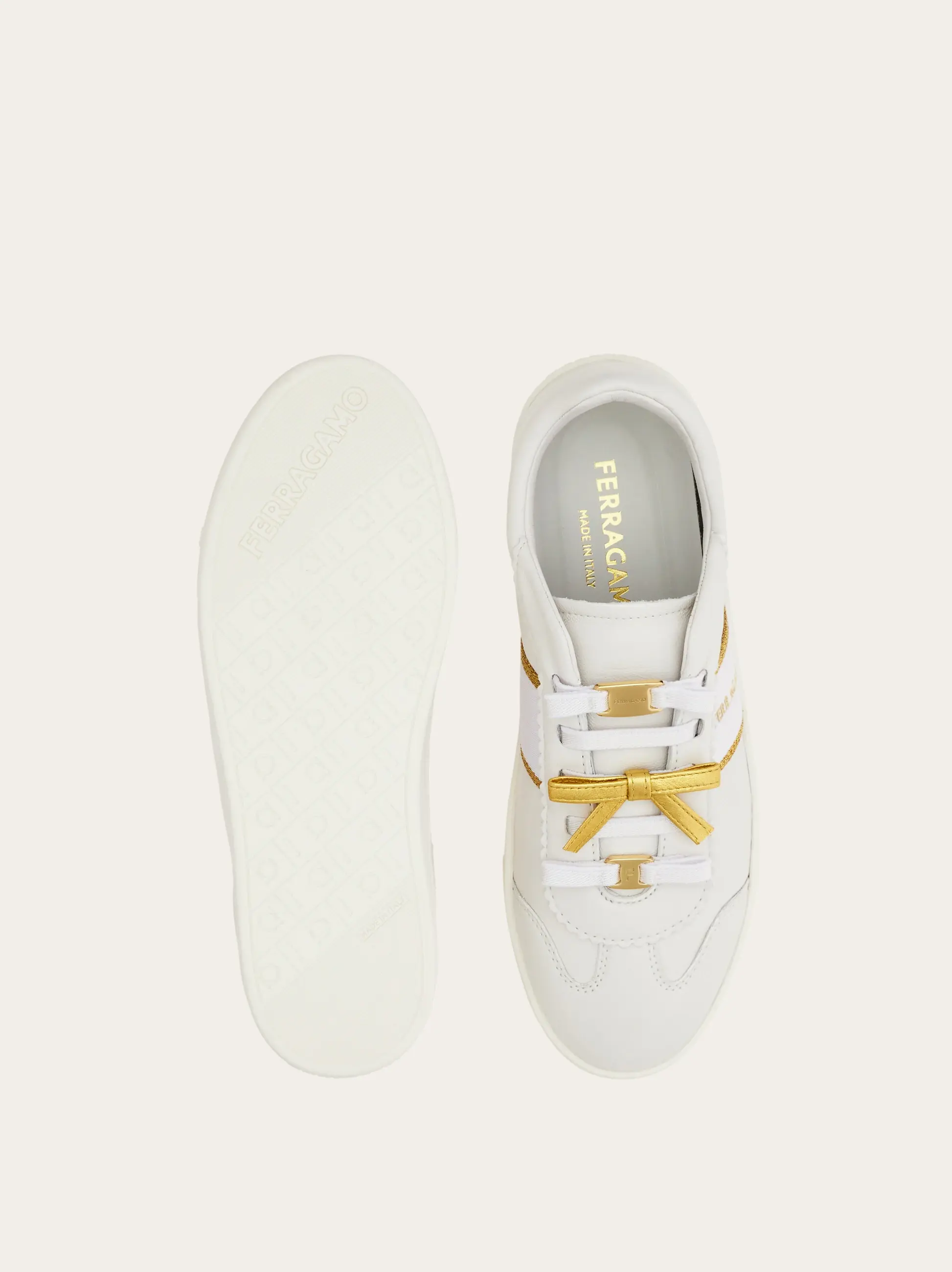 The contrasting mini bow confirms the ladylike appeal of this classic sneaker. Modelled on a street style favorite, the nappa leather upper is detailed with a bold logo at the side of the lacing, which is bedecked with tonal bows and mini Ferragamo buckles. Ultra-light custom rubber sole.