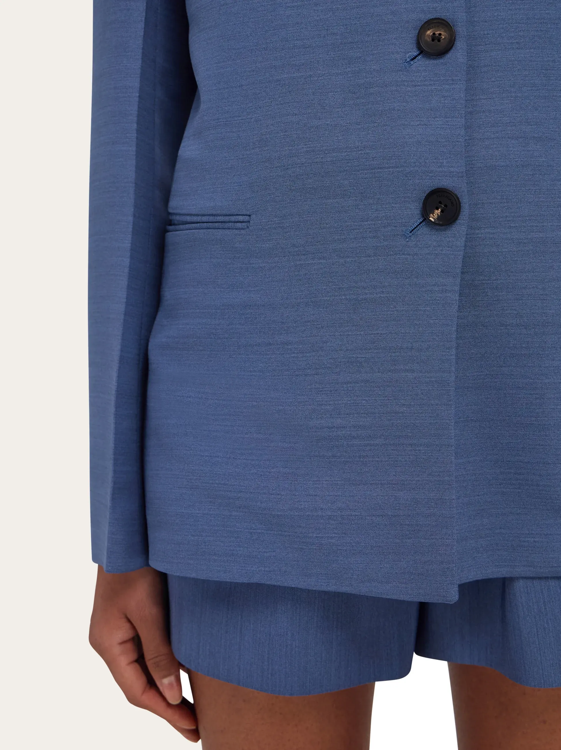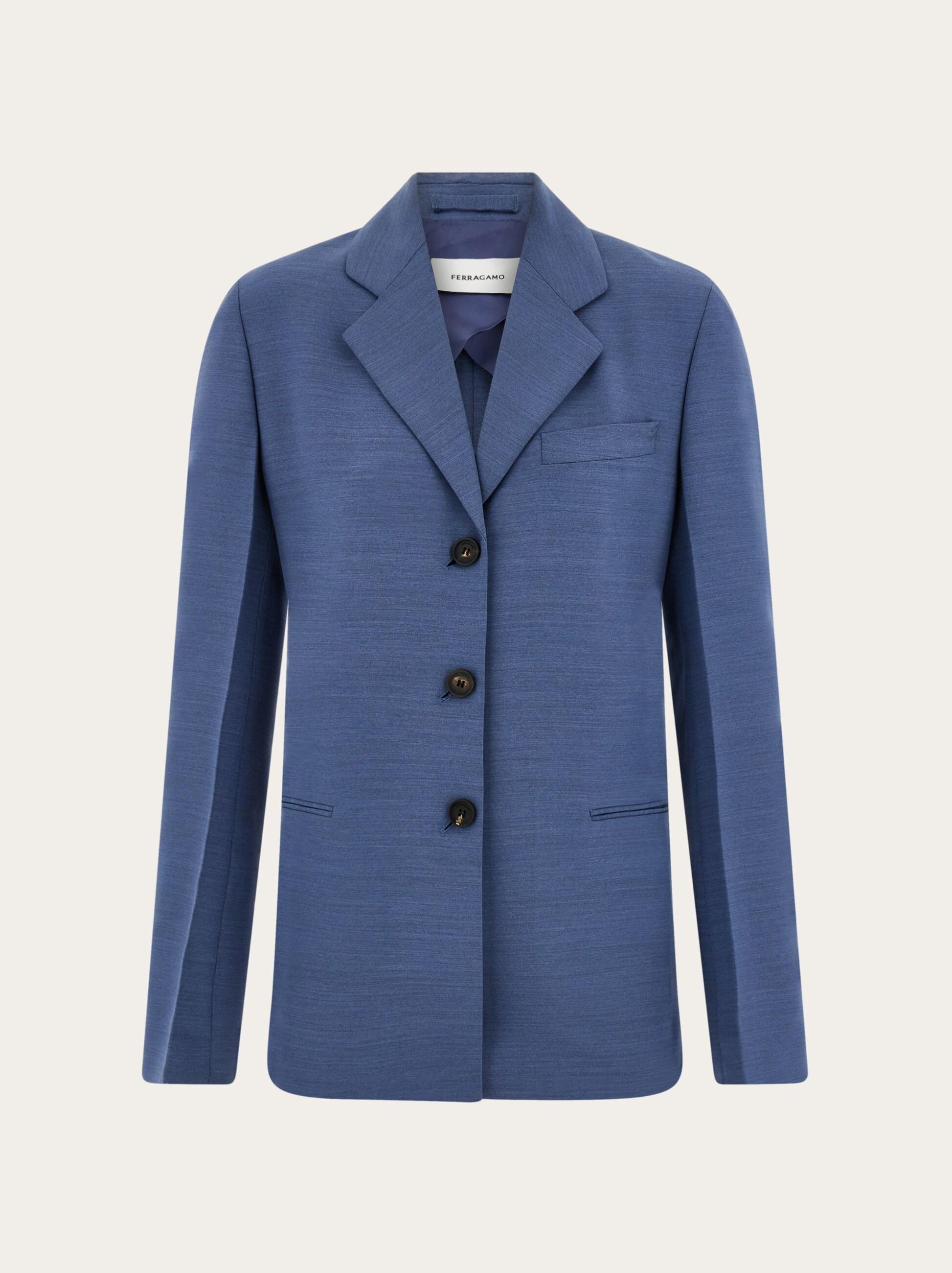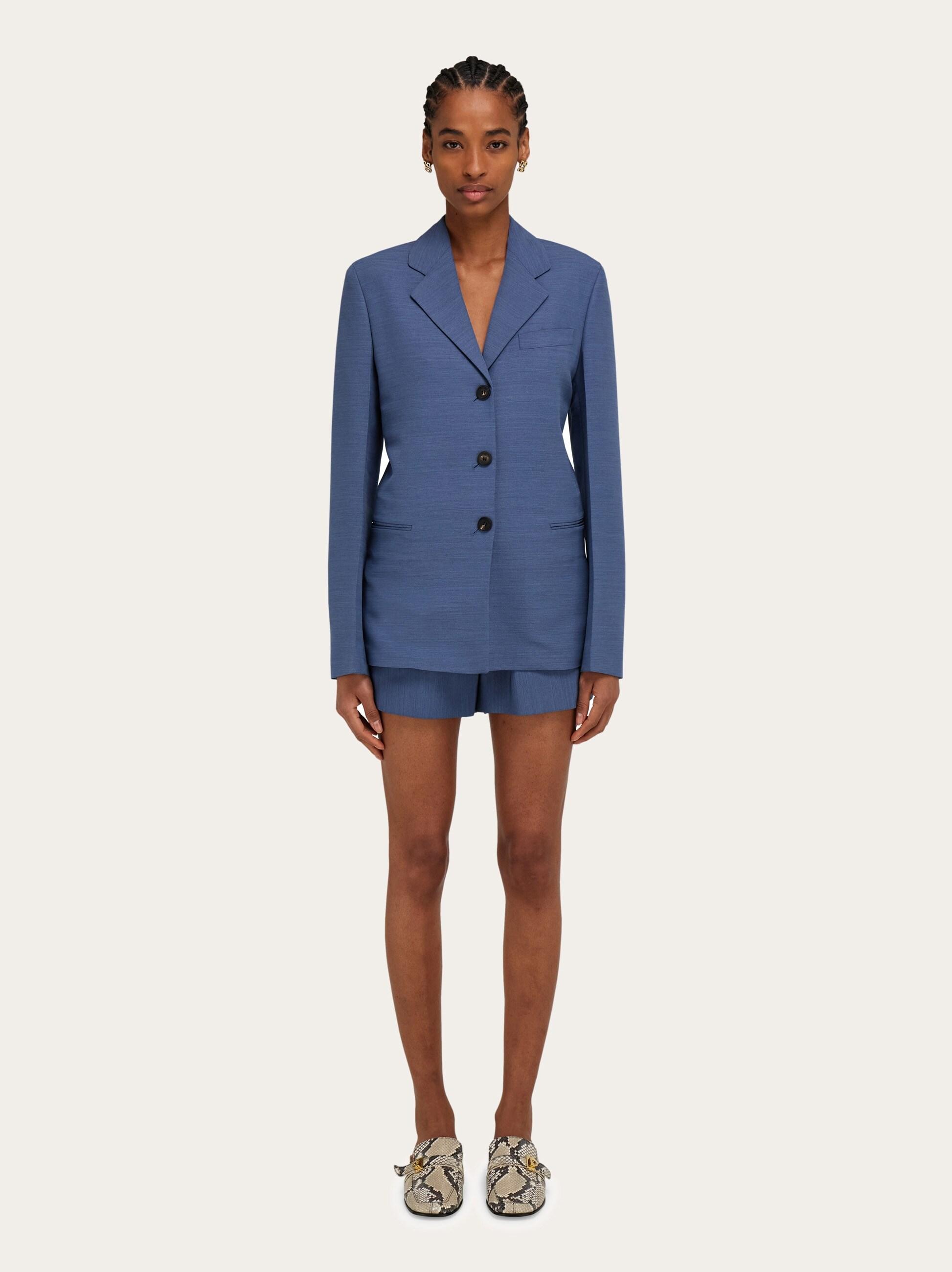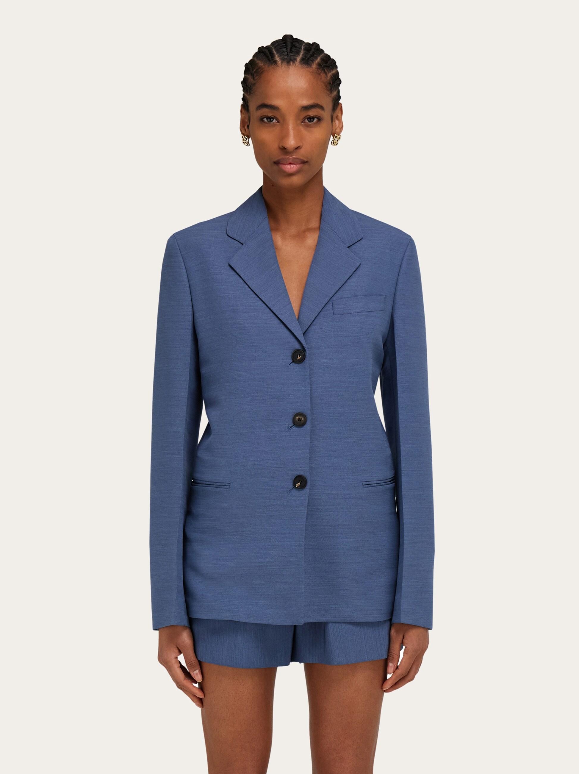 Contemporary iteration of the single breasted blazer in a high-end key. Made of wool faille with a fine horizontal fleck, the delicate yet stiff fabric has an impeccable drape. Signature diagonal eyelets add a custom touch to the three buttons along the front. Pressed pleats run the length of the sleeves, and strategic darts shape the waist of this lined garment.
