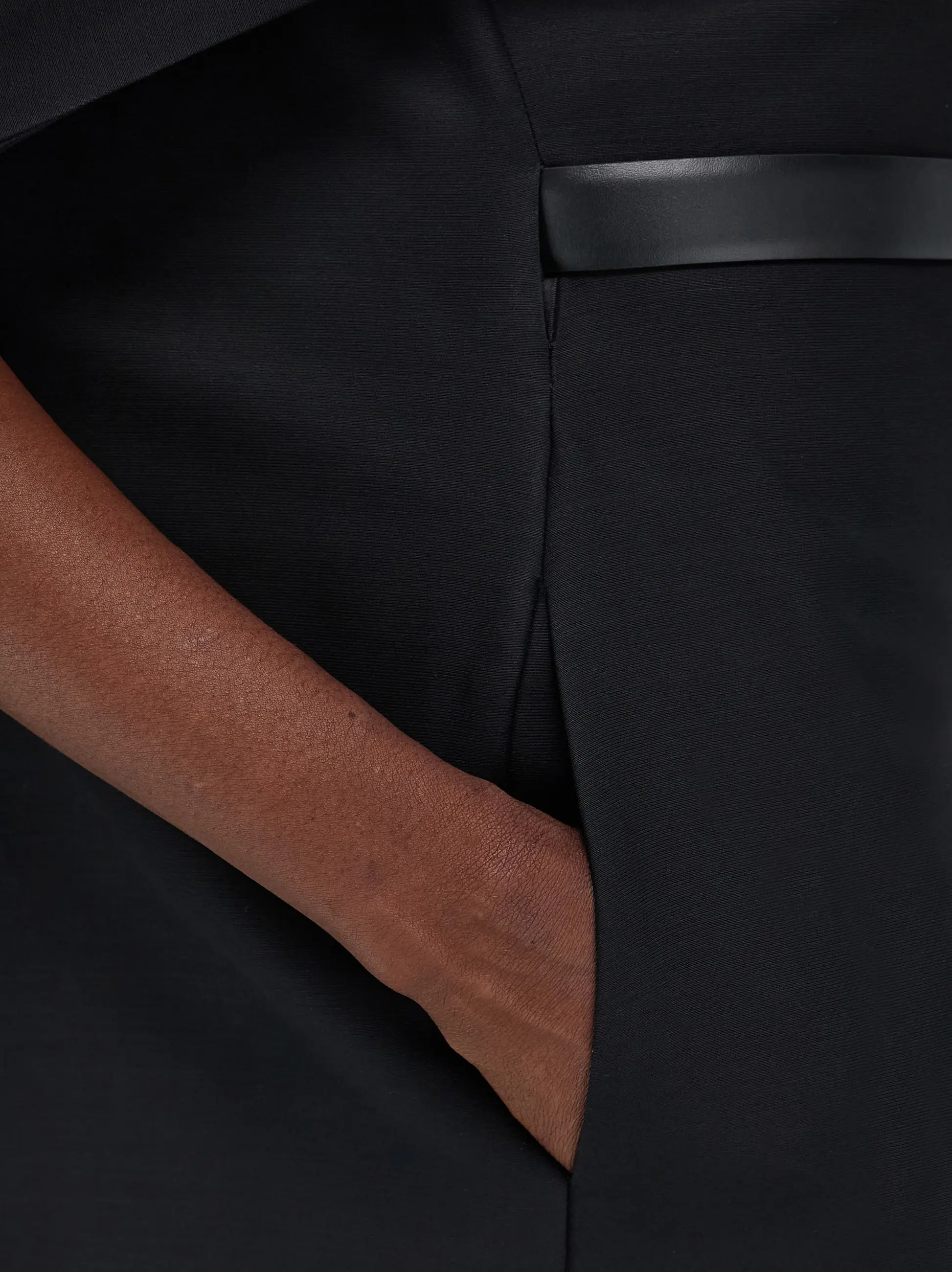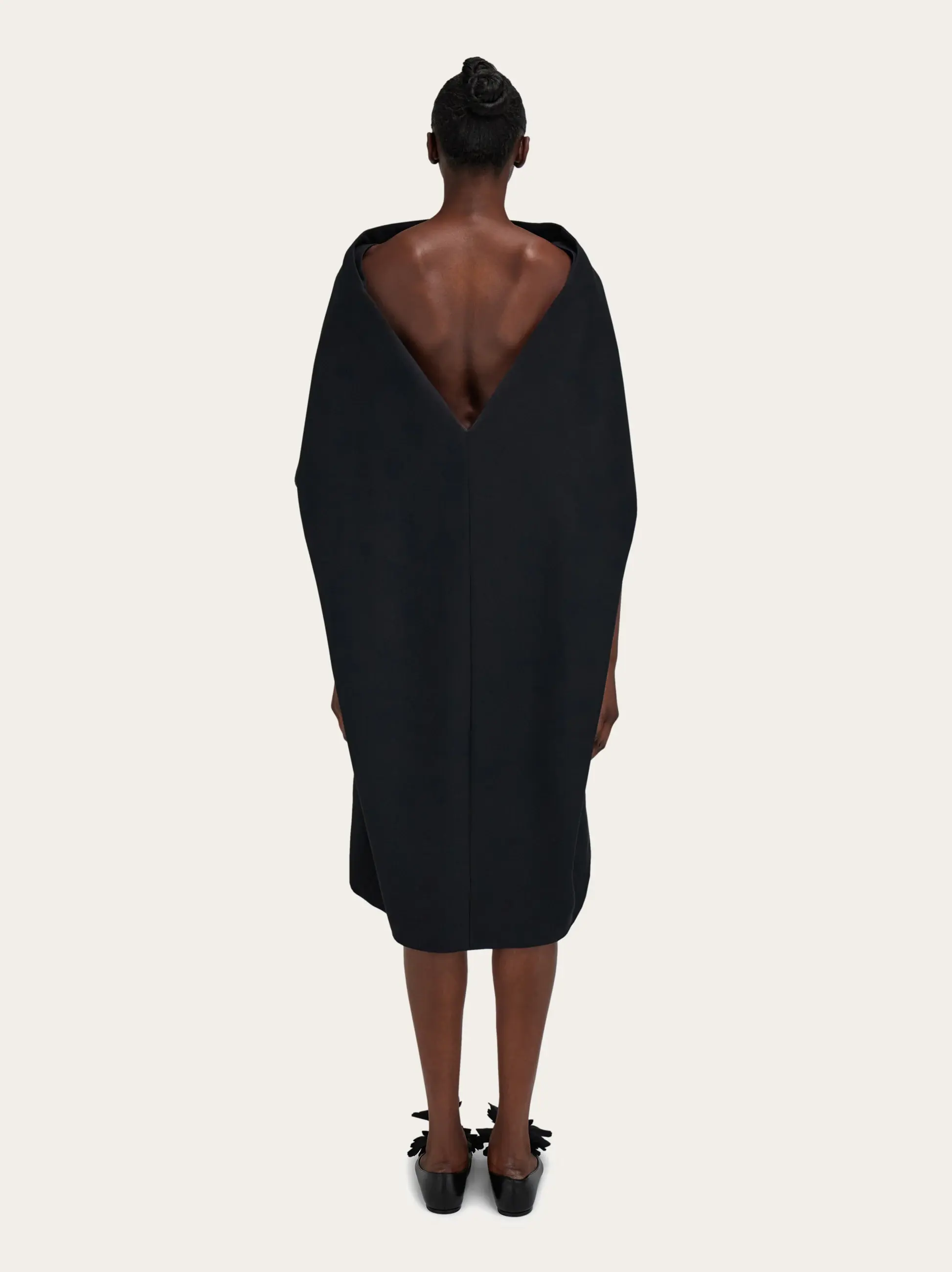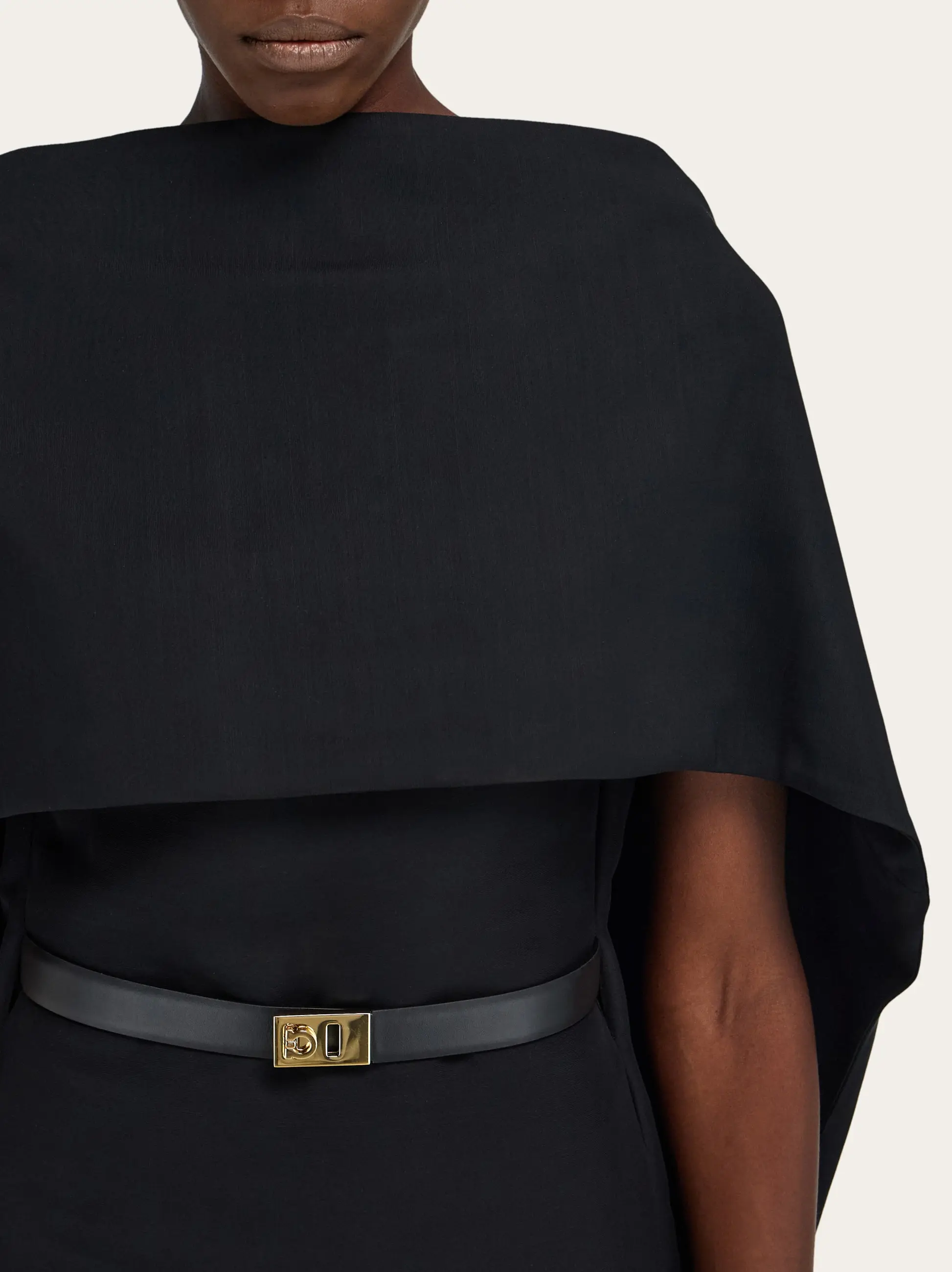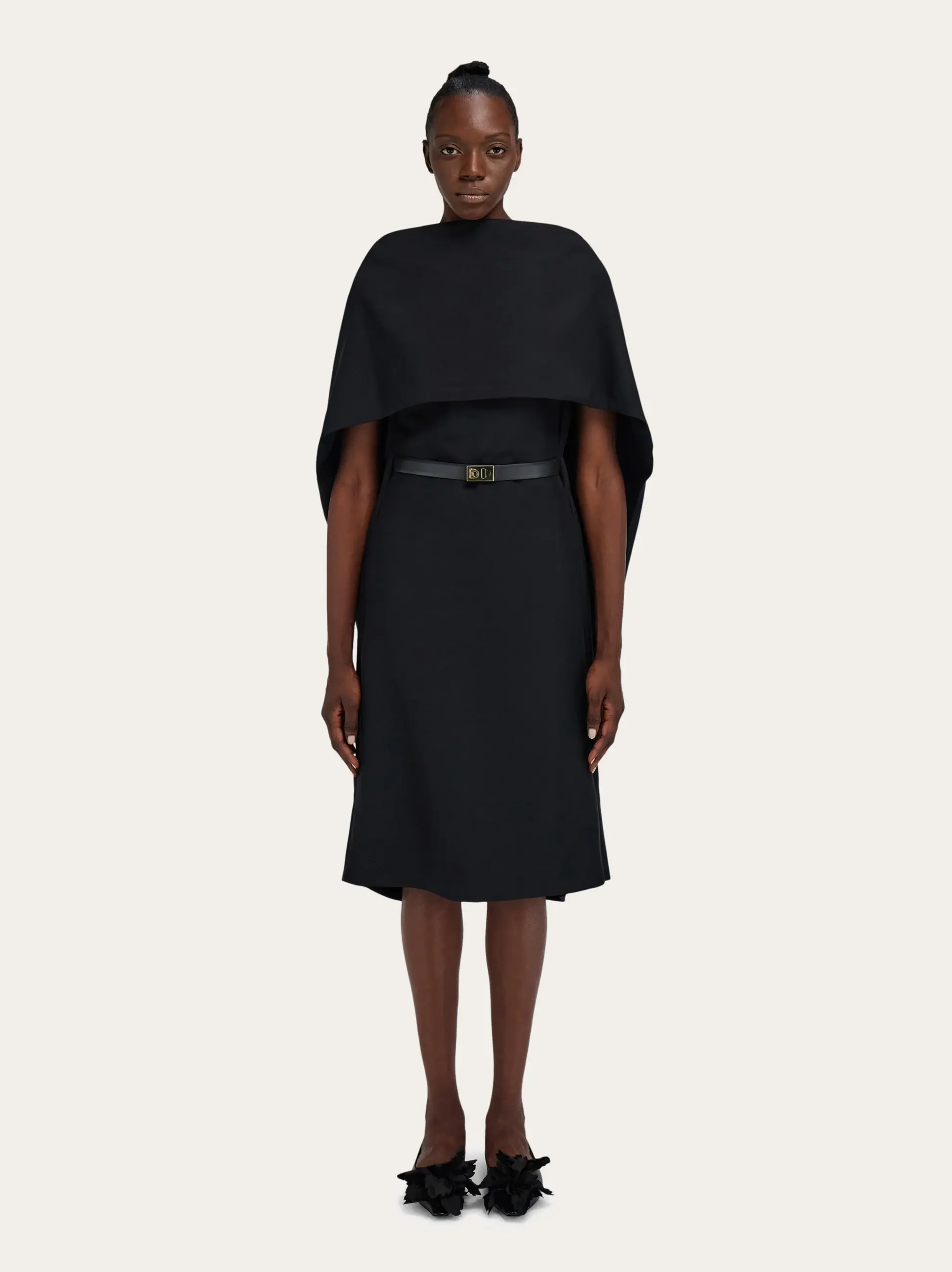 A sophisticated blend of wool and viscose faille is used to bring this belted dress to life. The strong silhouette features an integrated shawl across the front which melts into a deep V-cut at the back. The edges of the cape softly billow over the midi length dress which is cinched at the waist and detailed with a golden Hug buckle.