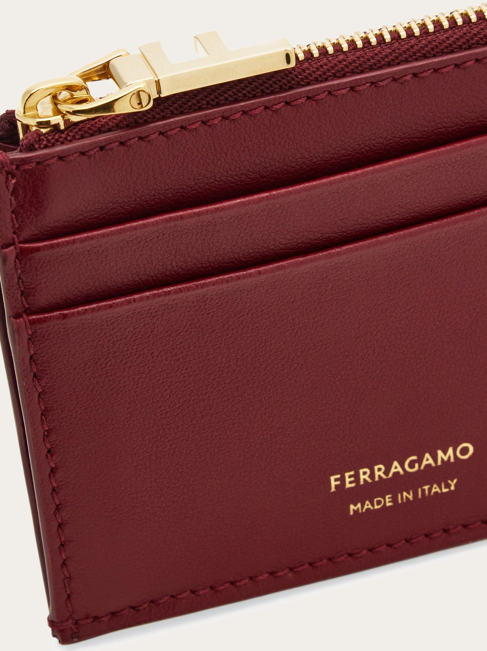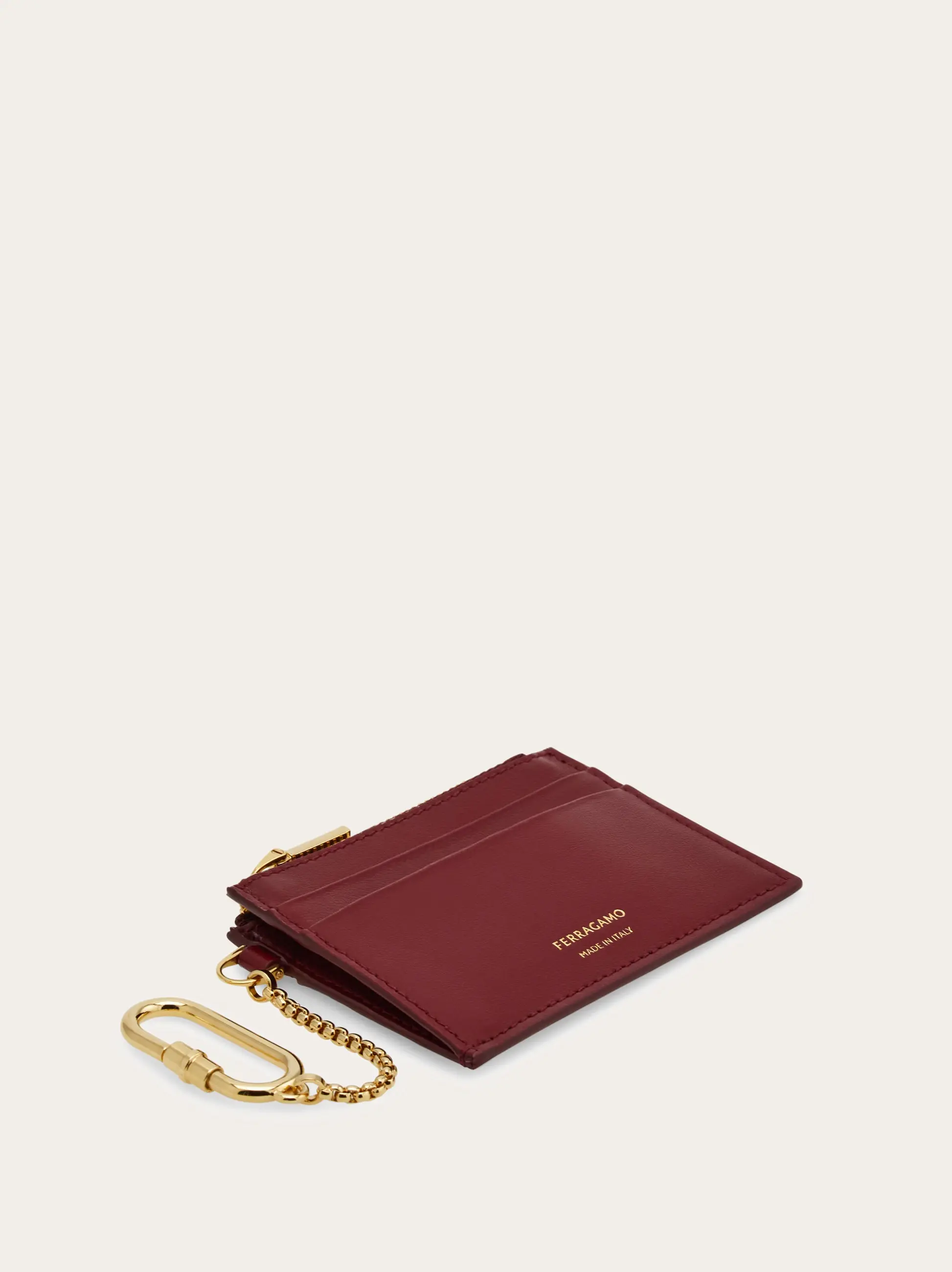 A hybrid model for added functionality, this card holder features slots and a zippered pocket combined with a side chain with snap hook perfect for attaching keys. Hot stamped signature on front.